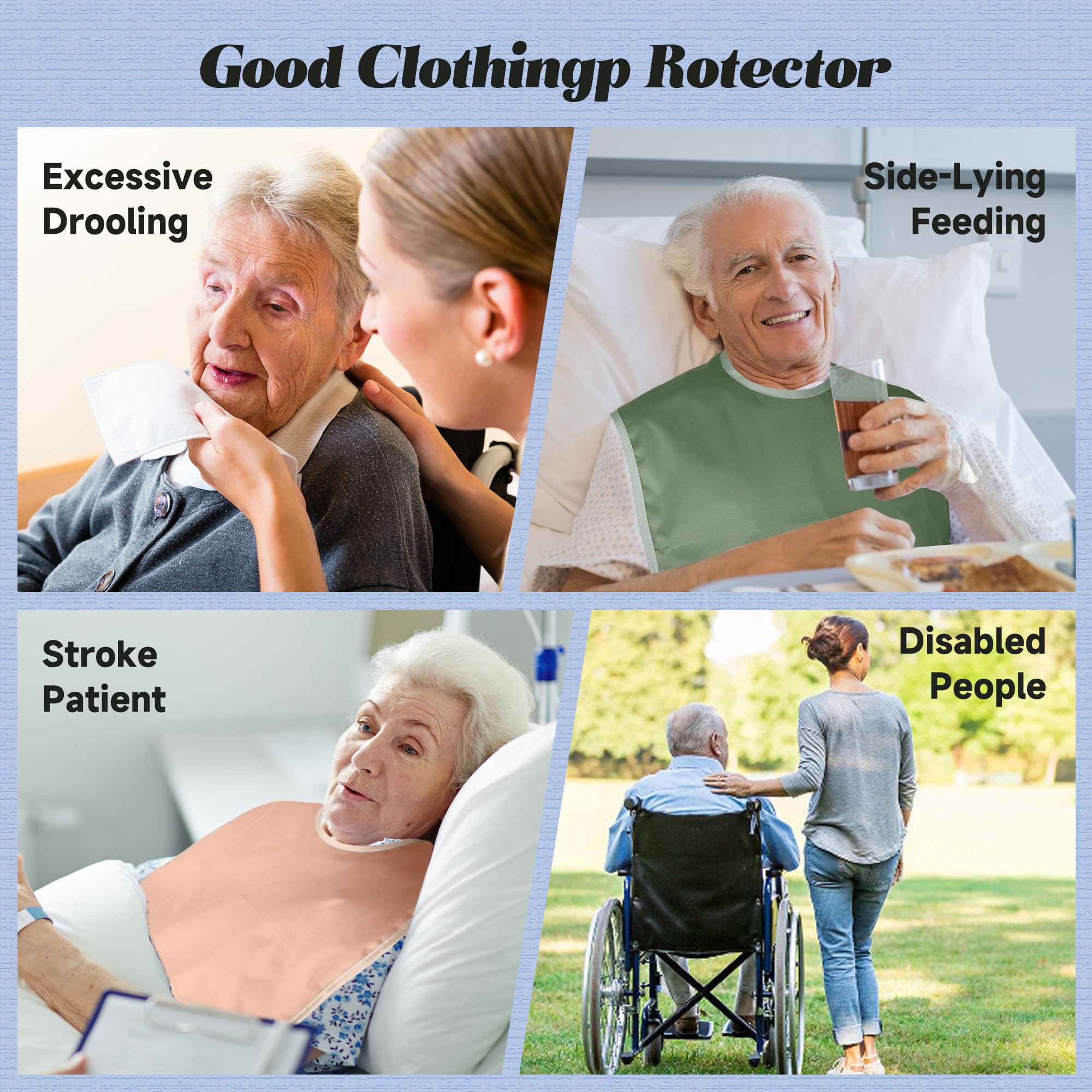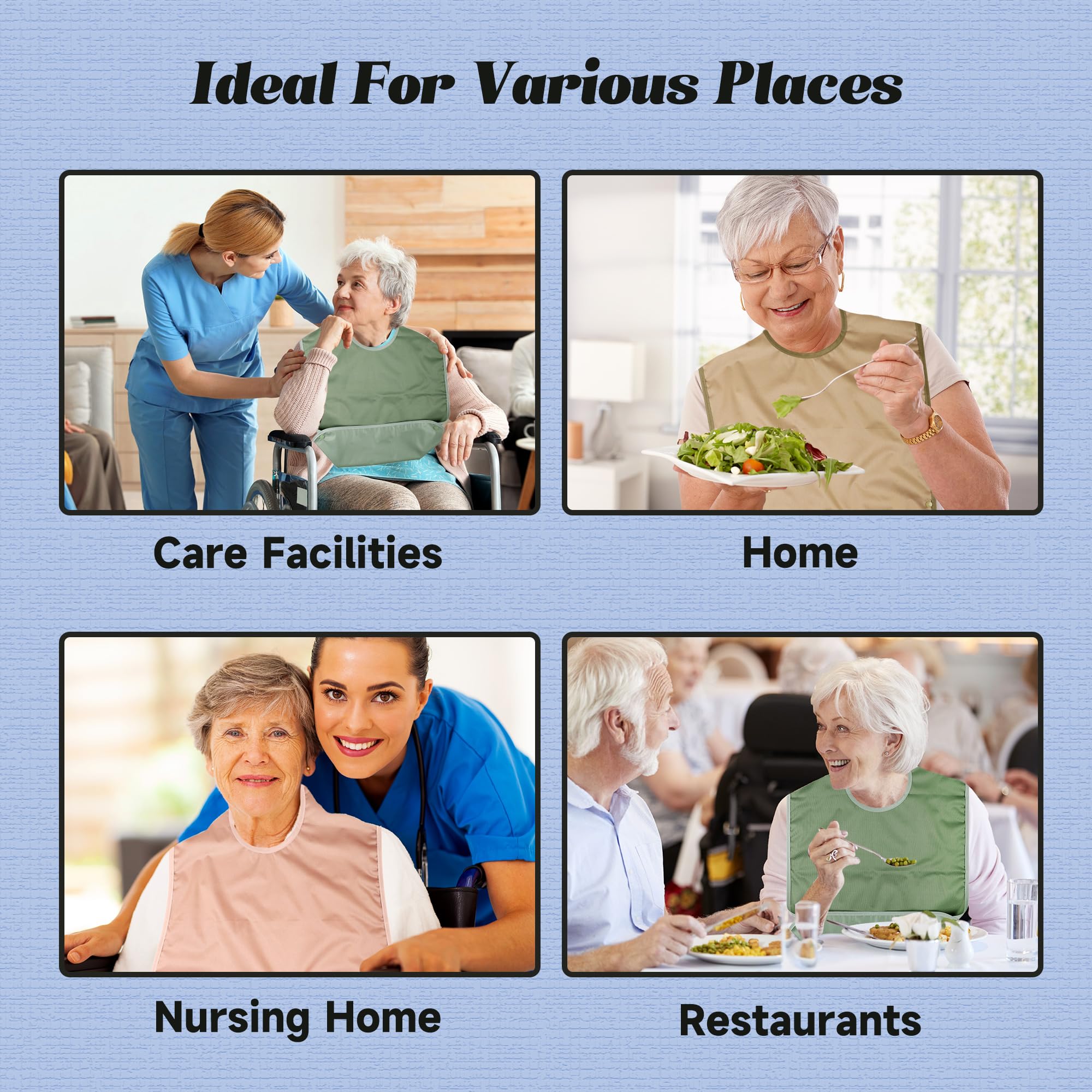 Pedobi bibs for adults for eating are adjustable, waterproof, reusable, and washable, ensuring that the elderly user keeps clothes neat and tidy during meal times or other activities
