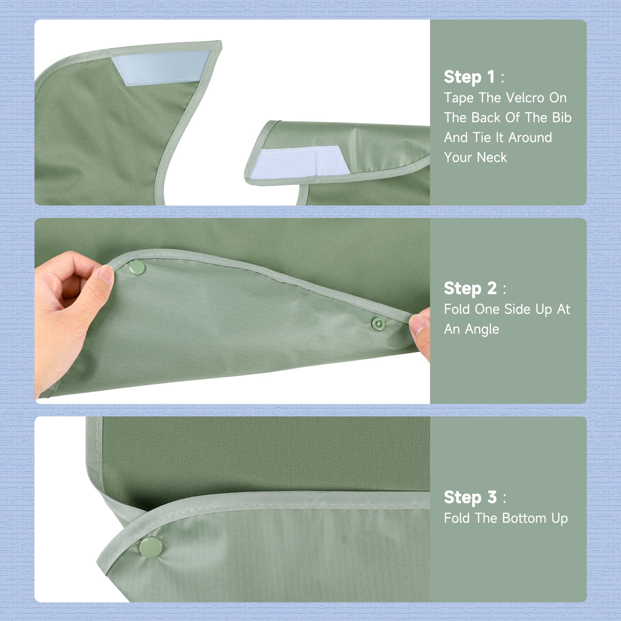 Adult Bibs for Eating 3 Pack: Pedobi bibs for adults for eating are adjustable, waterproof, reusable, and washable, ensuring that the elderly user keeps clothes neat and tidy during meal times or other activities