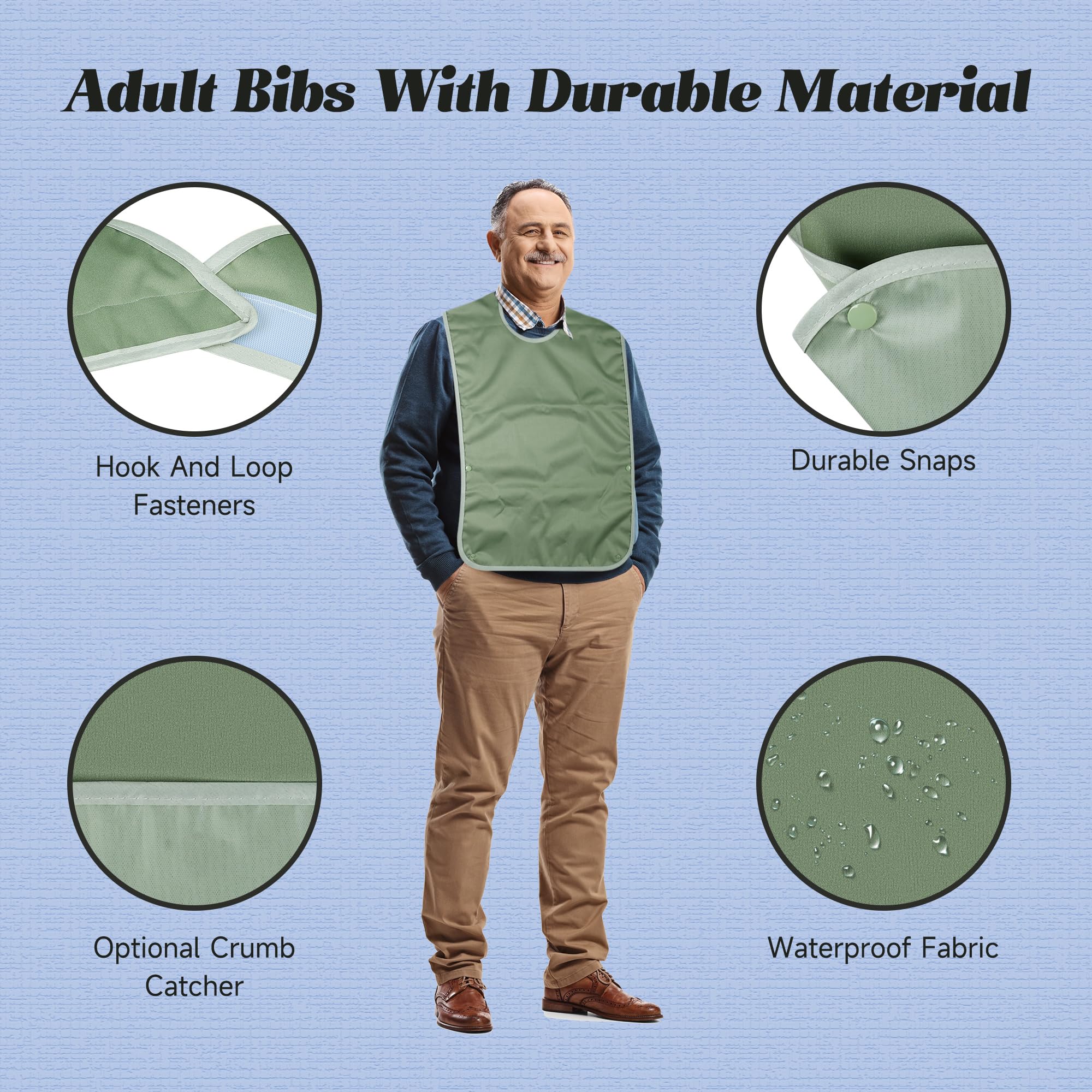 High-Quality Lining: Bibs for men adults with waterproof lining isolate liquids and hot drinks to prevent burns. It catch spills and drool at mealtimes, keeping your clothes clean and dry, free of stains, while maintaining an attractive appearance