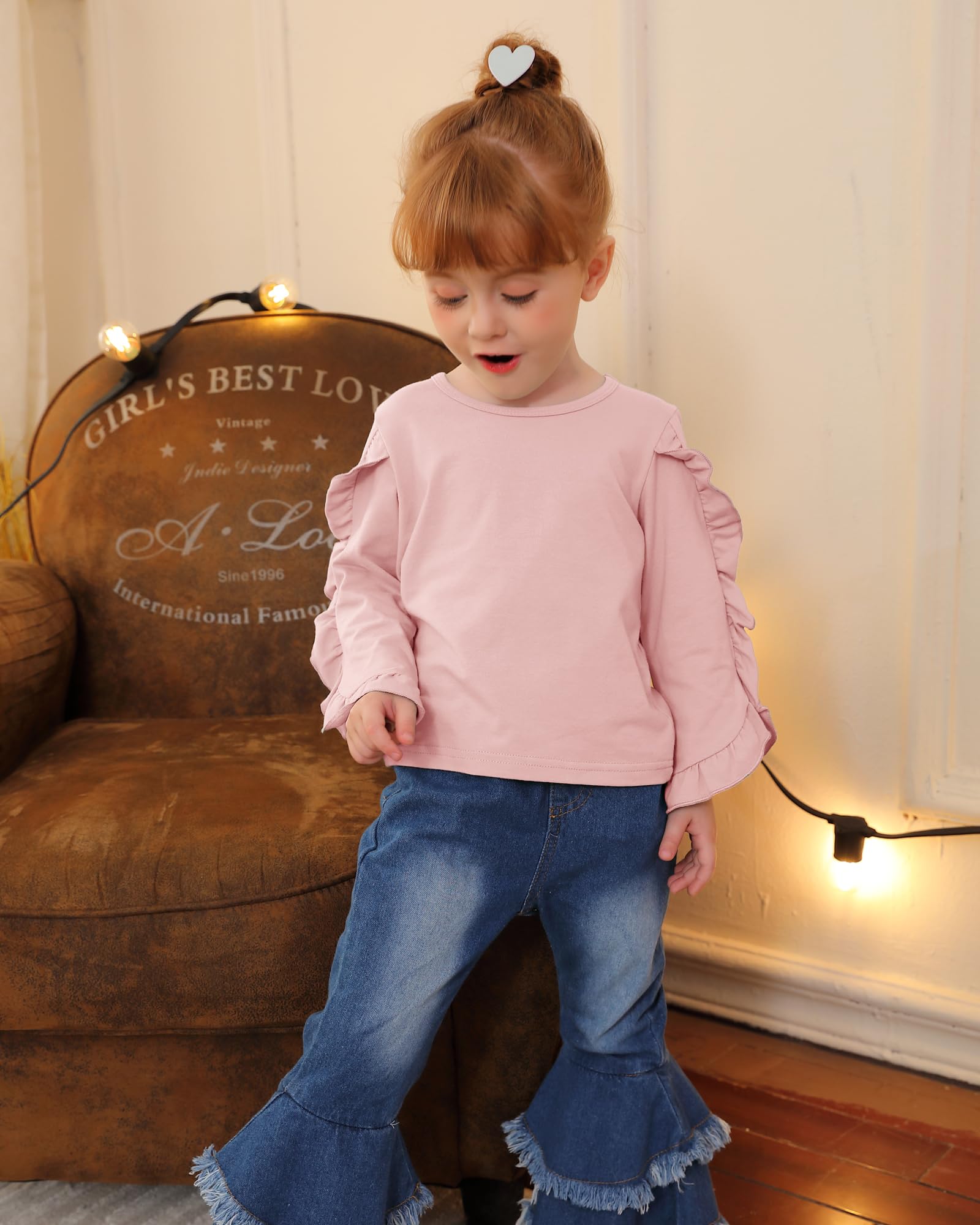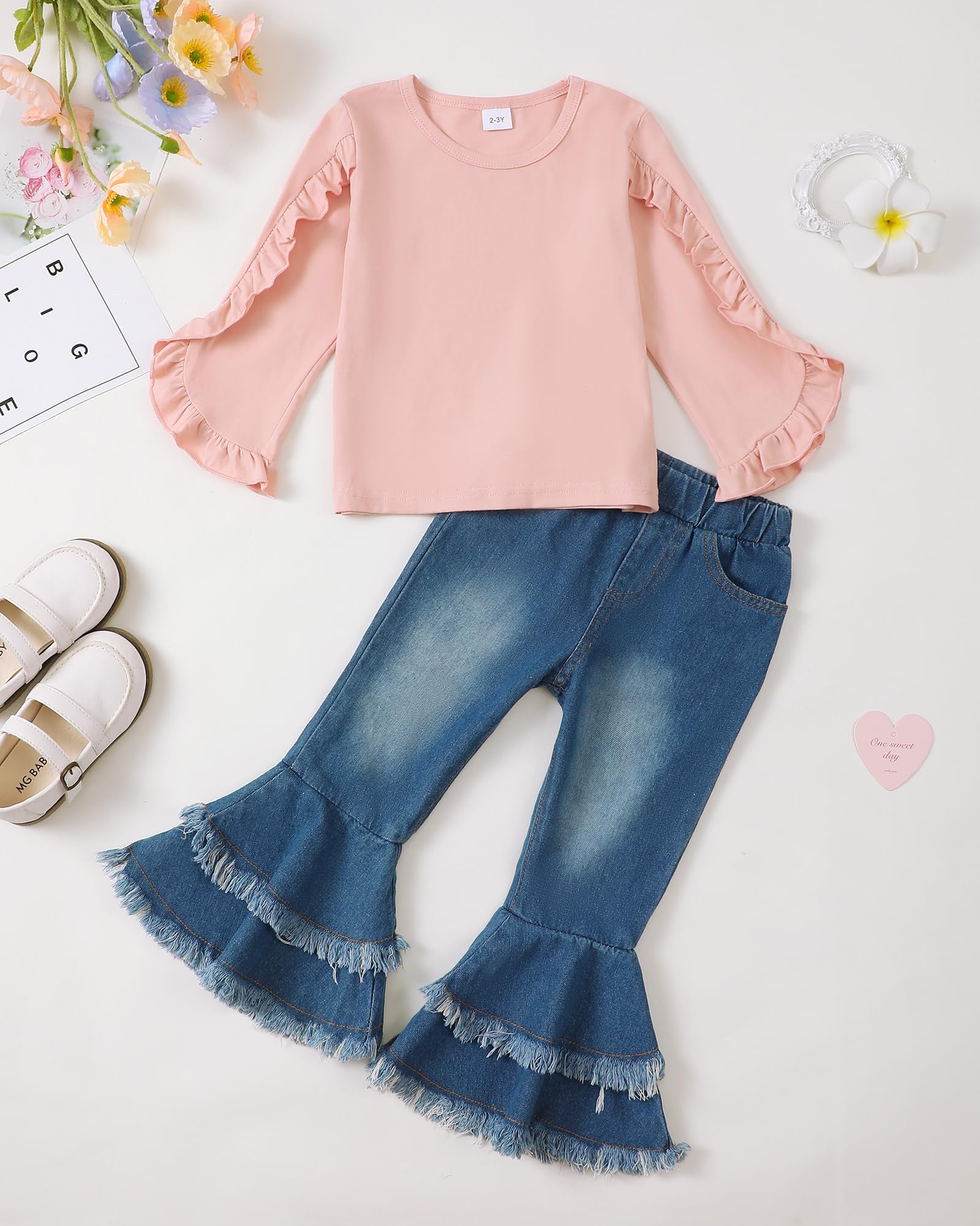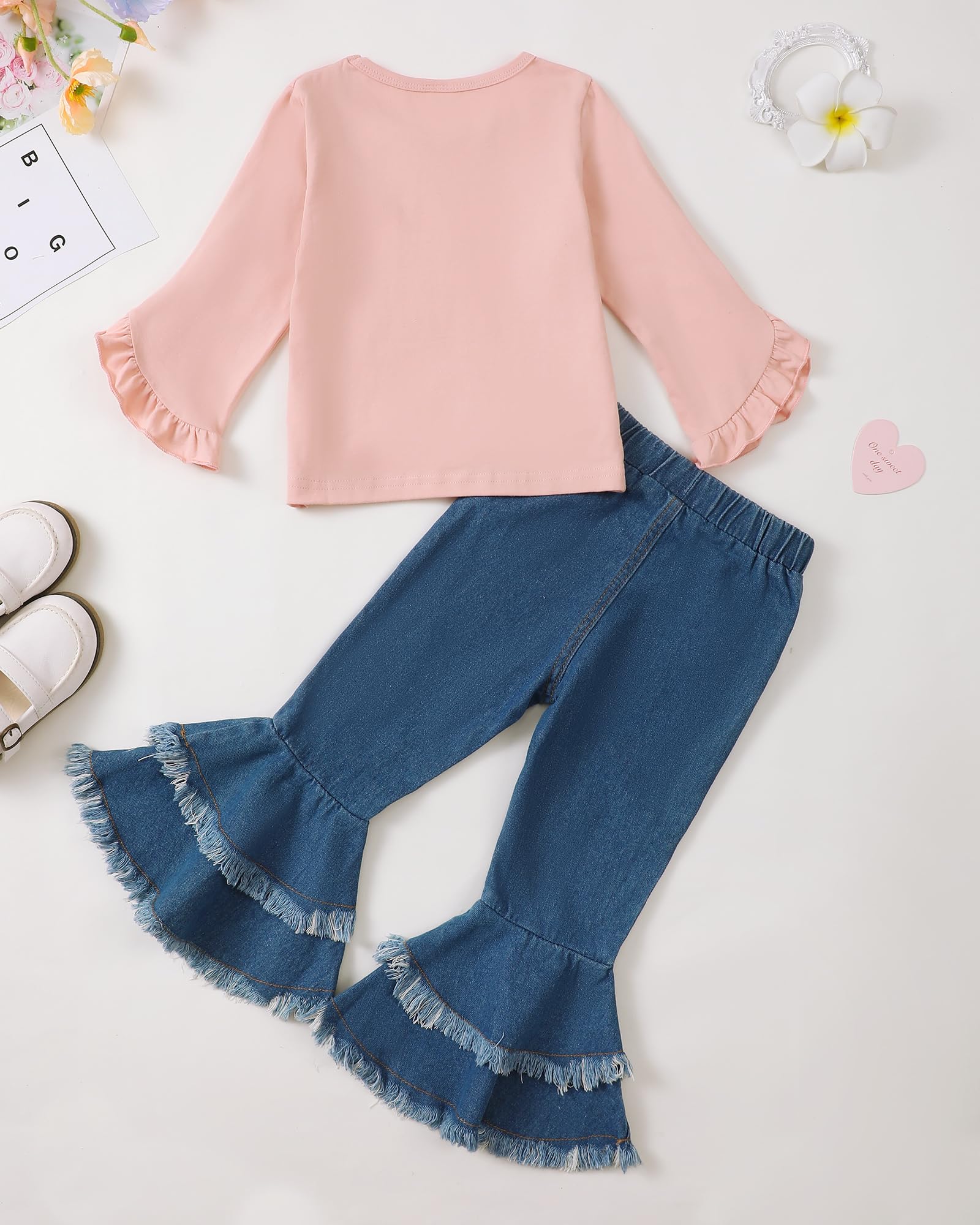 Easy Care: The 2 peices outfit for girl include a ruffle top and flare jeans, both are machine washable for hassle-free cleaning and maintenance