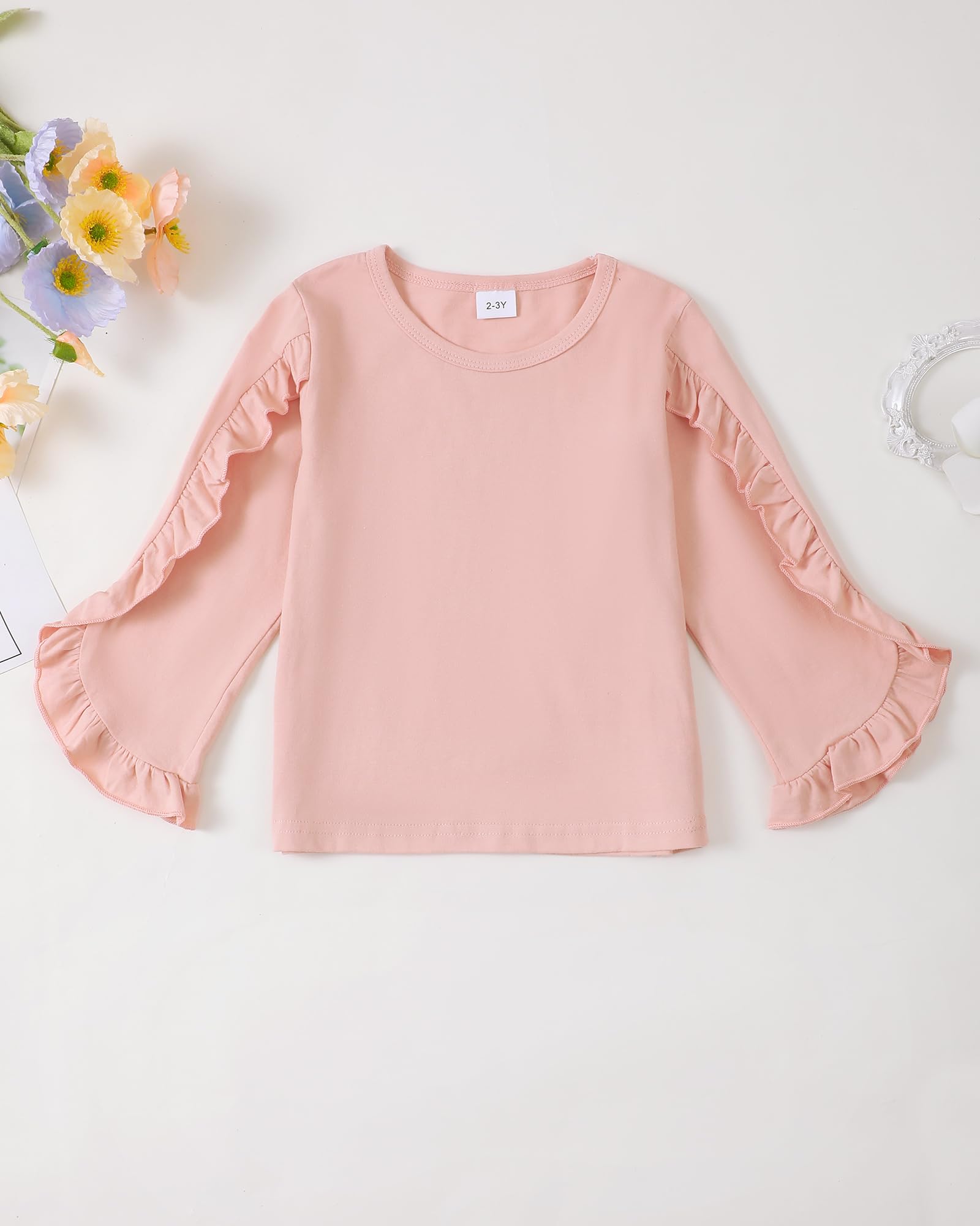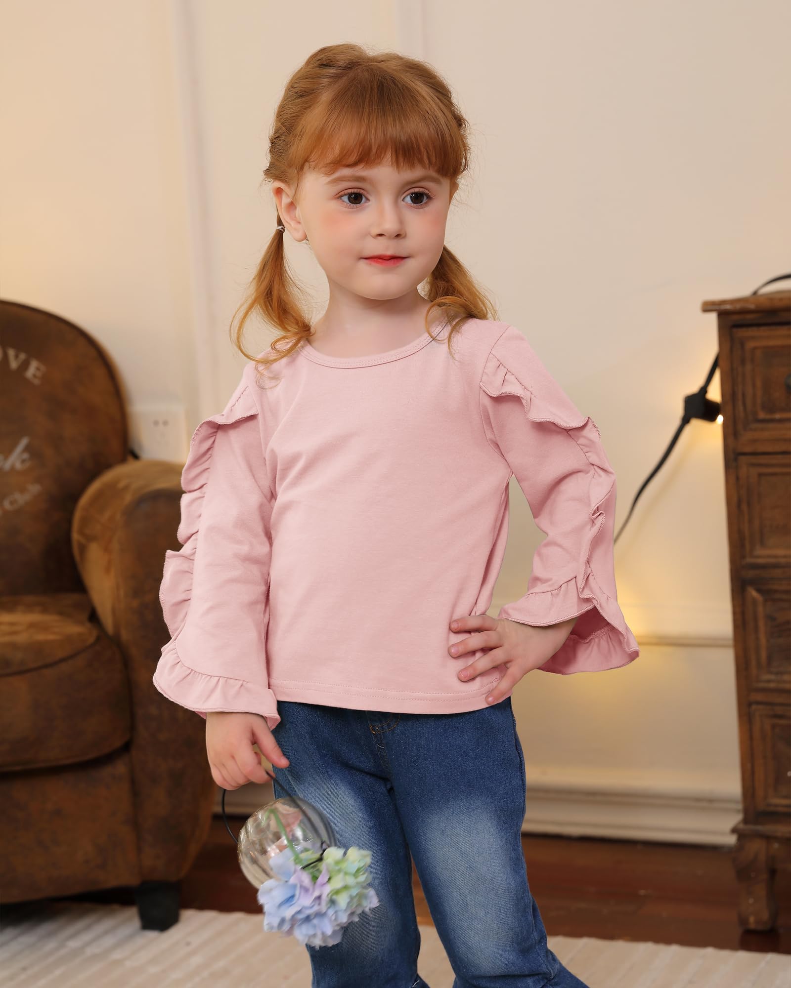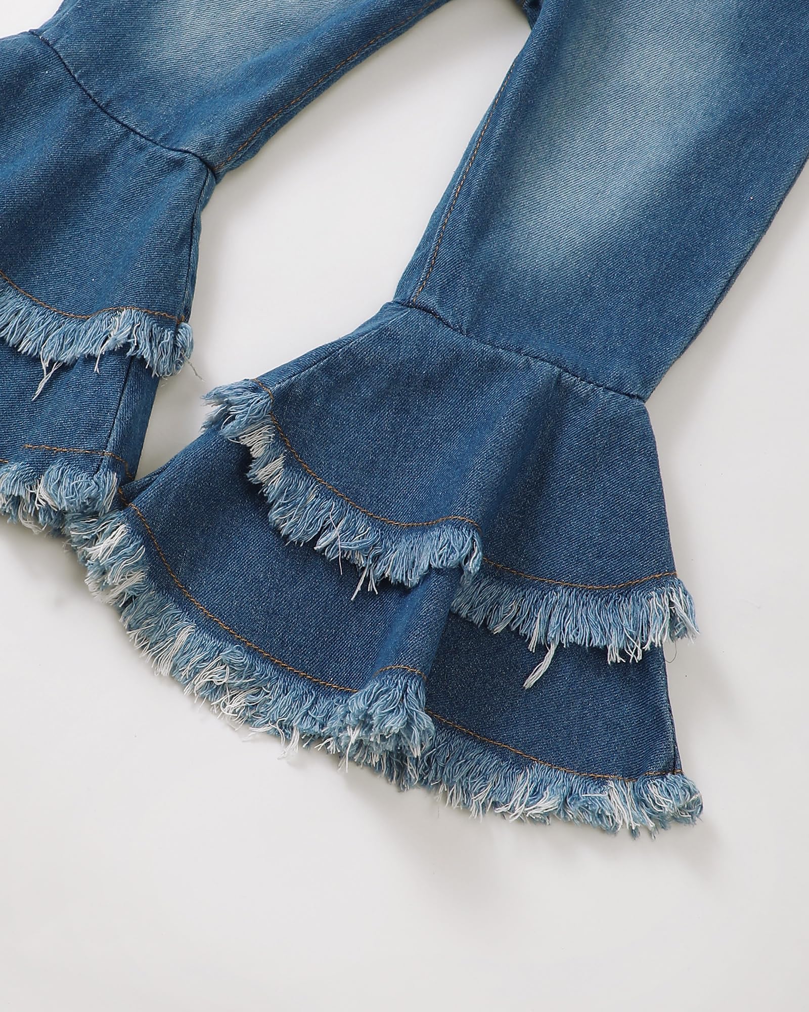 Easy Care: The 2 peices outfit for girl include a ruffle top and flare jeans, both are machine washable for hassle-free cleaning and maintenance