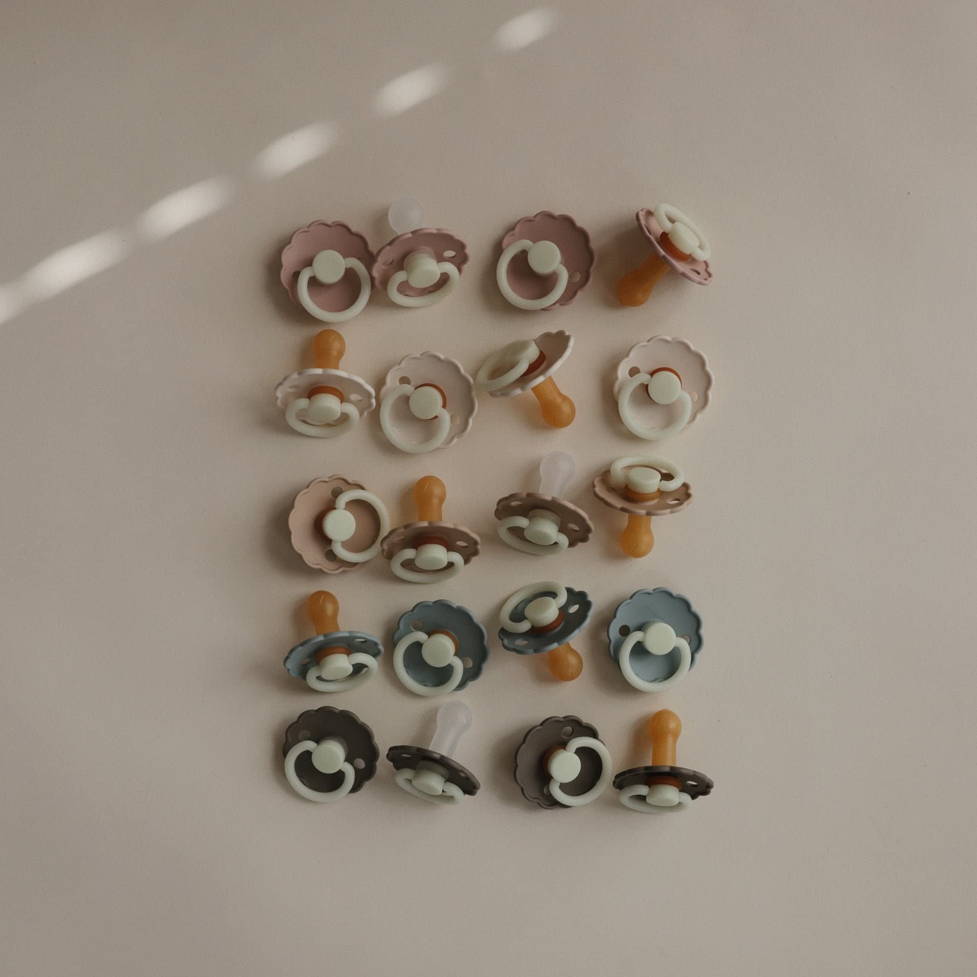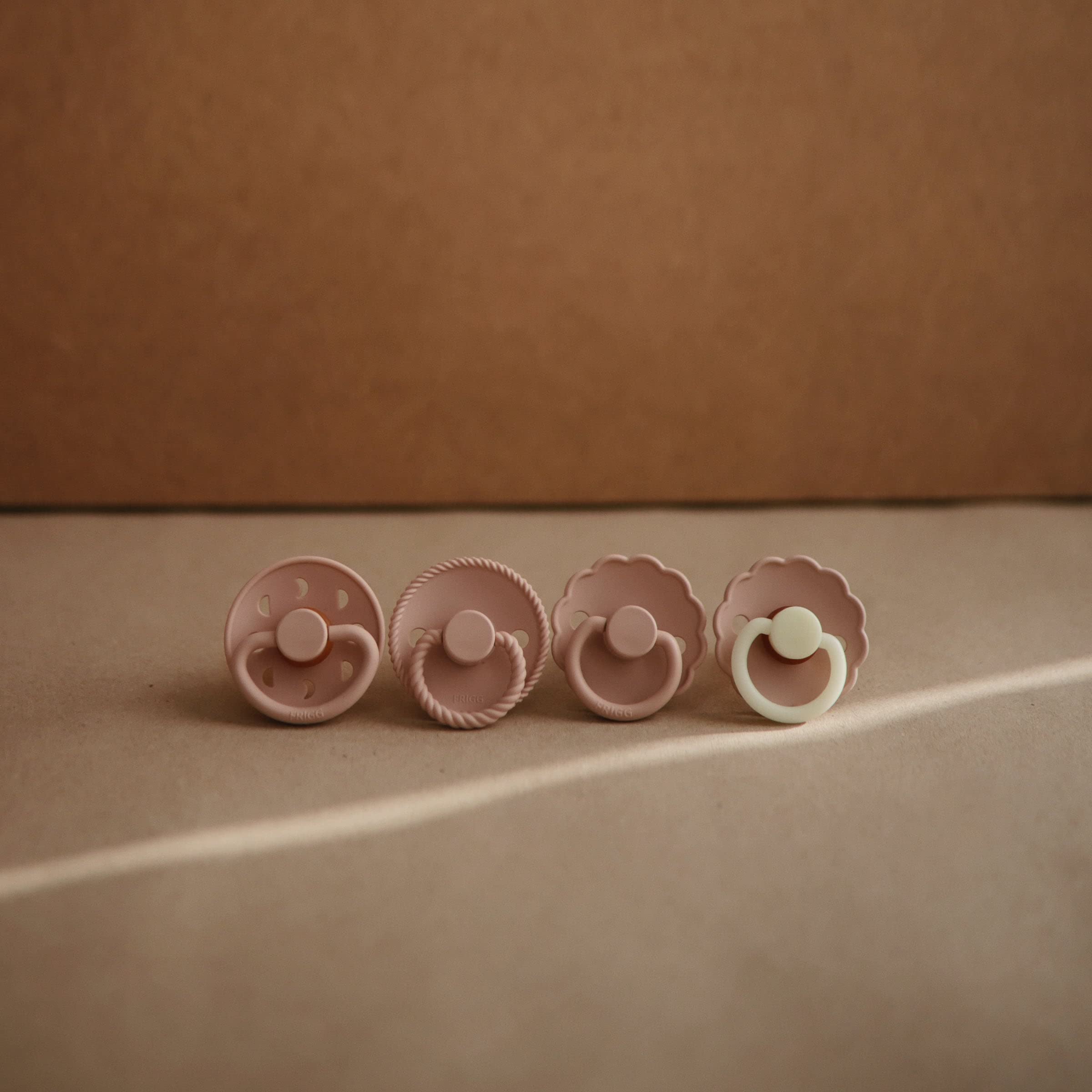 The FRIGG line of night rubber pacifiers is thoughtfully designed for your baby's comfort with sections that glow in dark settings. The outward curve keeps the pacifier off their delicate skin, while features like air holes and a security handle ensure your baby stays safe.