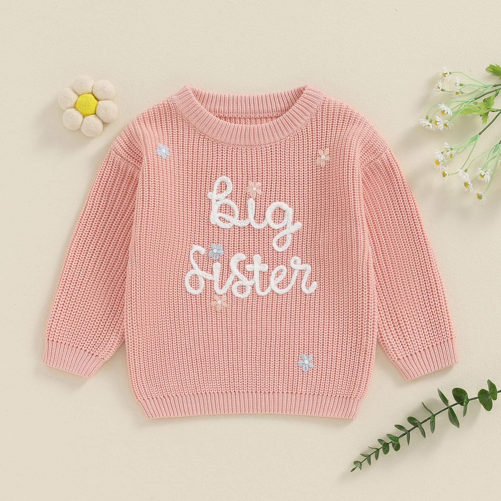 Features: Baby sweater, big sister, little sis, floral embroidery, knitted sweaters, so cute. Big sister outfit, little sister outfit, sister matching outfits, big sis outfit, matching sister outfits, baby girl sweater, baby girls' sweaters, baby knit sweater, newborn sweater.