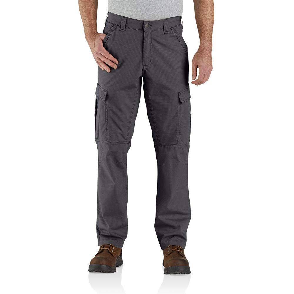 Description Built to move, these men's Carhartt cargo work pants offer job-site durability with stretch for easy mobility. Large thigh pockets plus utility pockets offer plenty of storage space. High-wear pocket areas are reinforced with Cordura®, and double-front legs accept knee pads. Their relaxed fit offers a little extra room through the seat and thigh with a straight leg opening.