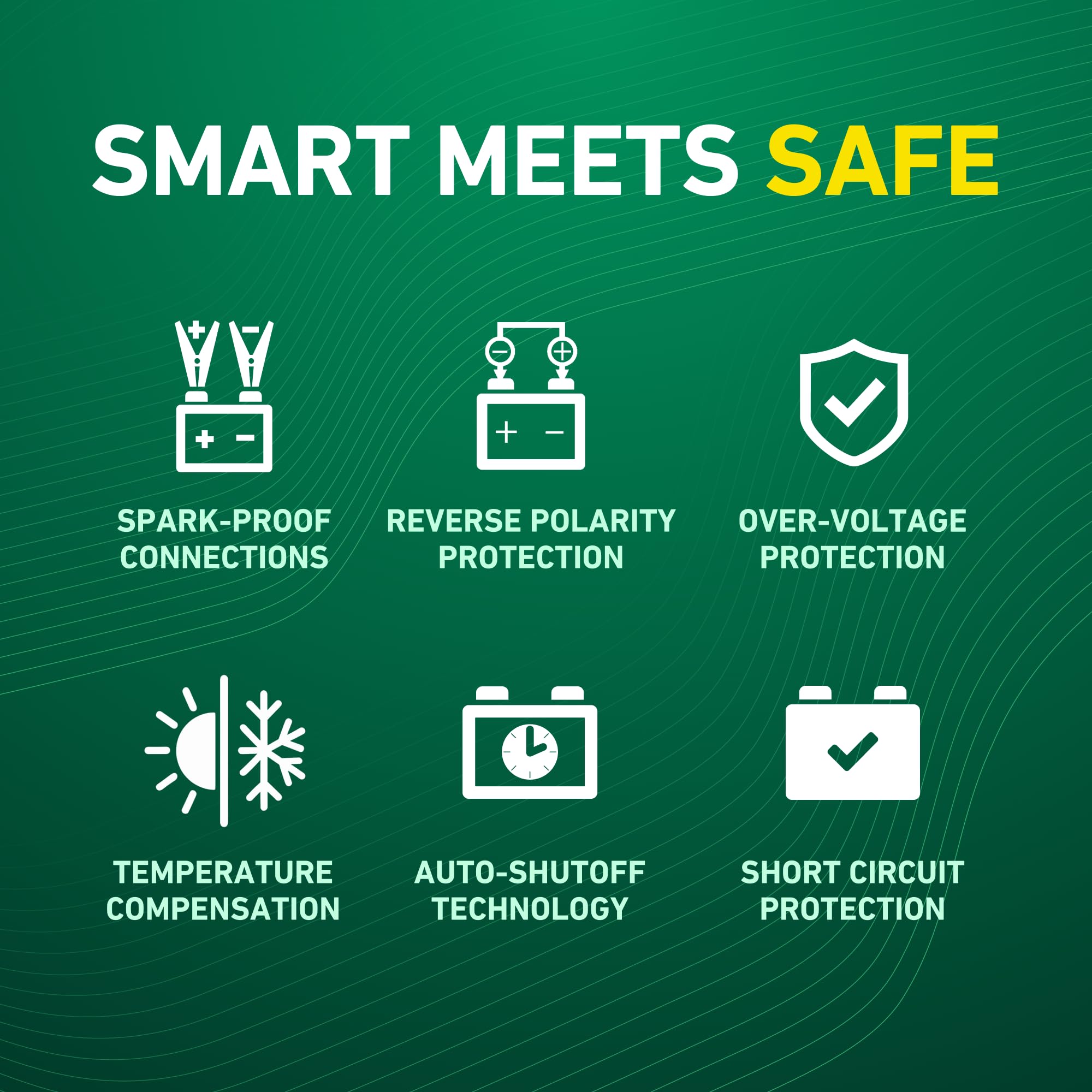 Advanced safety features: Built-in spark-proof connections, reverse polarity protection, temperature compensation, and microprocessor-controlled charging for worry-free operation.