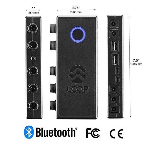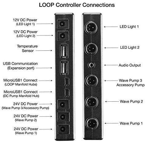 SPECIFICATIONS - Dimensions: 7.5” x 2.75” x 1” Lighting Power Input: 12 Volt DC Wave Pump Power Input: 24 Volt DC Audio Port: 3.5mm USB Ports (2): 1 Temp/1 Upgrades MicroUSB Ports (2): to DC Pump & LOOP Hubs Temperature Specs: +/- 1 F Bluetooth: 4.0 (Max. range 200 ft.)