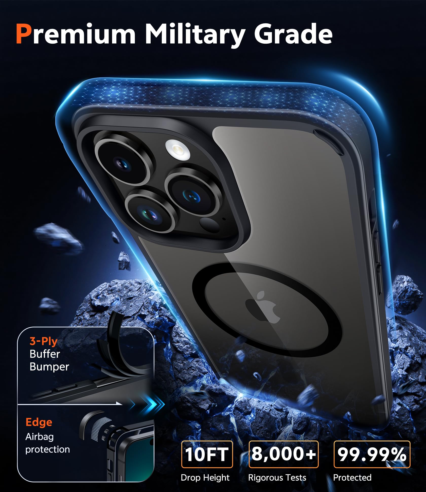 10FT Military Grade Protection: Passed Military Drop Tested up to 10FT. This case is made with rigid polycarbonate and flexible shockproof TPU around the edge and features 4 built-in corner Airbags, keeps the phone safe from bumps and scratches
