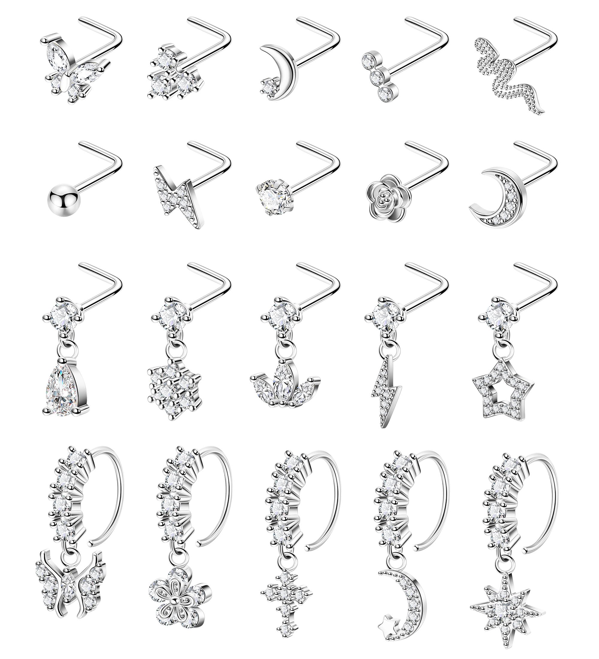 Nose Rings Piercing Set-Each order you will receive 20 different style nose rings,include:10pcs L shaped nose studs,5pcs L shaped dangle nose nails,and 5pcs dangle nose rings.The quantity and styles are enough to meet your daily outfit matching needs. Simple basic styles with novel dangle design, never go out of style, great choice for nose piercing