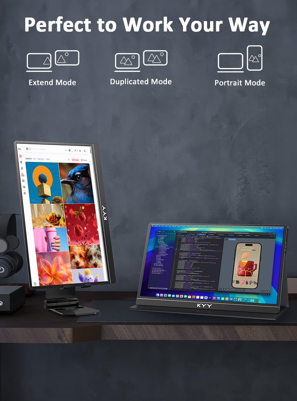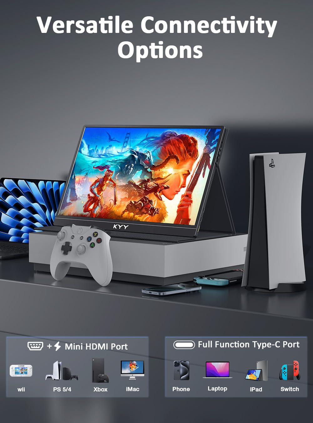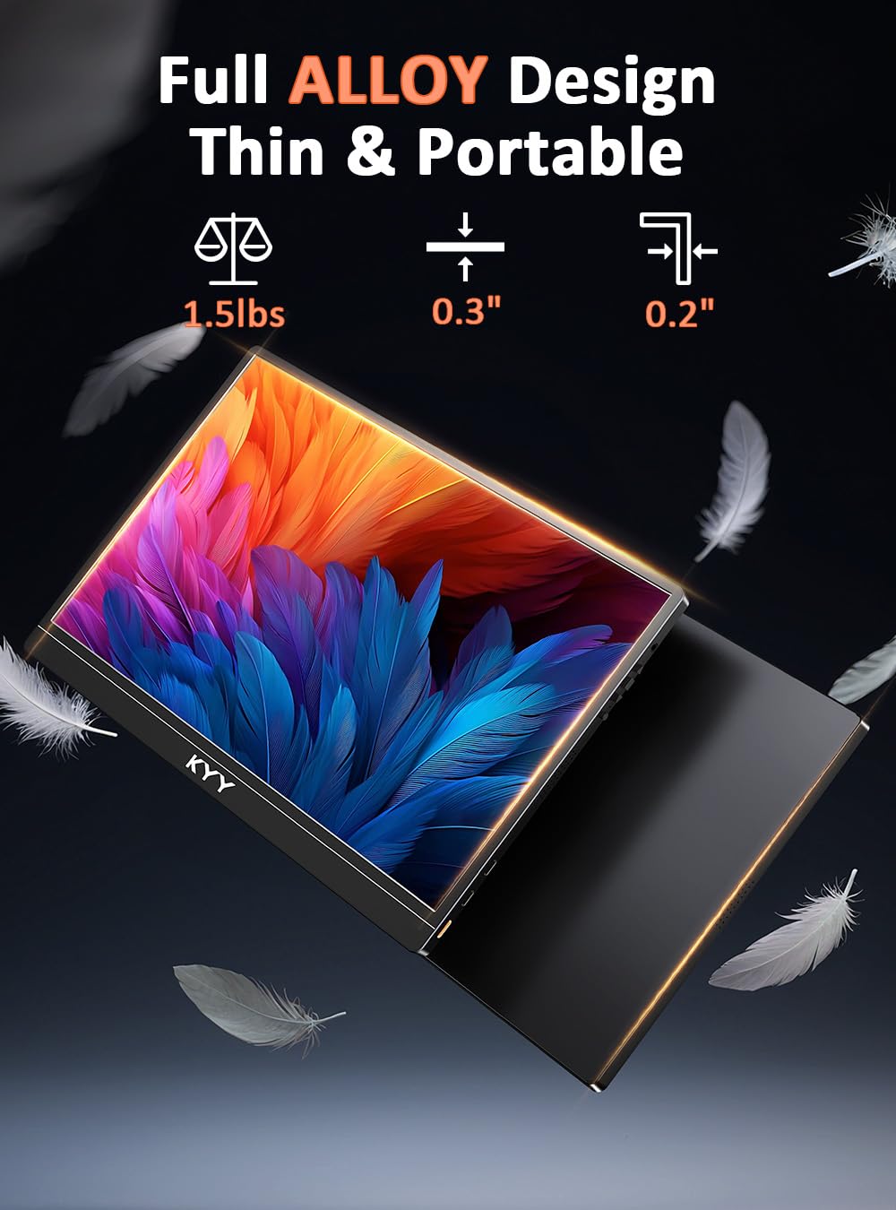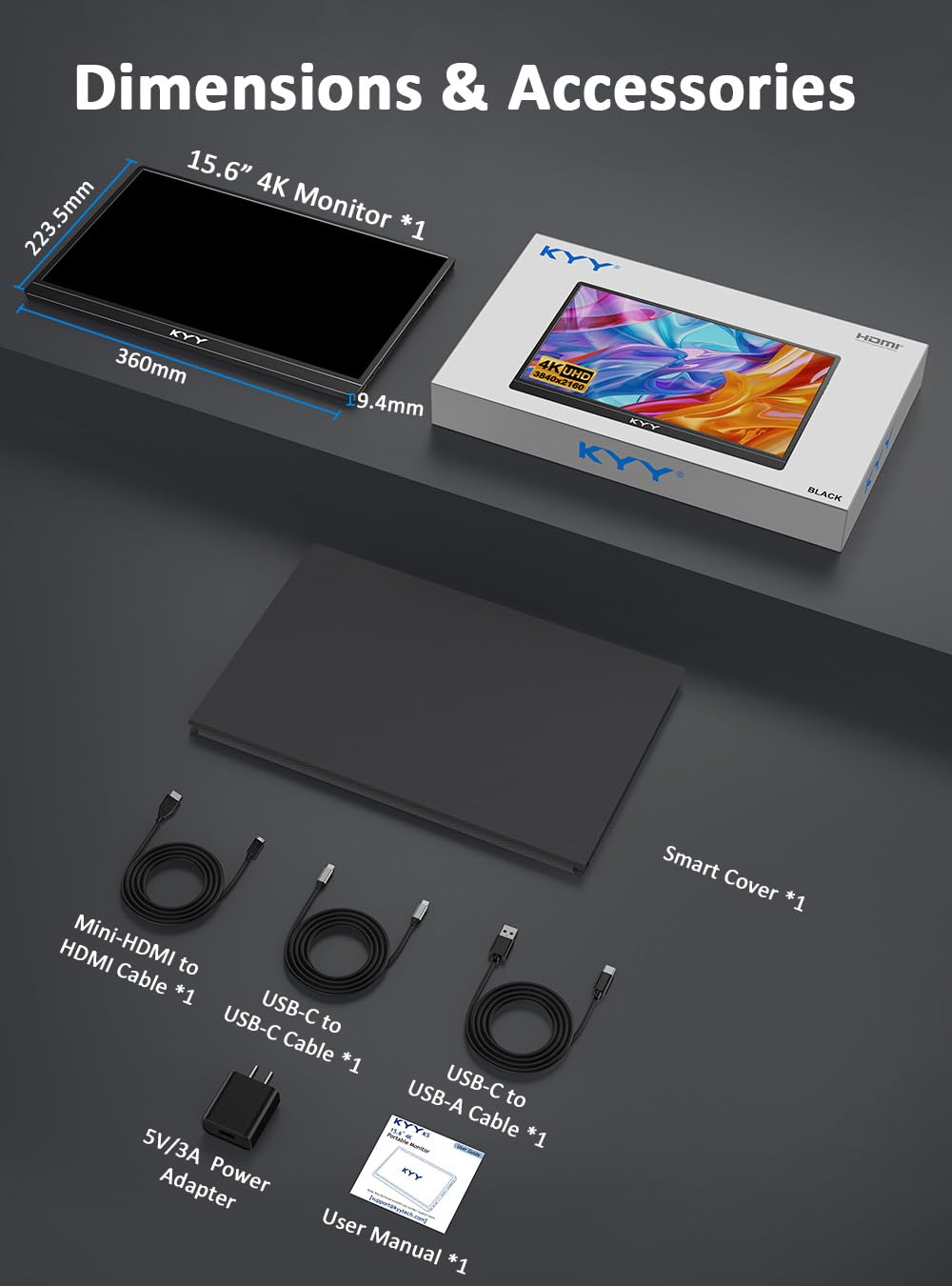 [ True 4K UHD Portable Monitor ]: KYY 15.6" portable monitor features an S-grade IPS panel, boasting 4K UHD resolution (3840 x 2160), Combining 4K micro-precision with 60 Hz smooth motion, KYY 4K portable monitor delivers an entirely new sensory experience of pixels and detail, satisfying gamers' desire for a seamless gaming experience. It provides stunning 4K visuals, creating perfect visual harmony.