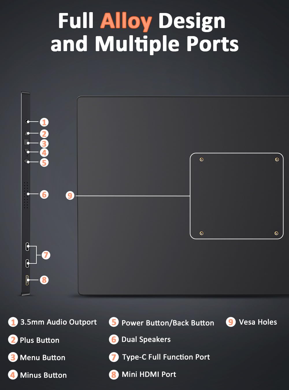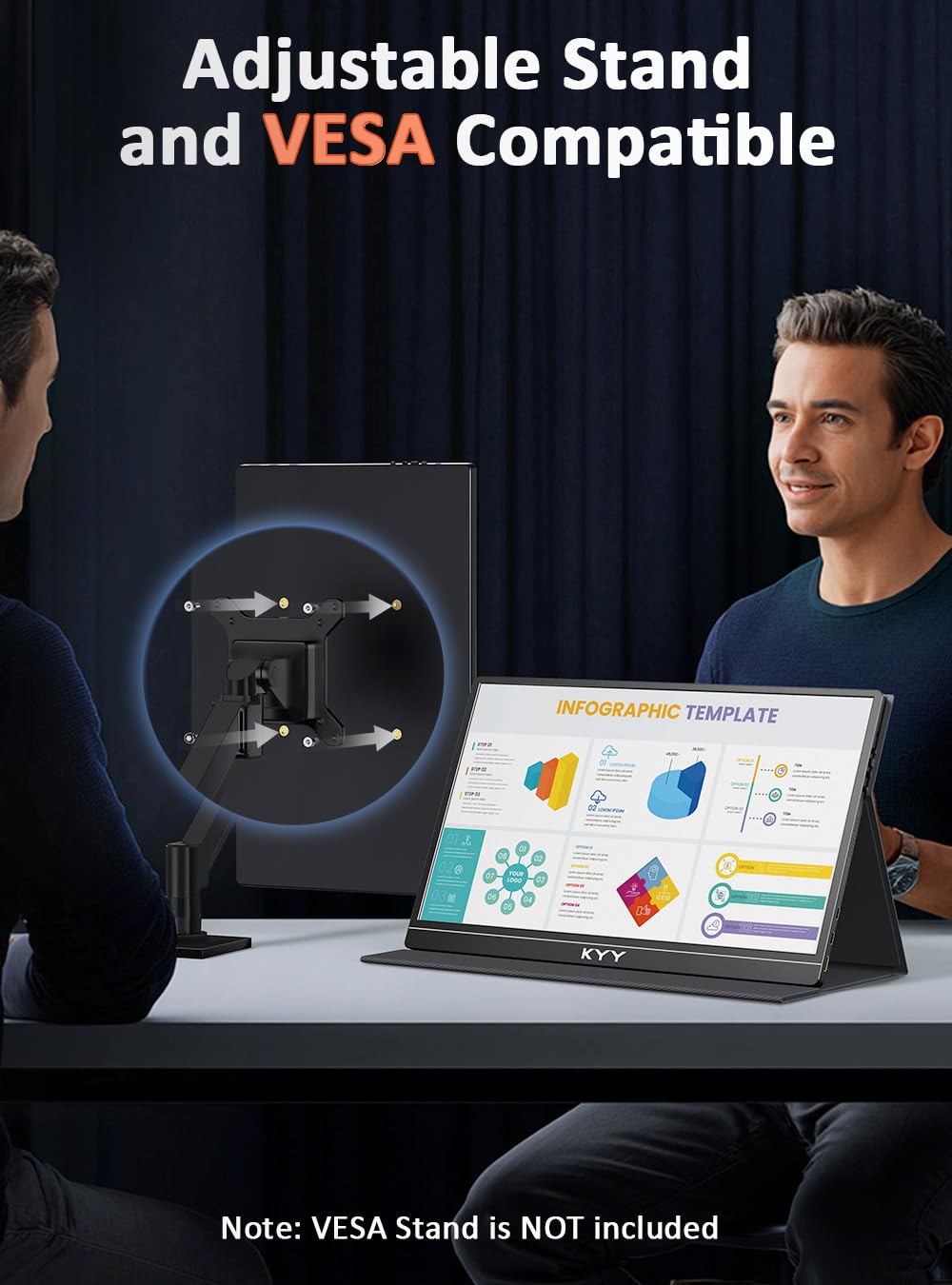 [ VESA Mountable & Magnetic Cover Monitor]: KYY 4K portable monitor for laptop comes with a premium PU leather magnetic protective case for reliable protection during your travels. Four VESA mounting holes on the 4K monitor’s back allow for easy and secure installation on VESA mounts in both landscape and portrait orientations (VESA mount not included). The VESA mounting dimensions are 75 x 75 mm, and M4 x 3 mm screws are recommended for installation