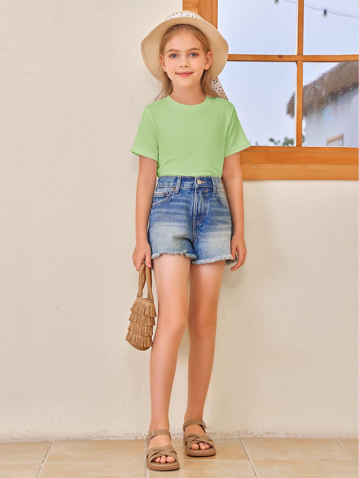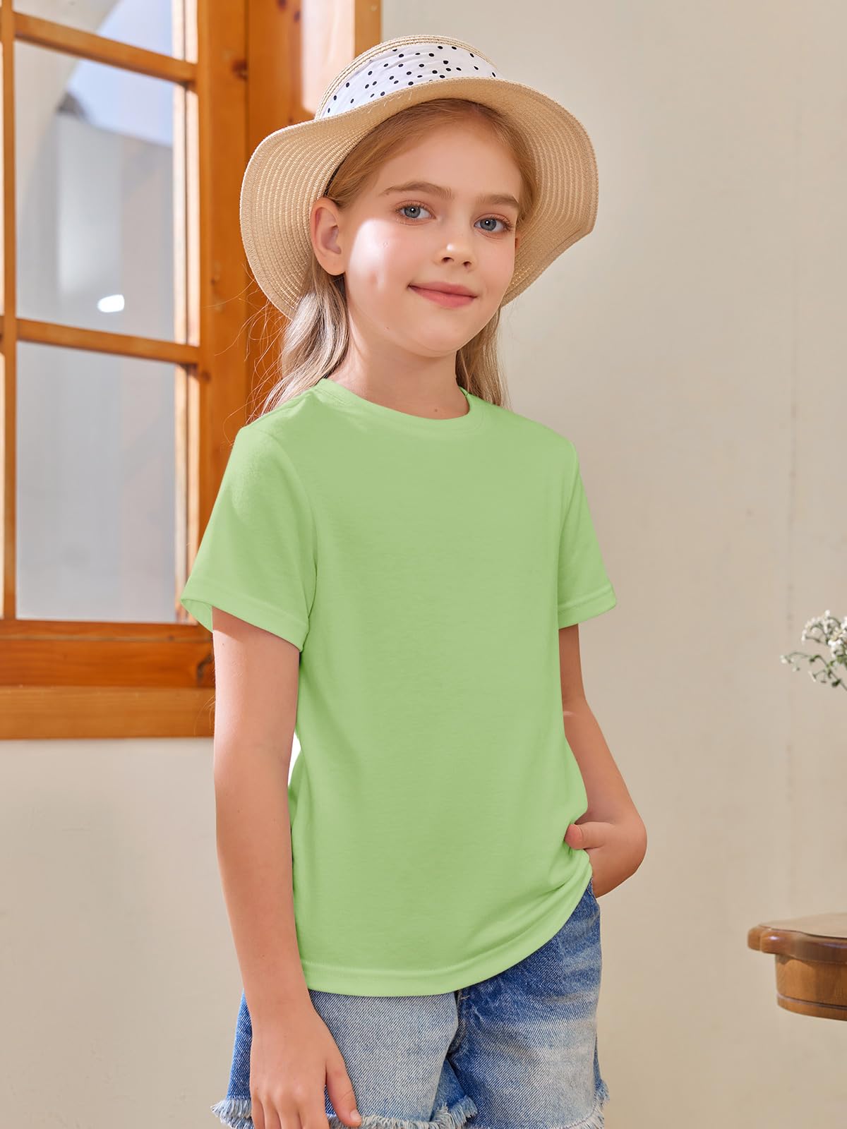 Design: Girls summer t-shirt, casual solid color tee tops, classic round neck and regular length, ,it's a good choice for slim kids.The loose fit provides a comfortable fit for ease of wear and movement. Don't worry about showing your belly when you play