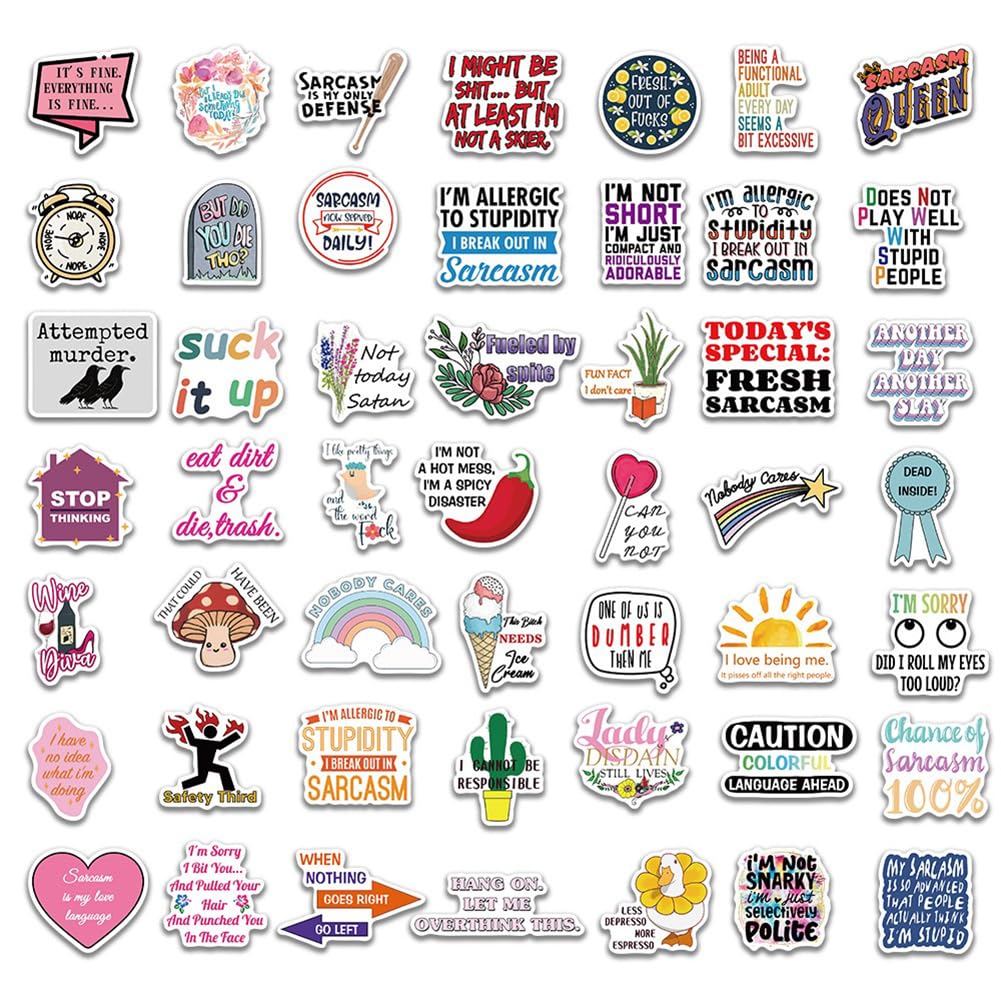 【50Pcs Included】—These sarcasm Words theme stickers pack contains 50pcs no duplicated stickers, can be attached to computer, Laptop, skateboard, Luggage, refrigerator, guitar, motorcycle, bike, Mobile Phone, etc. Various patterns sticker pack can be great gift for children, kids, youth, friends, family and other DIY decoration.