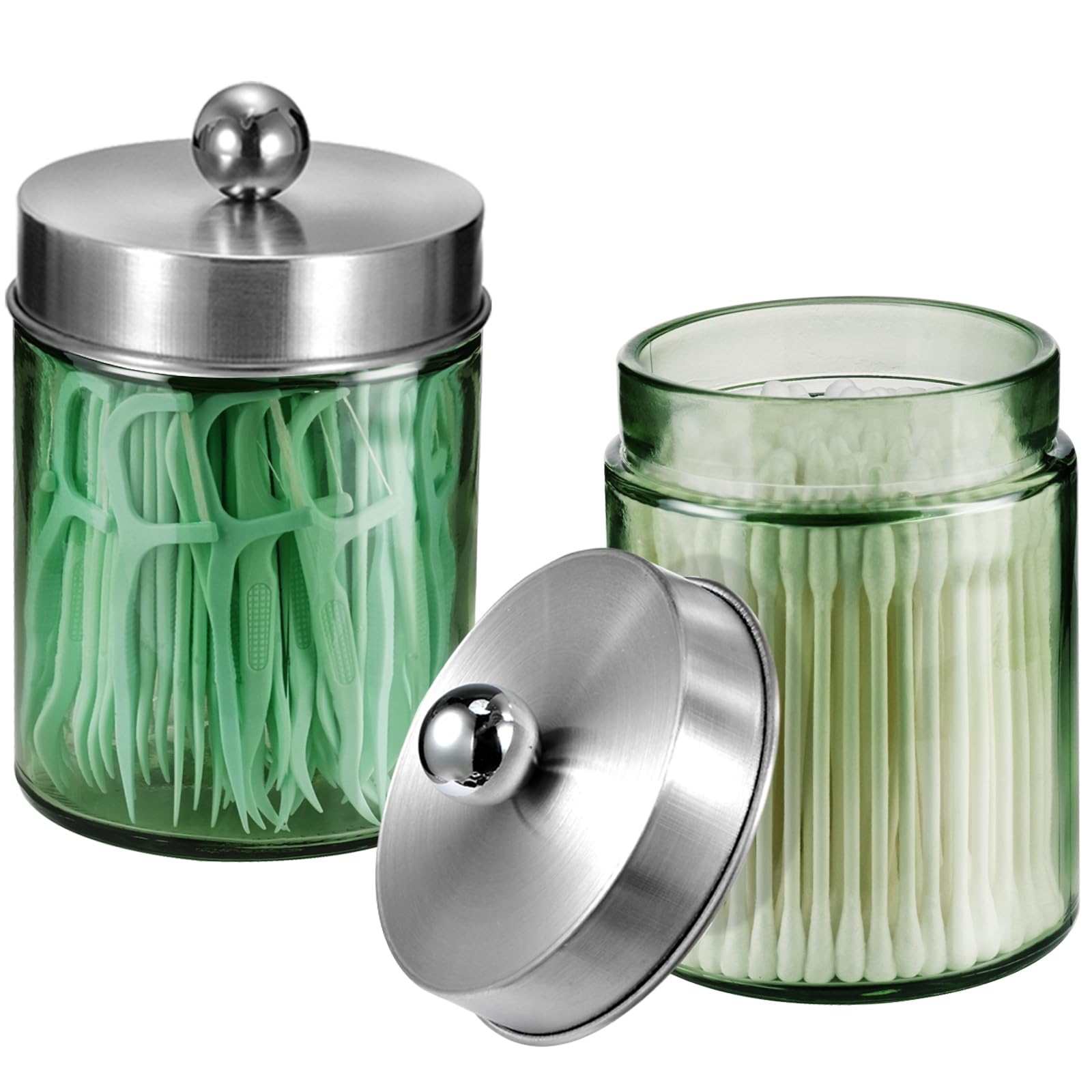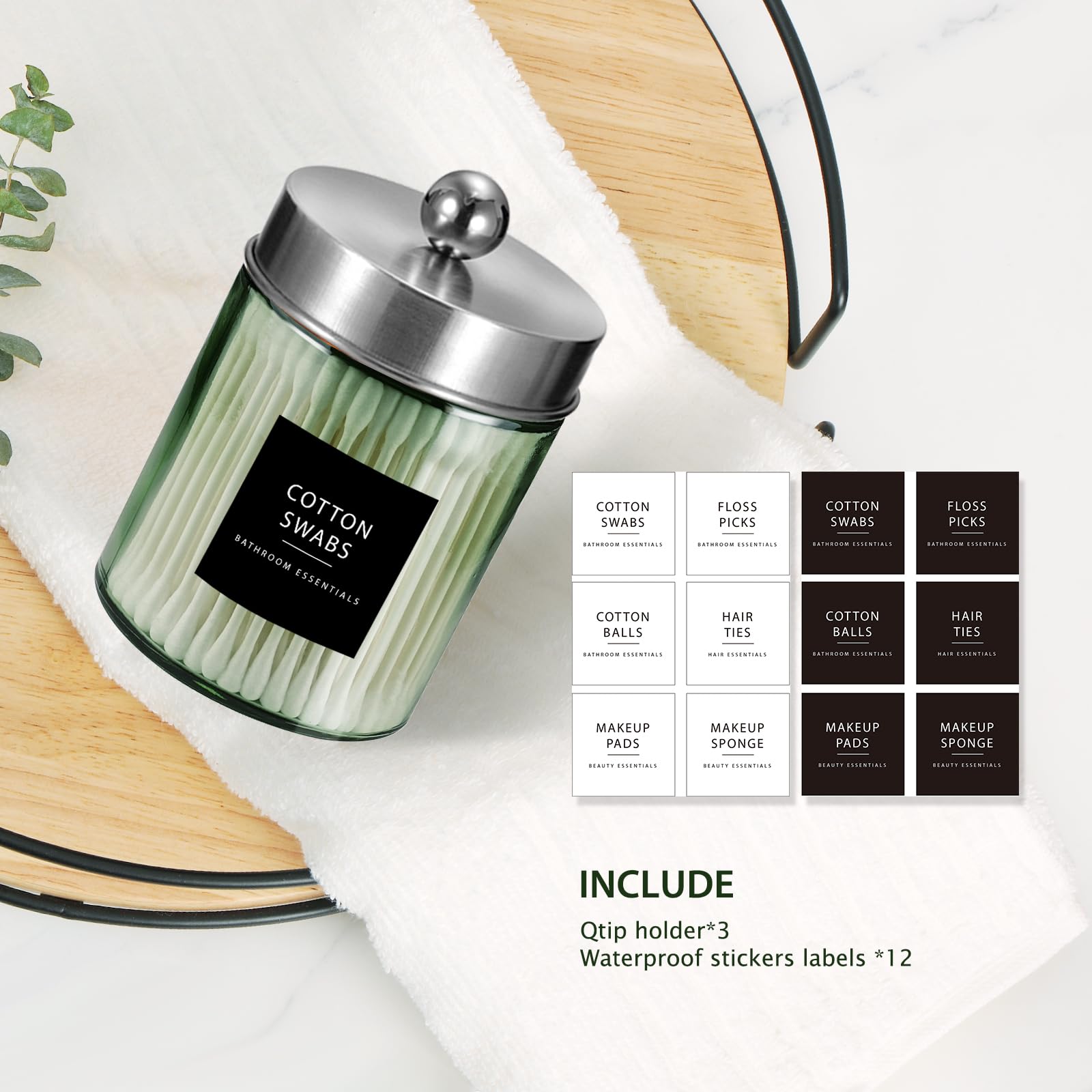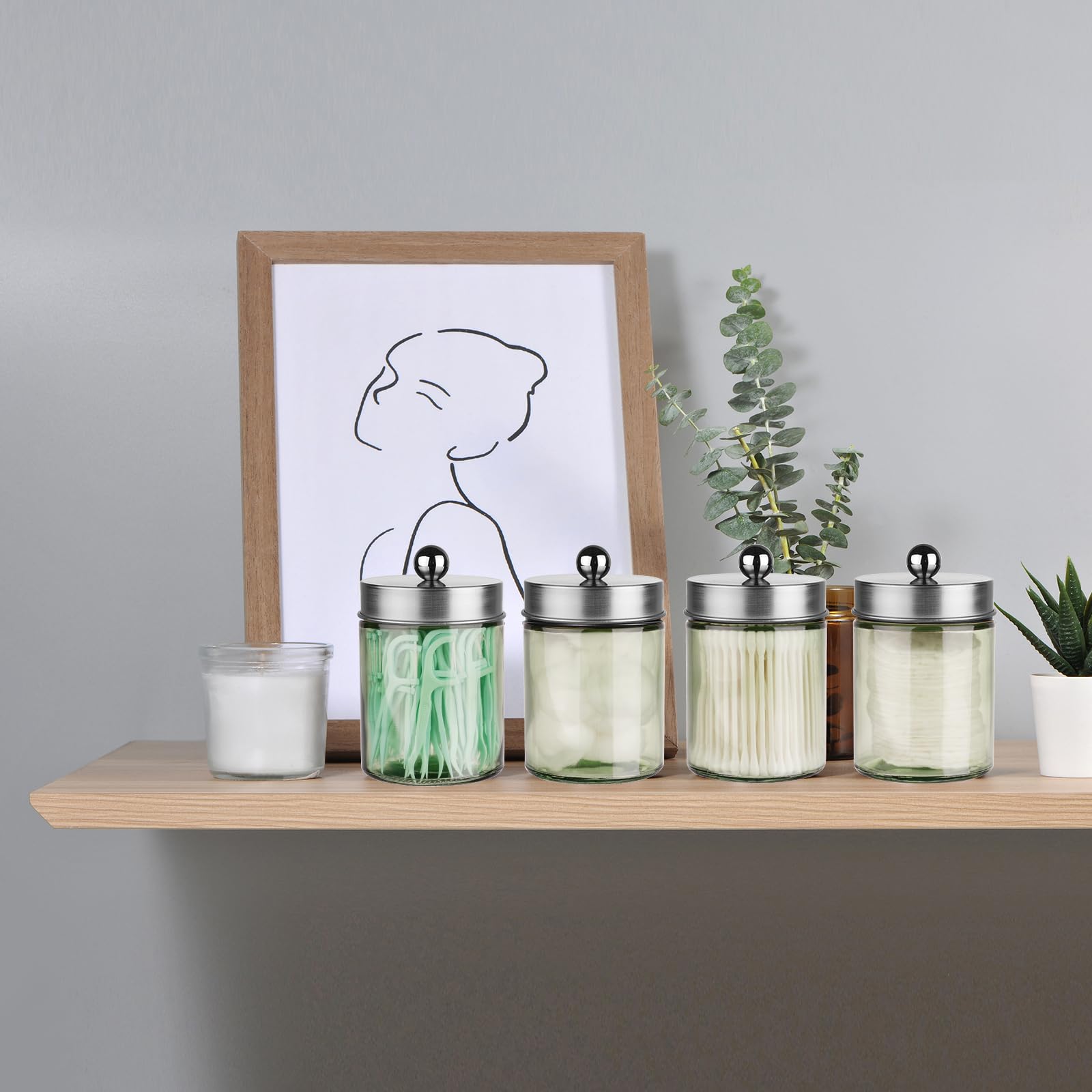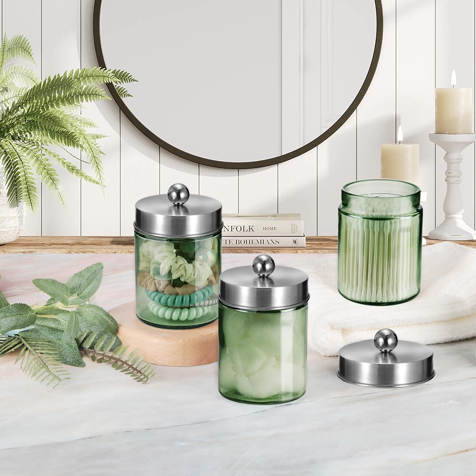 ❤️ Cute Farmhouse Decor- The apothecary jar set will be a fun and beautiful addition to your powder room, bathroom vanity, makeup table and more;This canister is great for storing and organizing cotton swabs, cosmetic sponges, wedges, bath bombs, balls, salts;Organize your hair accessories, clips, elastic bands, bobby pins, bows and more; Use in home office for paperclips, rubber bands, binder clips, and stamps.