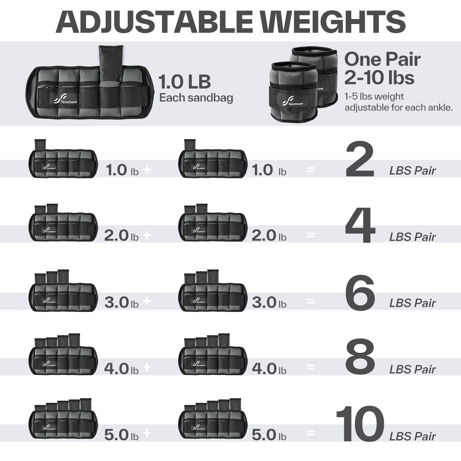 ADJUSTABLE LEG WEIGHTS: The sandbags for ankle weights are removable. Each single weight comes with 5 removable sandbags which weighs 1 LB. Each single weight can be adjusted from 1 to 5 lbs and one pair weights can be adjusted from 2 to 10 lbs by adding or reducing the sandbags.