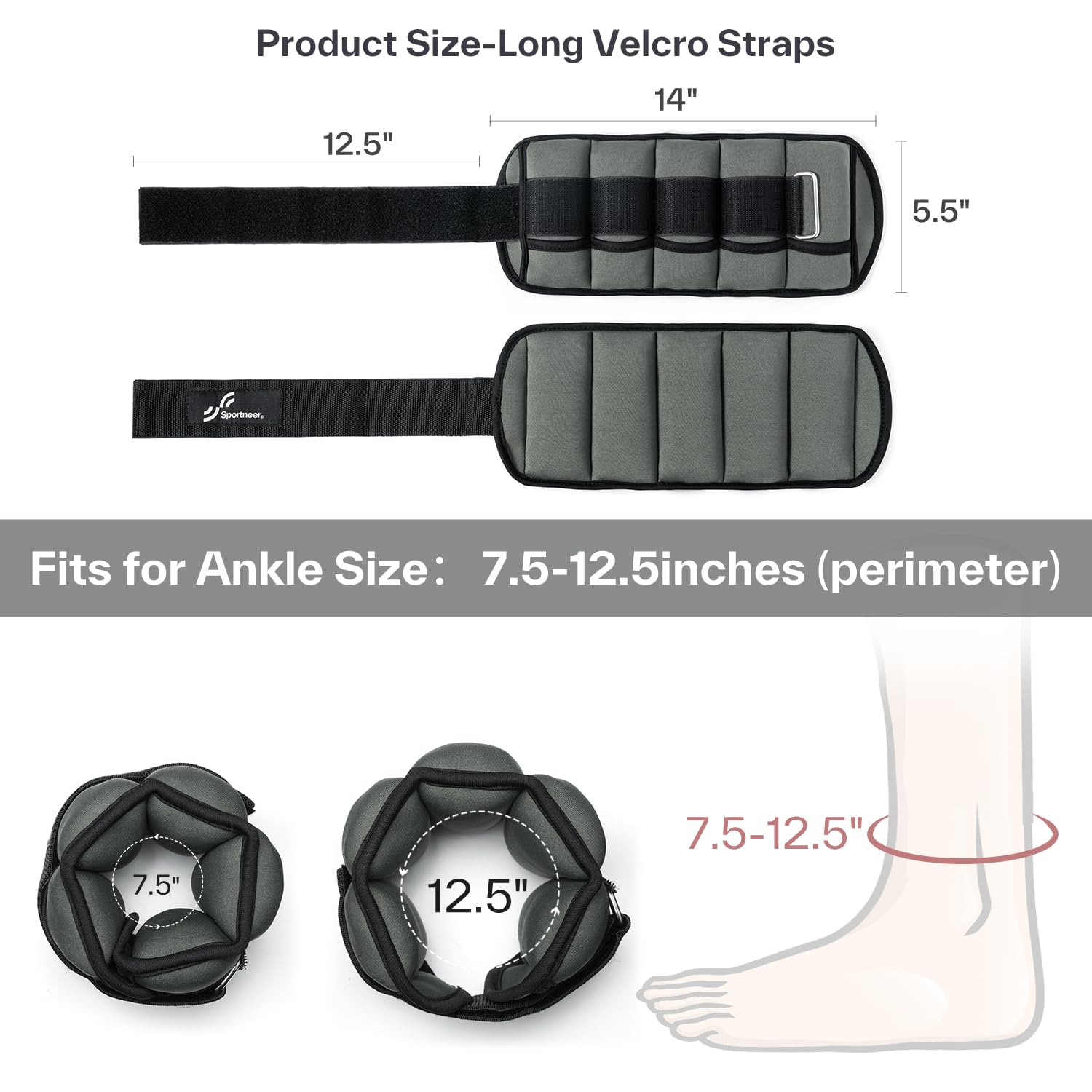 ONE SIZE FITS MOST ANKLES: The ankle weights feature long velcro straps(about 12.5inch), ensuring a comfortable and secure fit for size of ankle from 7.5 to 12.5 inches(perimeter)