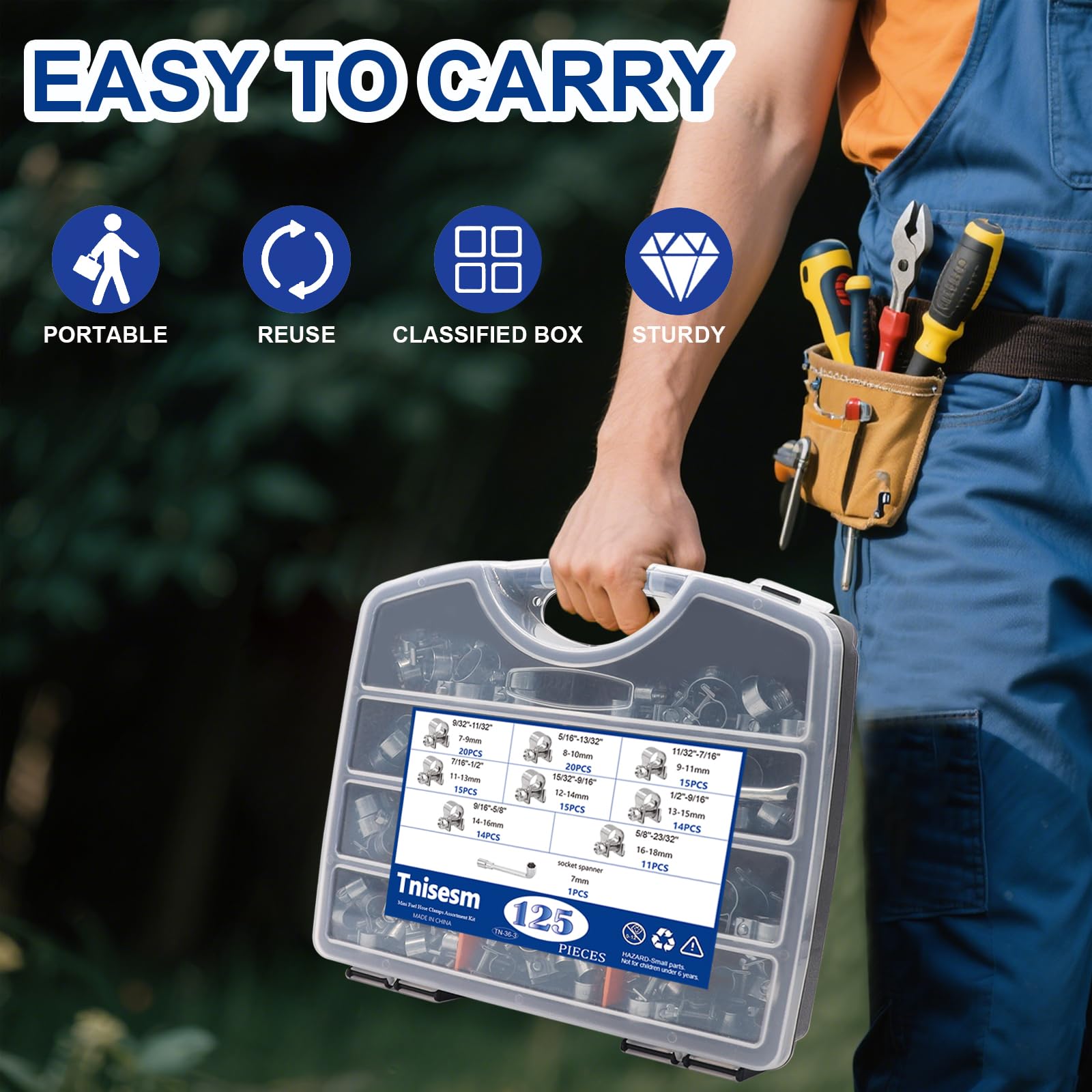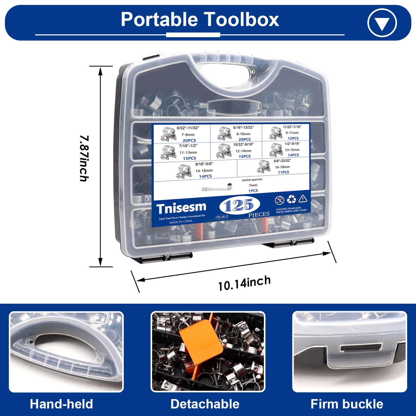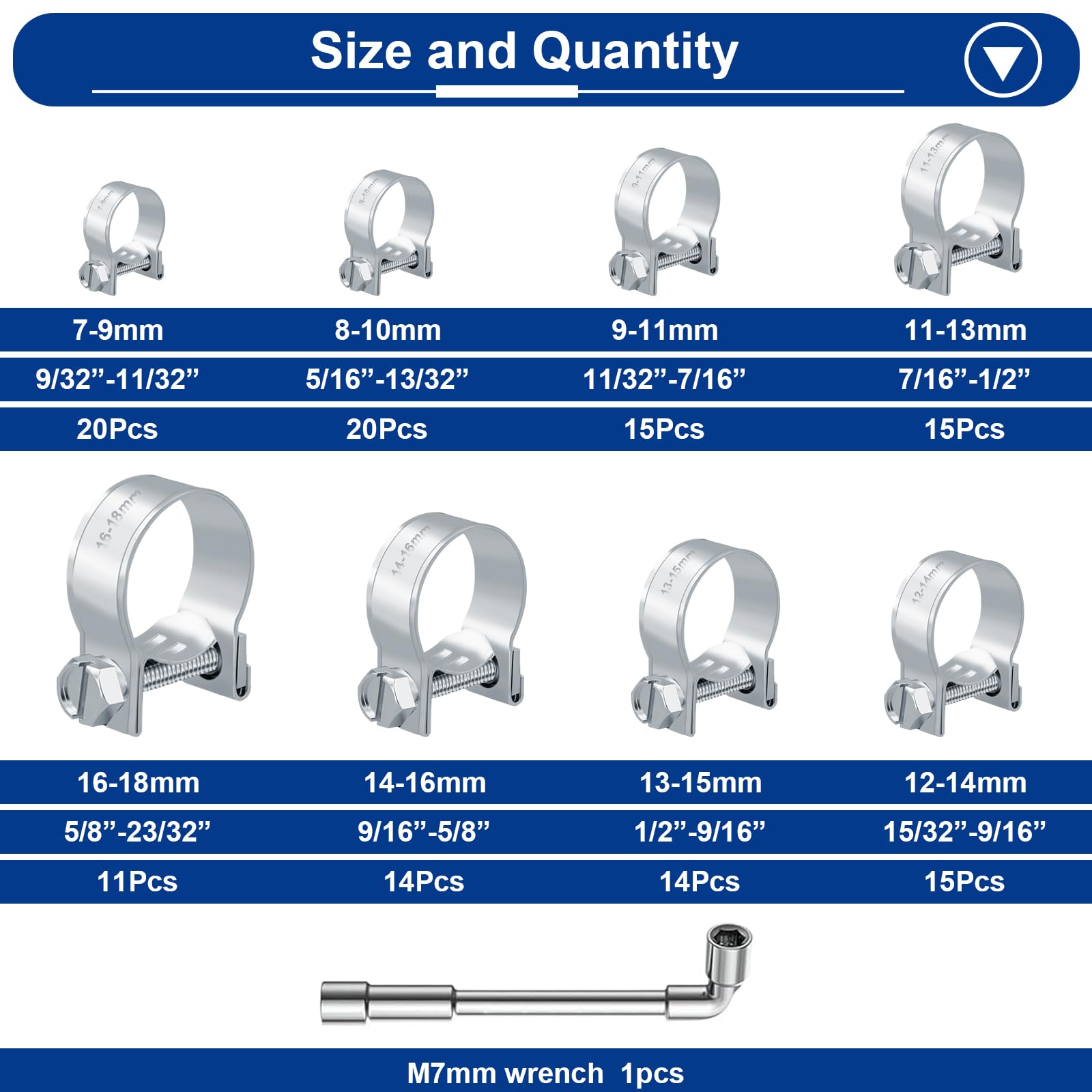 Hose Clamp Size:125Pcs Mini Fuel Injection Clamps are packed in a strong box. 8 different sizes-7-9mm, 8-10mm, 9-11mm, 11-13mm, 12-14mm, 13-15mm, 14-16mm, 16-18mm.