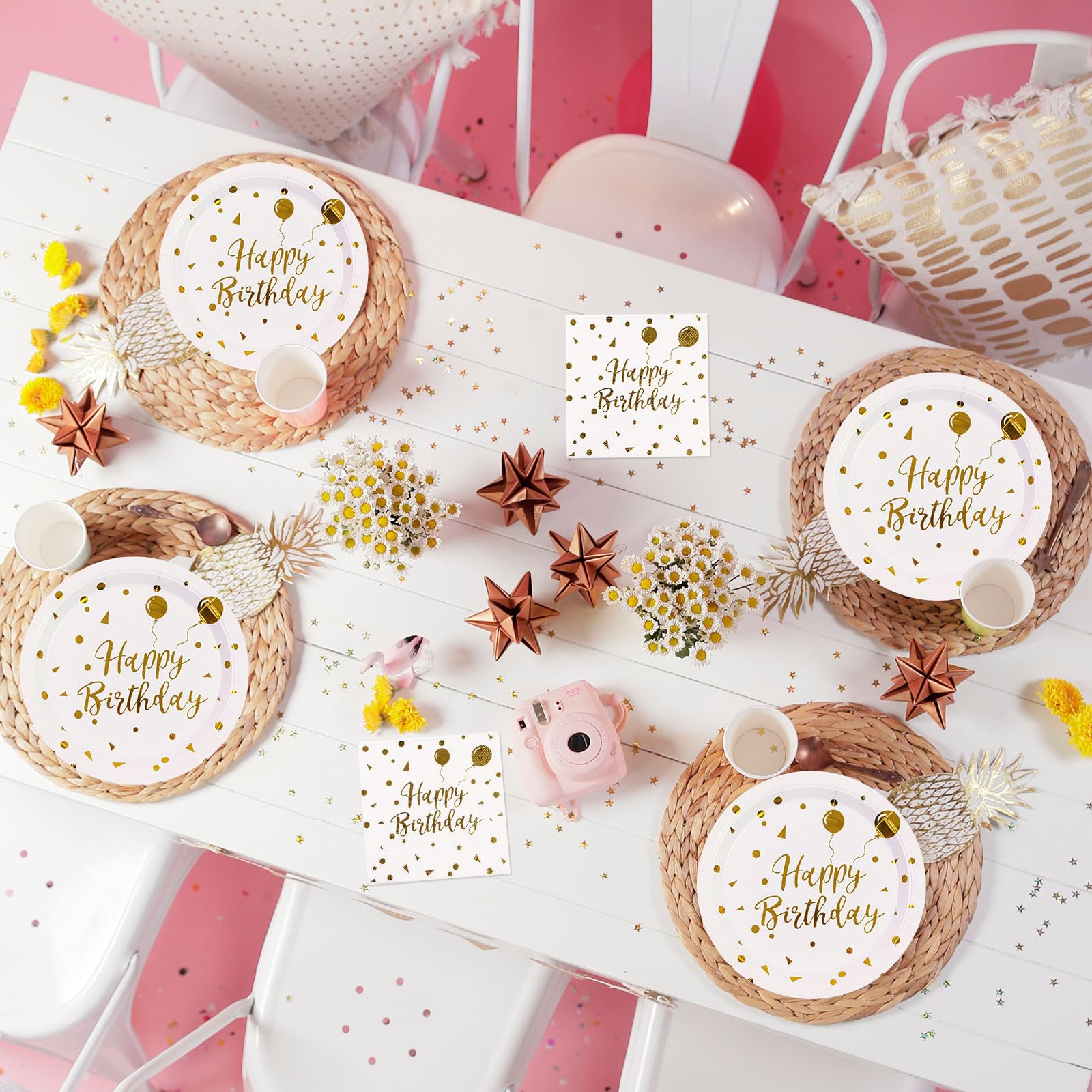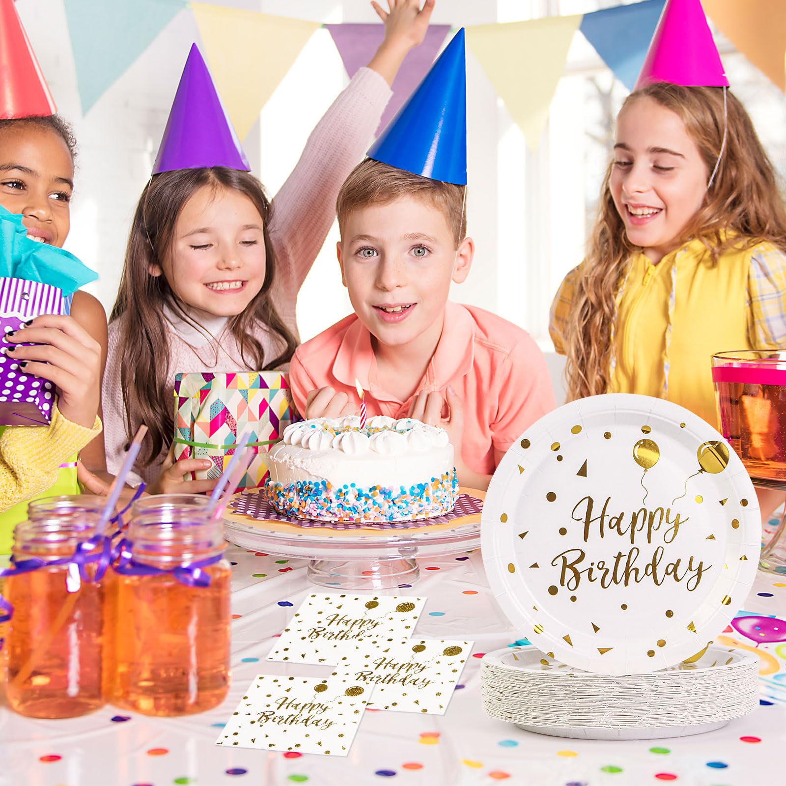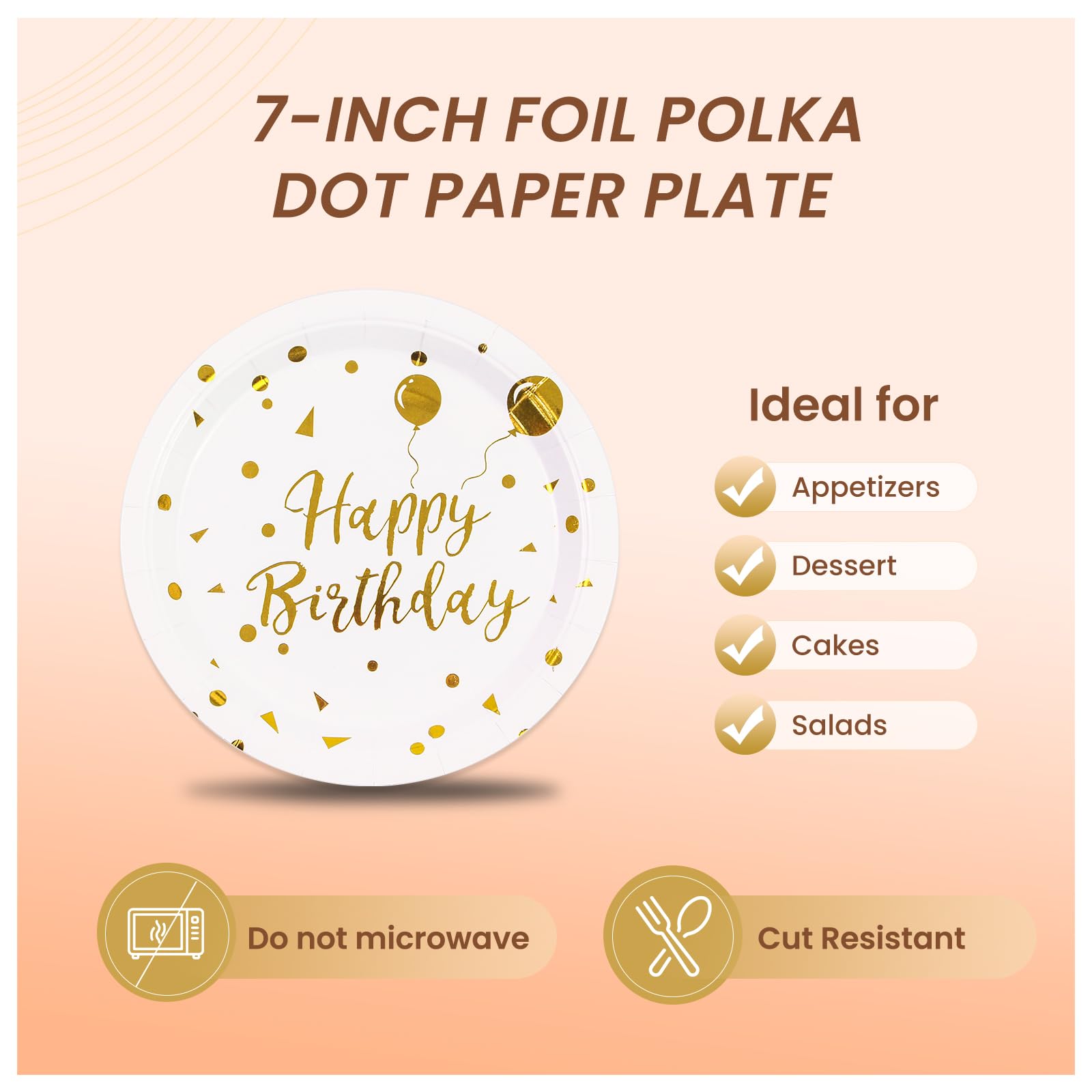 【STYLISH AND UNDERSTATED DESIGN】:The paper plates are white in color and designed with golden happy birthday, gold foil dots and triangles and golden balloons. These classic design elements can make your party more elegant and stylish while dining, very aesthetically pleasing, and I'm sure your guests will really love this design!