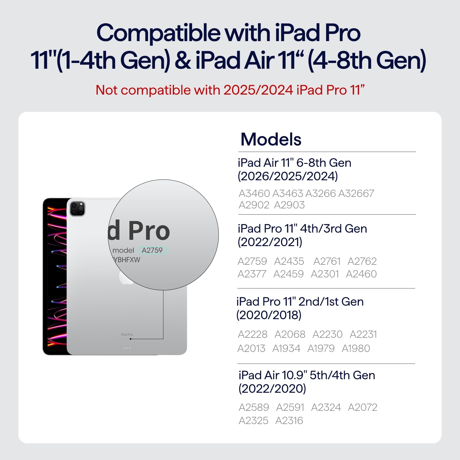 [Compatible Model] Only compatible with iPad Air M4/M3/M2 11 inch (2026/2025/2024), iPad Pro 11 inch 4th / 3rd / 2nd / 1st generation (2022/2021/2020/2018), and iPad Air 10.9 inch 5th / 4th generation (2022/2021). This folio works seamlessly with PITAKA MagEZ Case 2. (Note: NOT compatible with 2025/2024 iPad Pro 11 inch.)