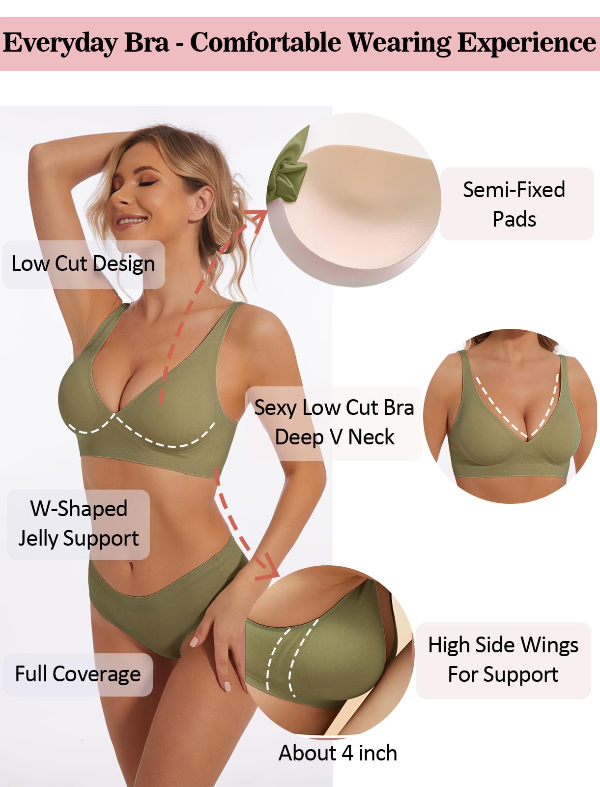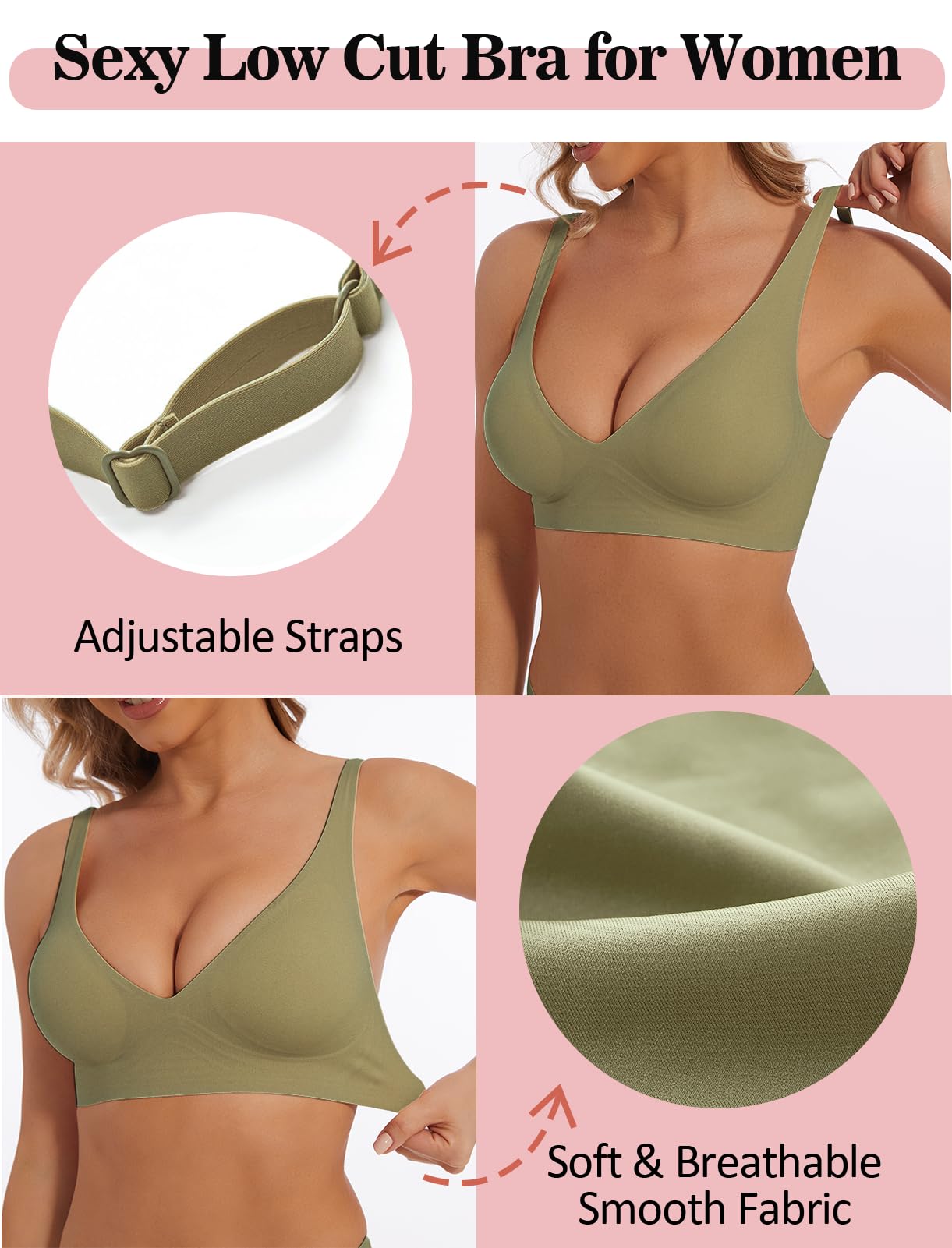 [Low Cut Bra for Deep V Neck - Slightly Push Up Effect]: This low cut bra provides seamless support for your breasts; full coverage bra with deep V-neck design gathers your chest and beautifies your body curves, giving you sexy cleavage look