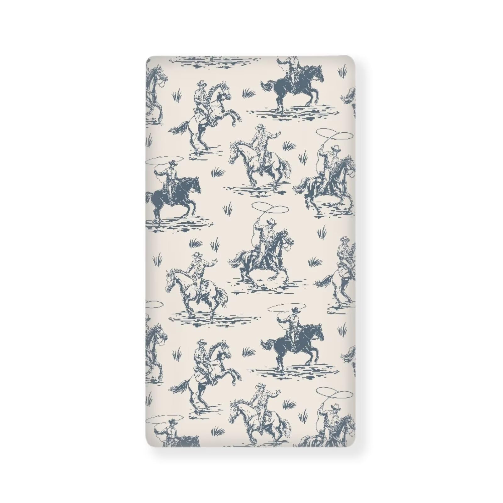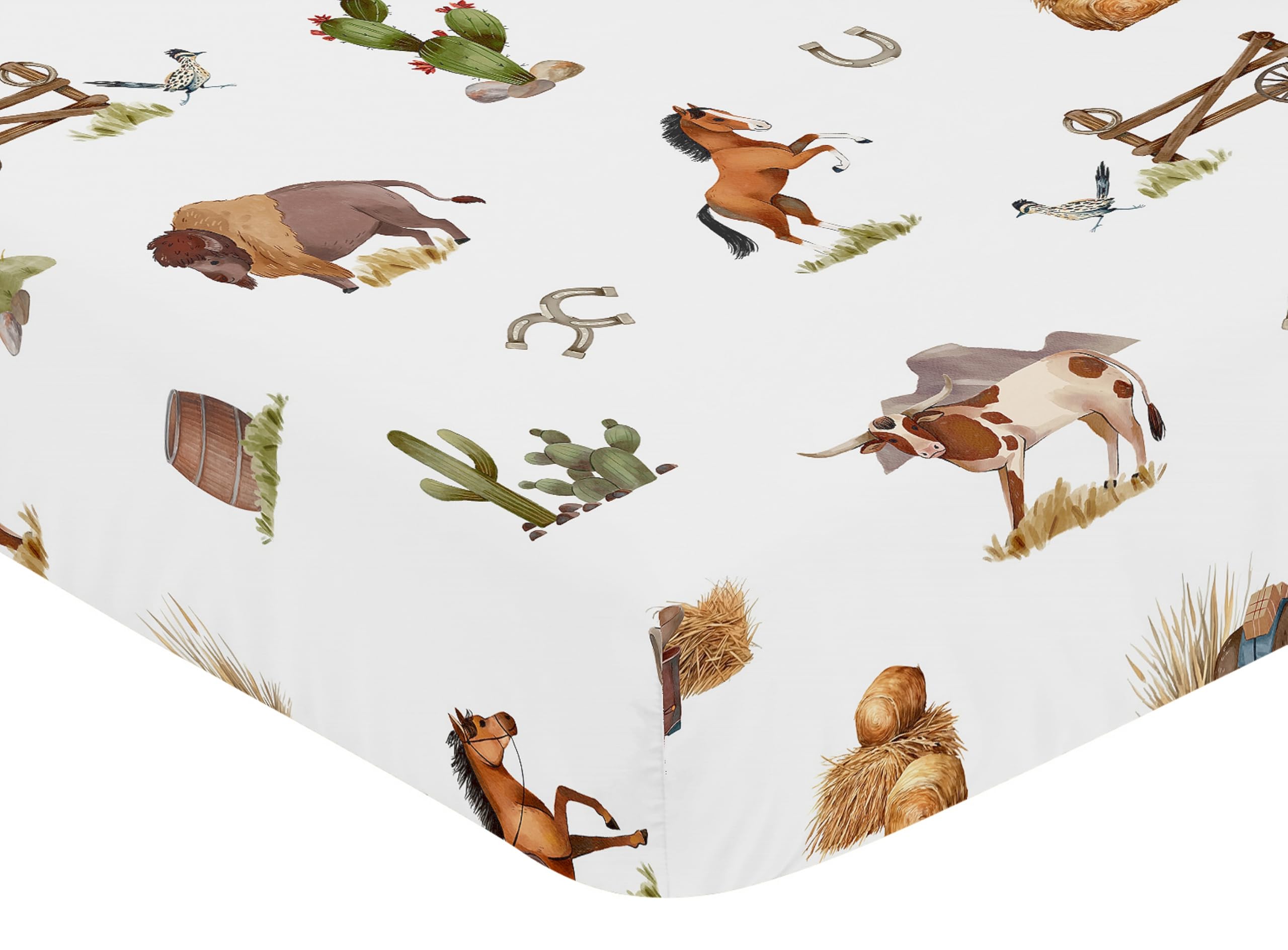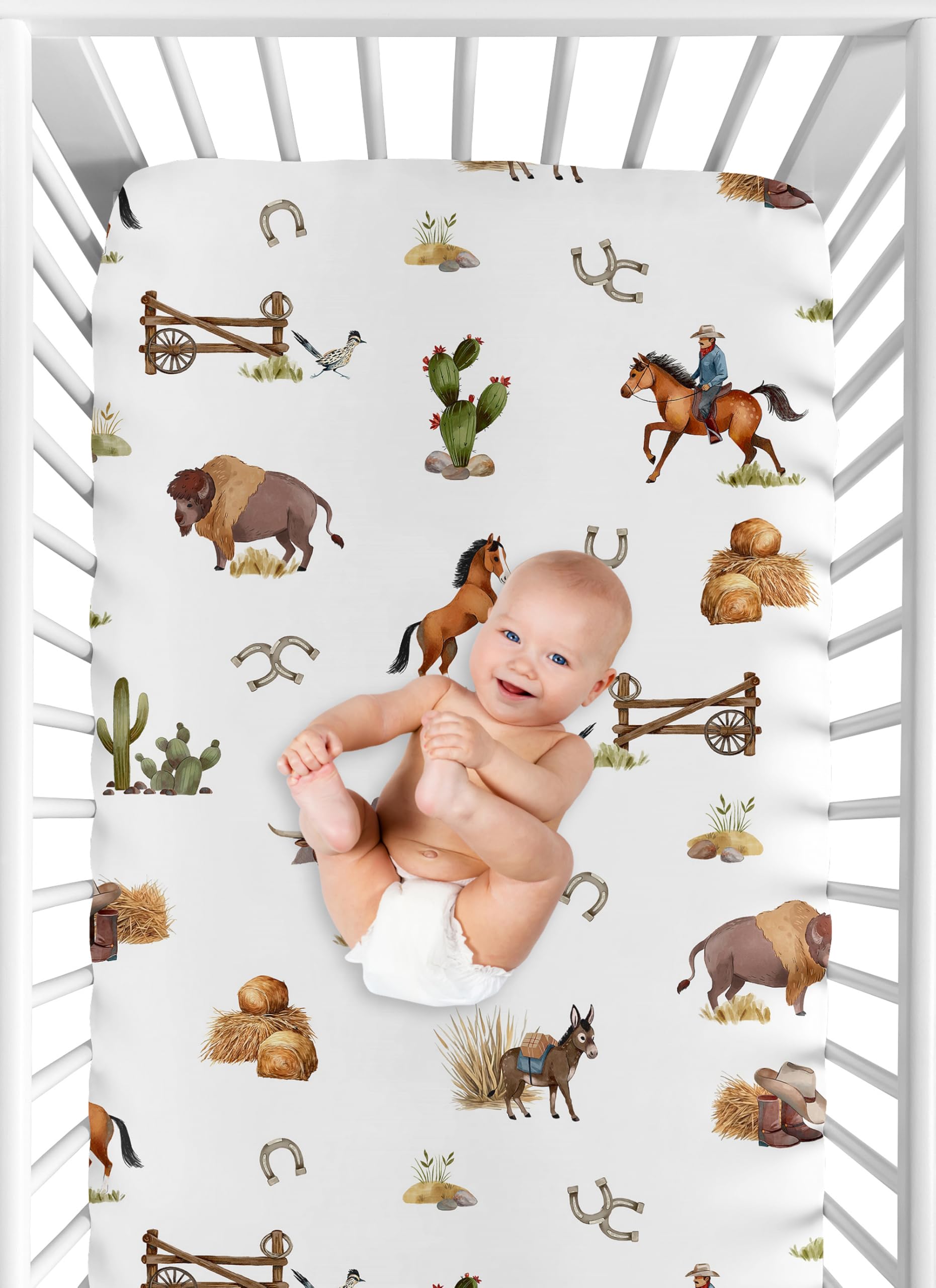 SNUG FIT: Includes (1) Fitted Crib Sheet 52in. x 28in. x 8in. Our newborn standard crib sheets fit snugly, with premium elastic sewn around the entire bottom edge for a secure fit on most standard sized cribs and toddler beds, to reduce shifting & bunching. This brushed microfiber crib sheet features an exclusive design of a taupe, brown, blue, red & tan wild west, south, horse, cow, farm animal, country western cowboy print & is gentle on delicate skin to foster a soothing sleep environment.