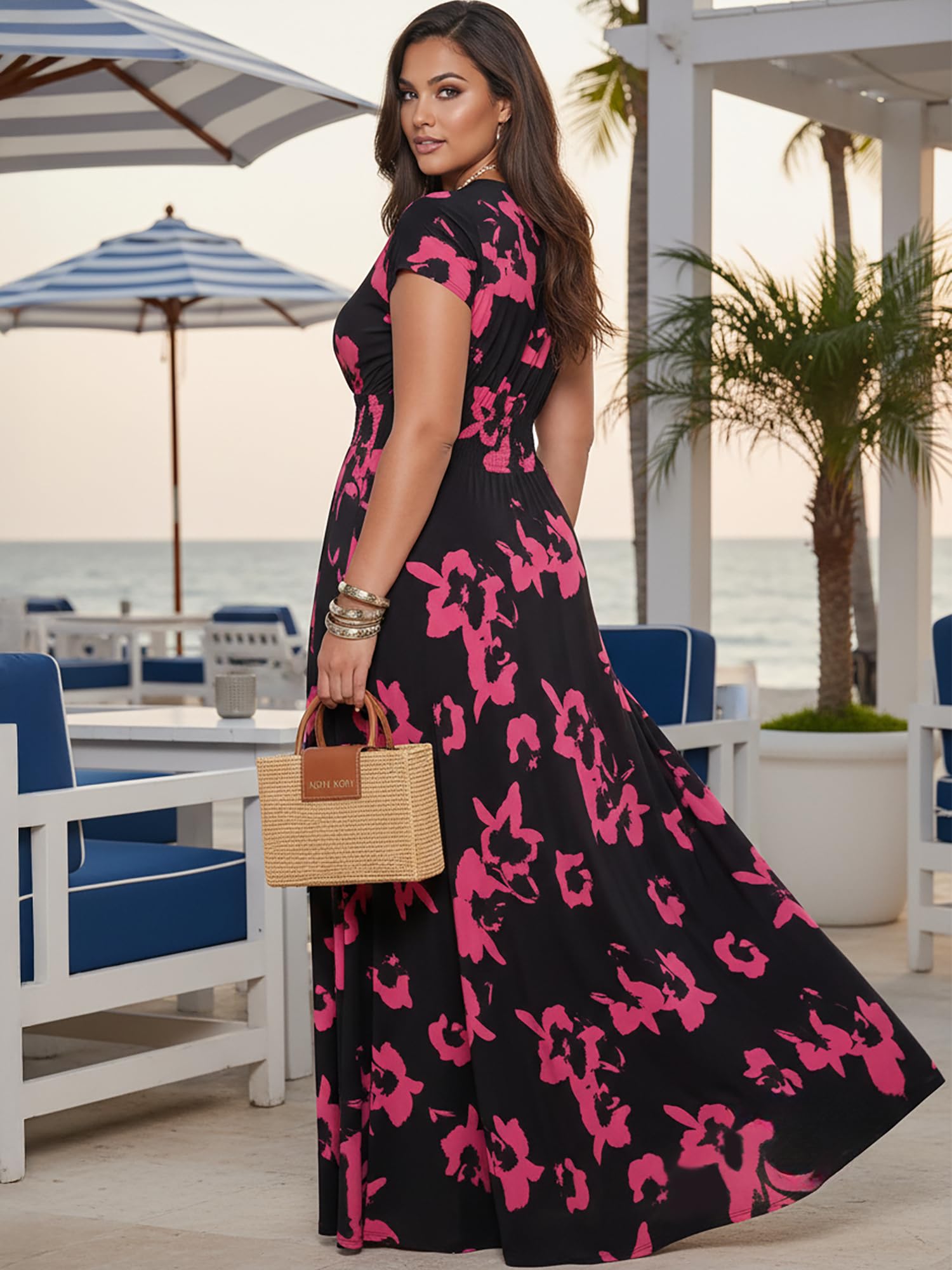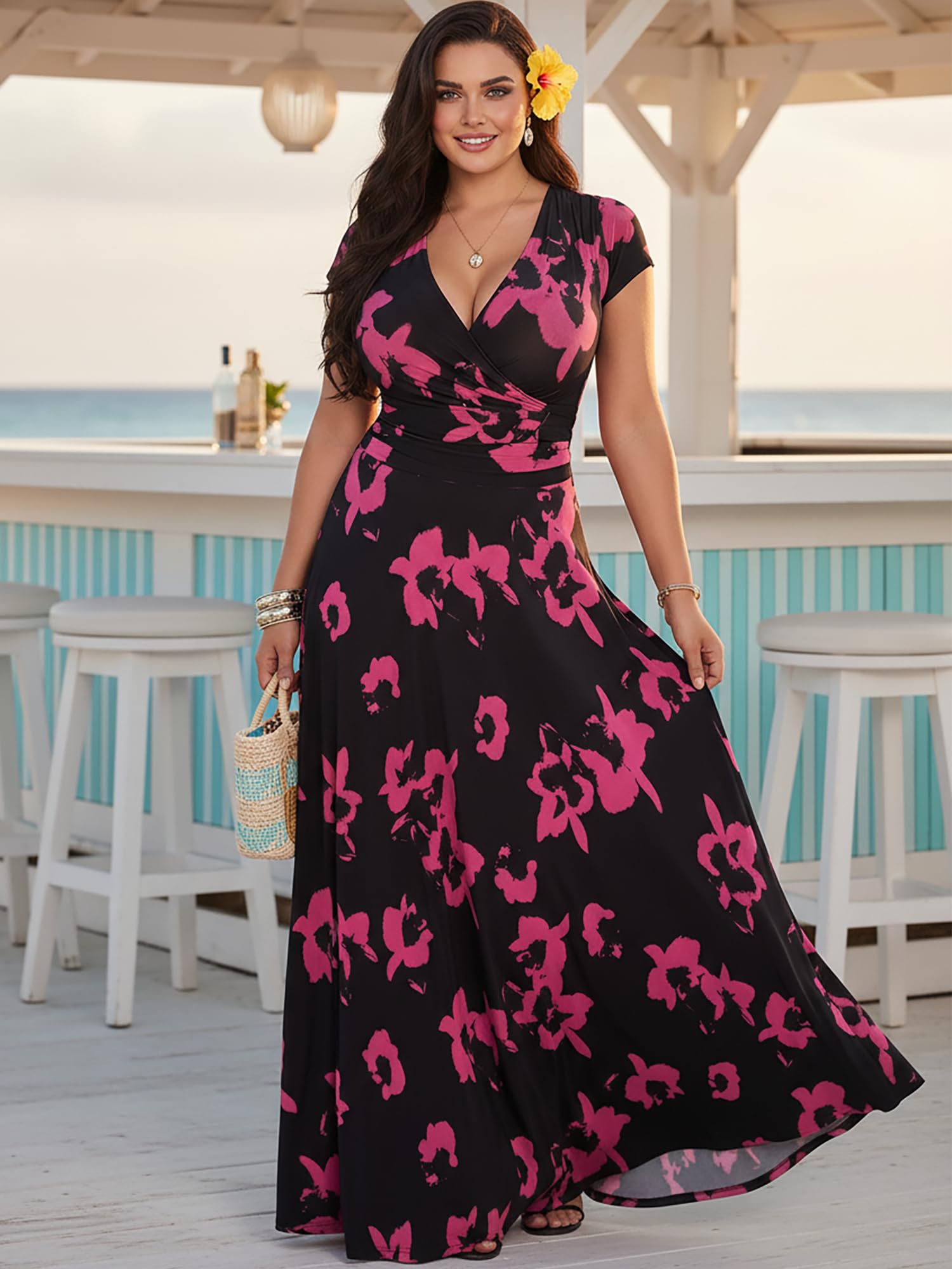 Beautiful outfit for curvy ladies; Black & Pink plus sized dress for big size girls; body hugging slimming maxi; cute sundresses for lady with curves; full figure short sleeves gowns; large sizing loose fitting comfortable womans clothing