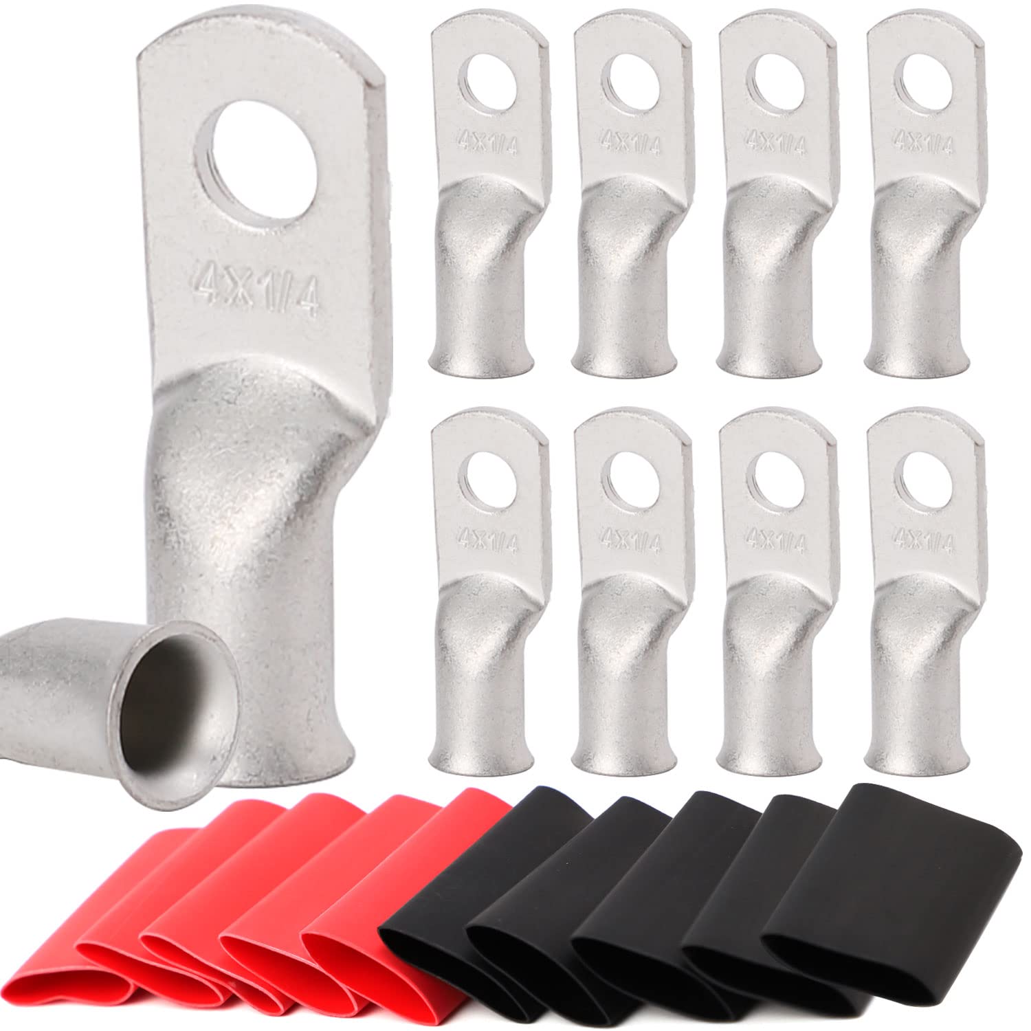 【What You Get:】 10Pcs per pack of 4 Guage (AWG) 1/4" marine grade tinned copper lugs ring terminals closed end termination ring terminals with 10 Pcs 3:1 Dual Wall Adhesive Heat Shrink Tubing Tube for your work(5pcs Black and 5pcs Red).