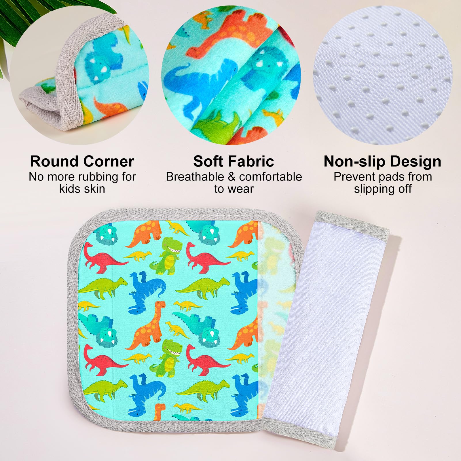 Universal Size & Anti-Slip: Our seatbelt covers for kids come in two sizes—small (5.9 × 2.6 inches) and large (9.4 × 6.3 inches)—specially designed for babies and kids, fit most car seats, strollers and pushchairs; The inside of the seat belt covers is an anti-slip design, keeping it in place with no sliding
