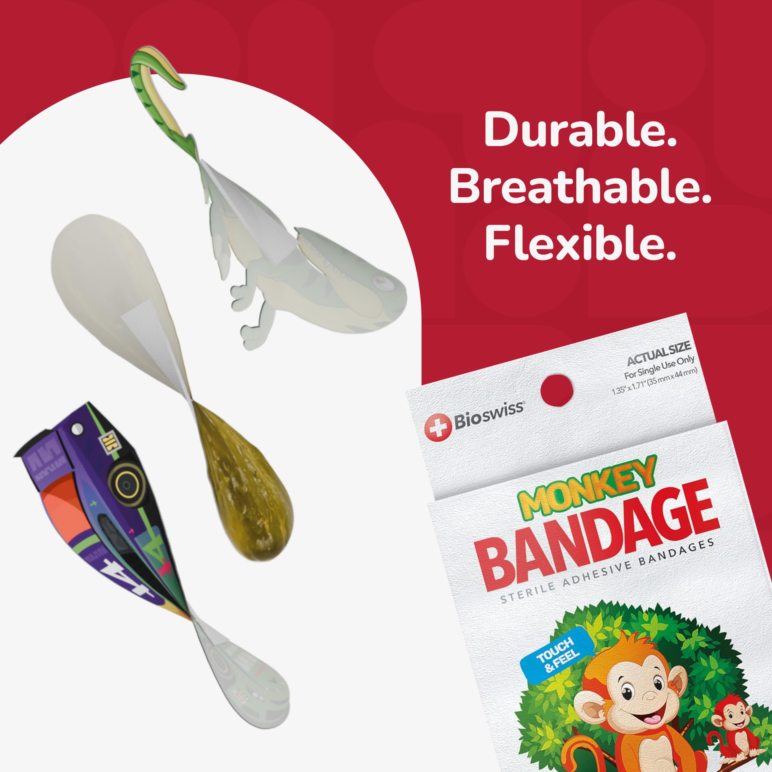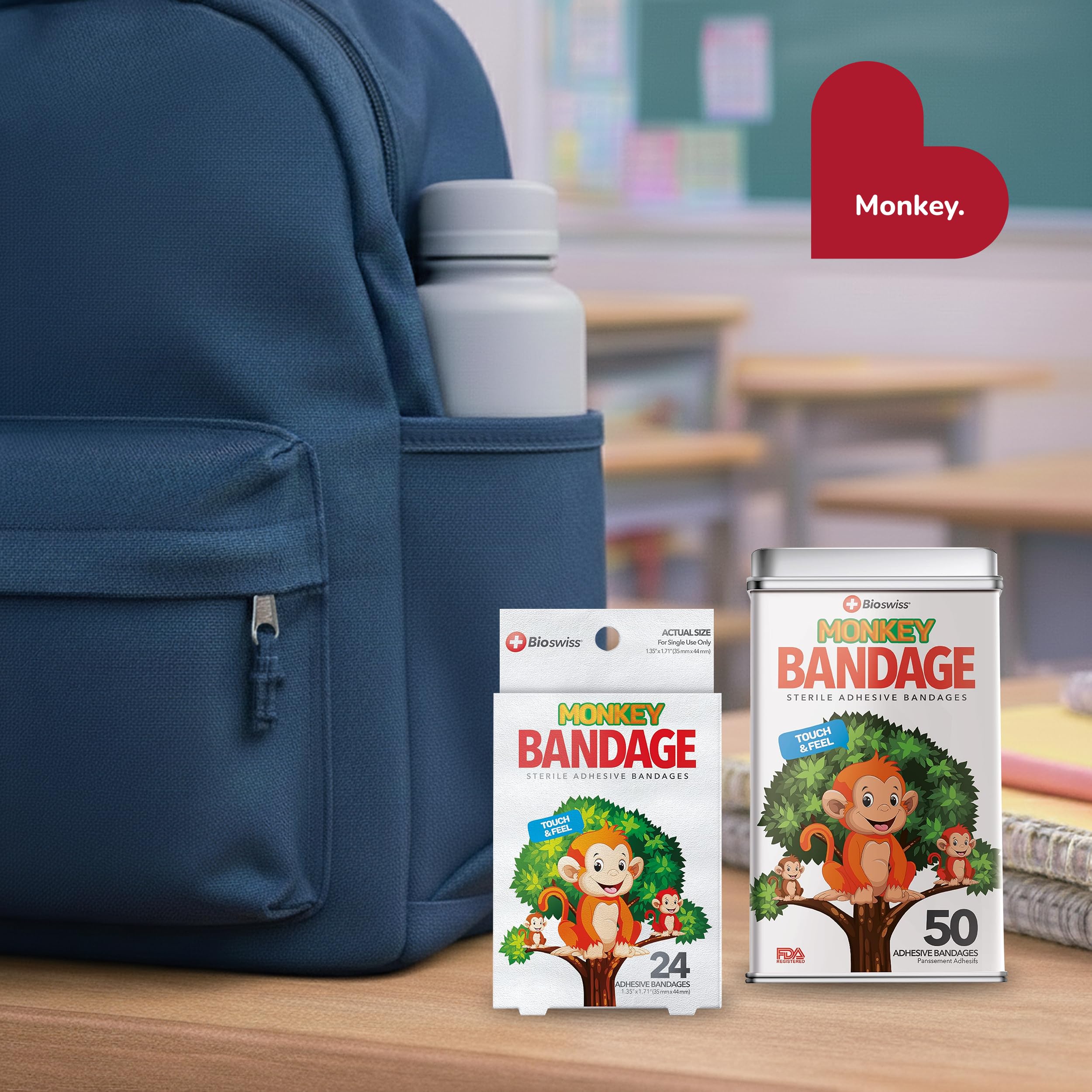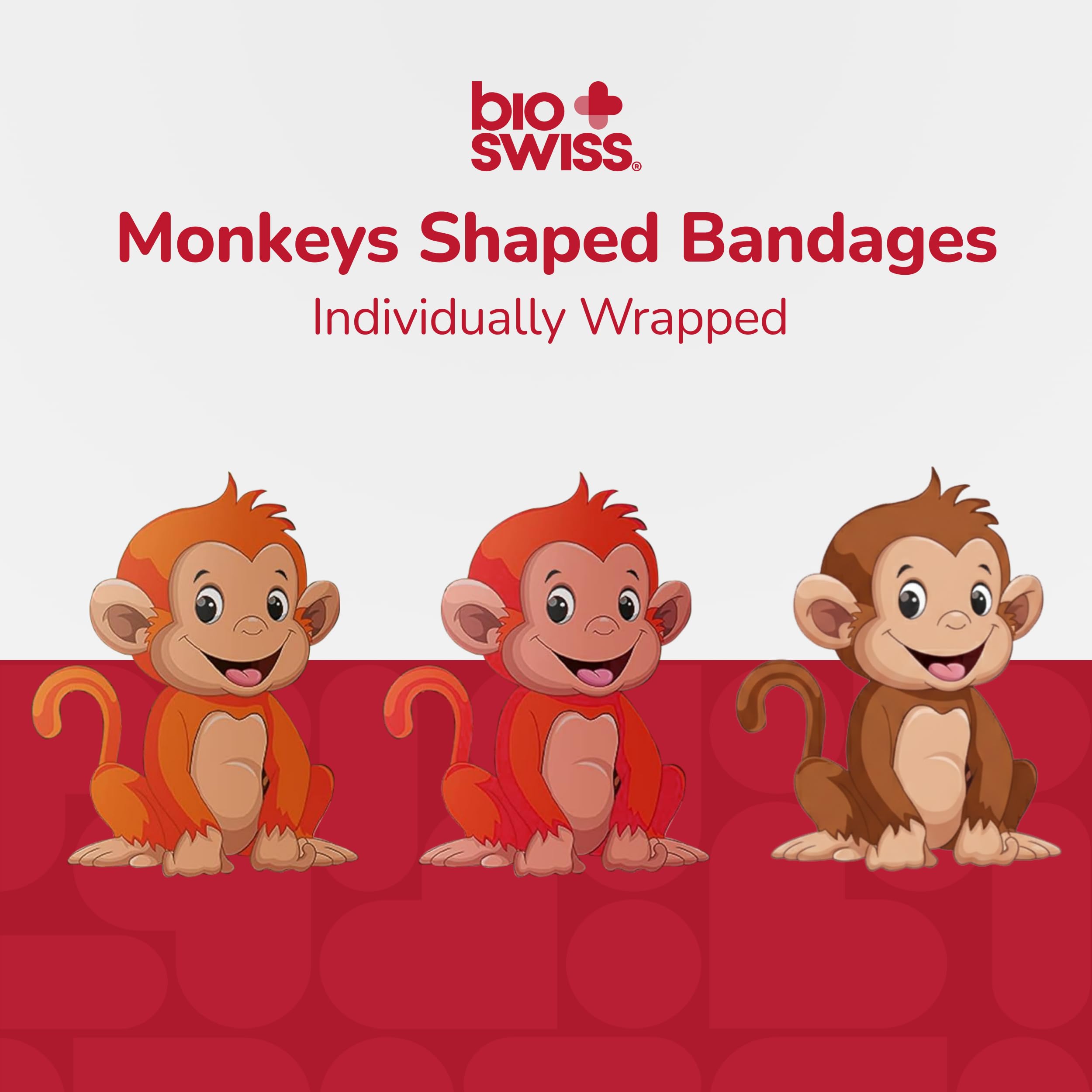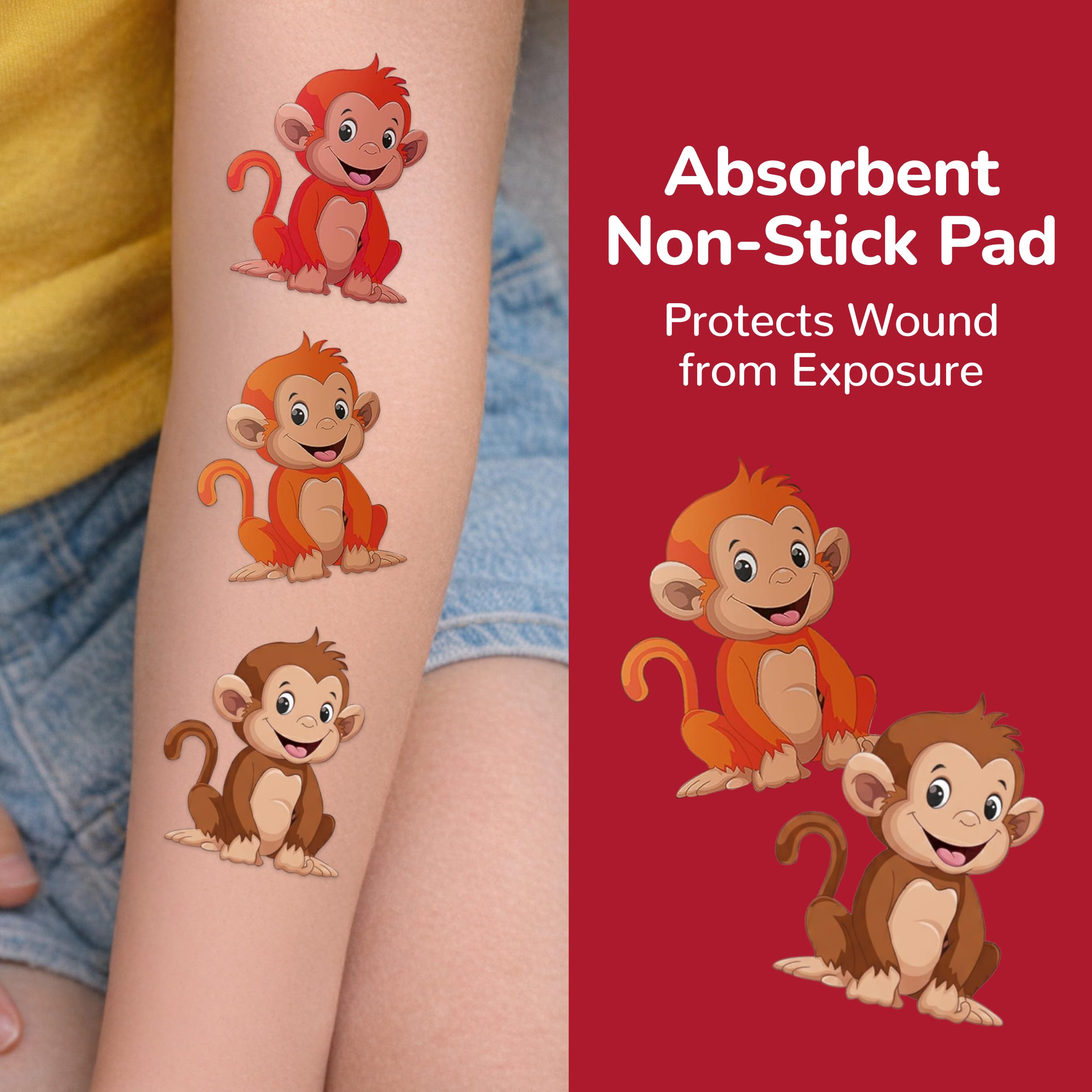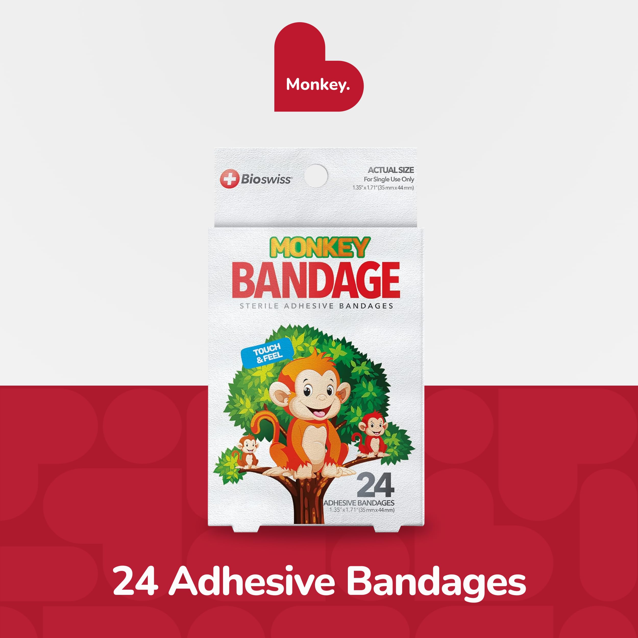 24 MONKEY BANDAGES: Monkey-shaped adhesive bandages pack helps protect cuts, scrapes, and minor wounds while making healing less stressful; bandages come in 3 assorted styles