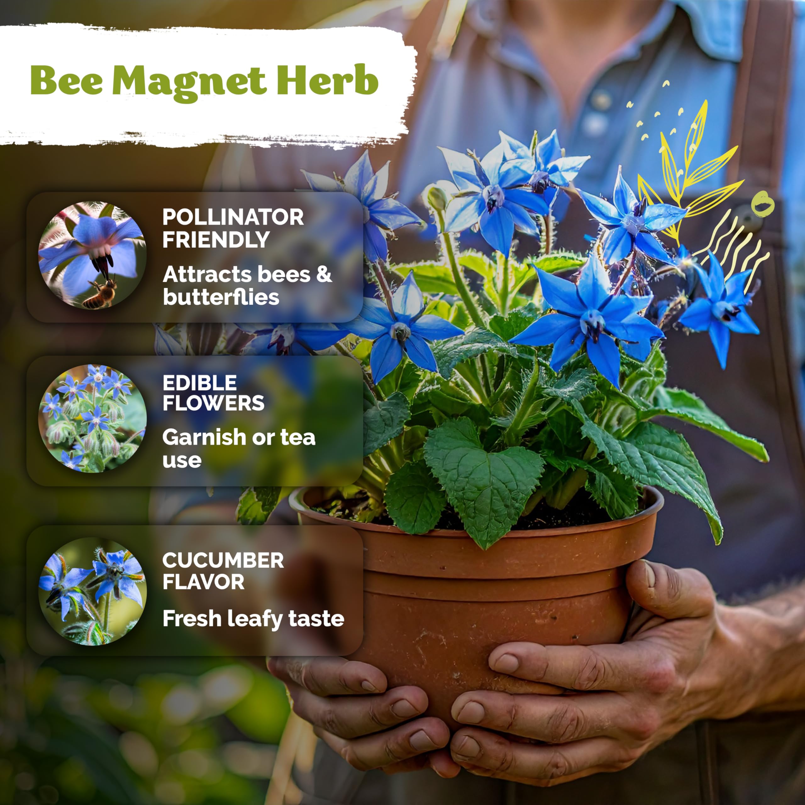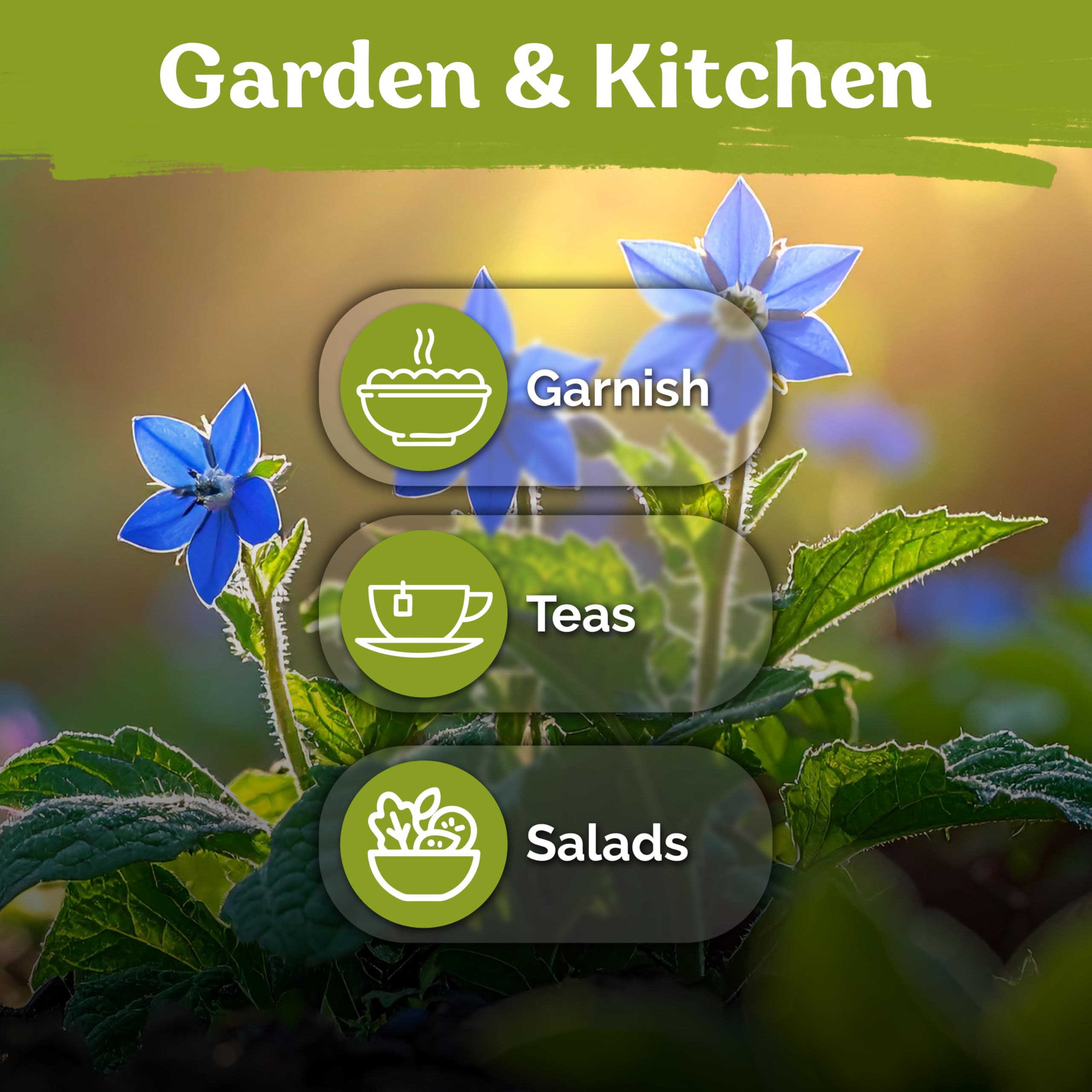 Pollinator-Friendly Blooms: Blue borage flower clusters draw honeybees and butterflies all season. Edible flower seeds brighten teas and desserts - perfect for a sunny herb garden.