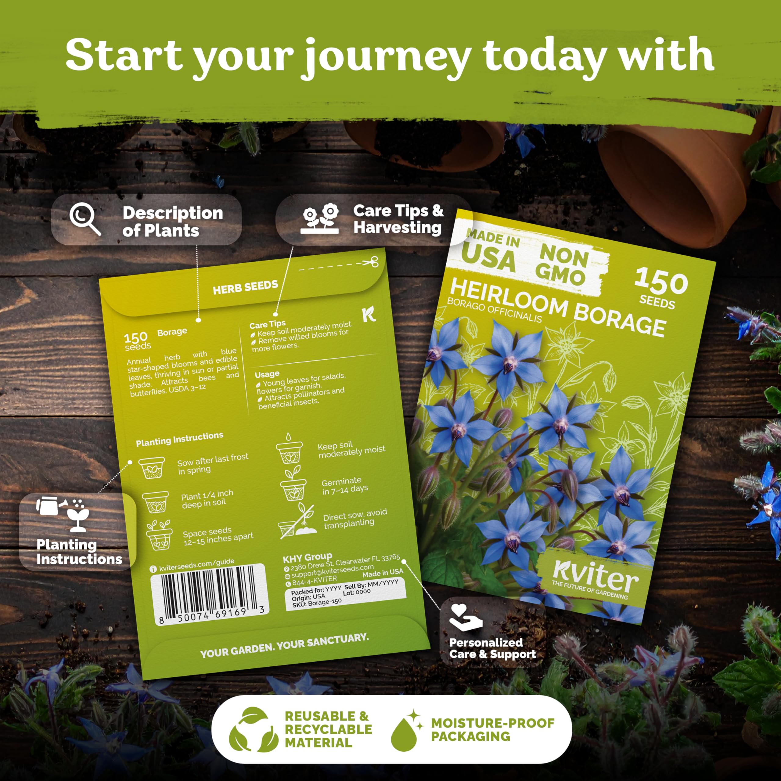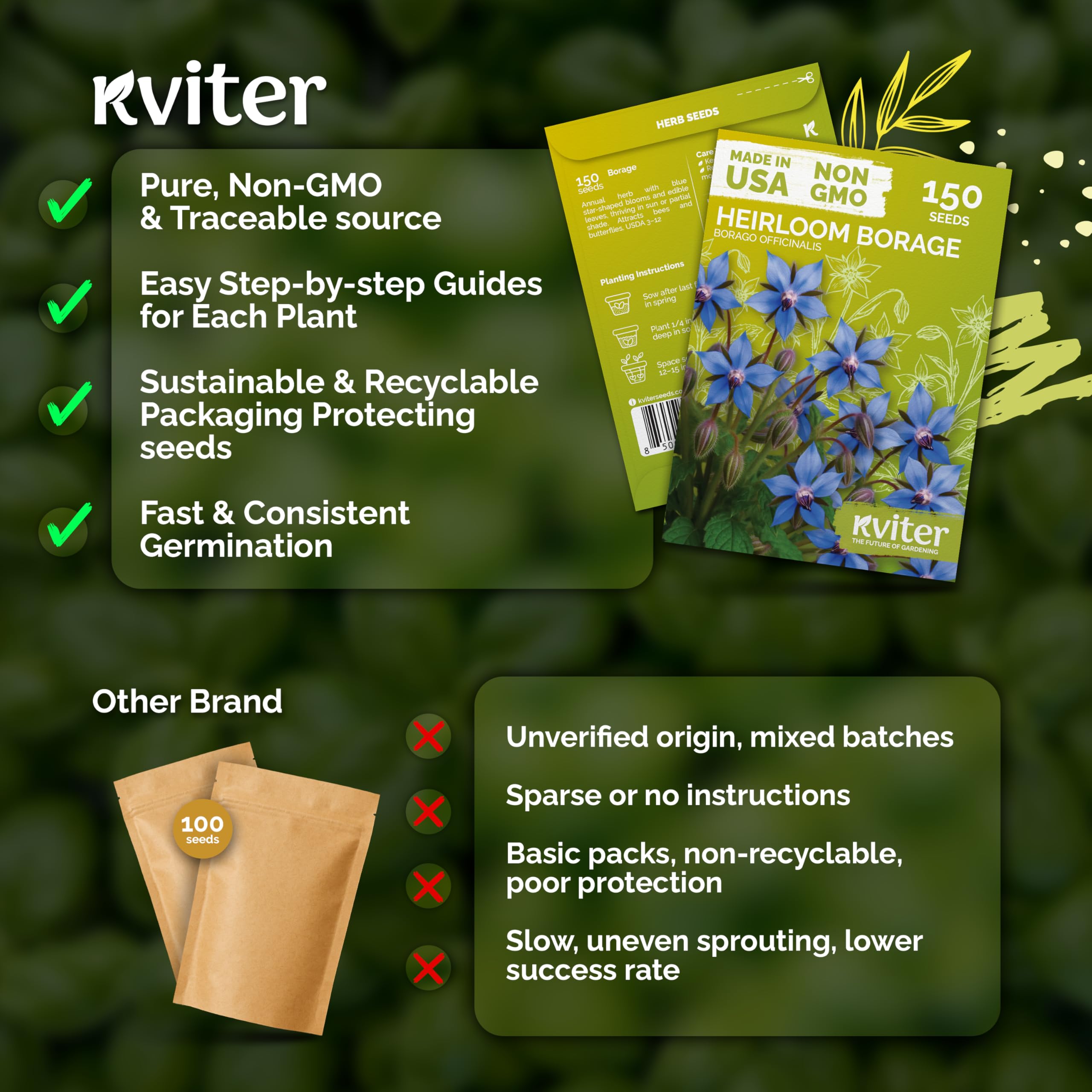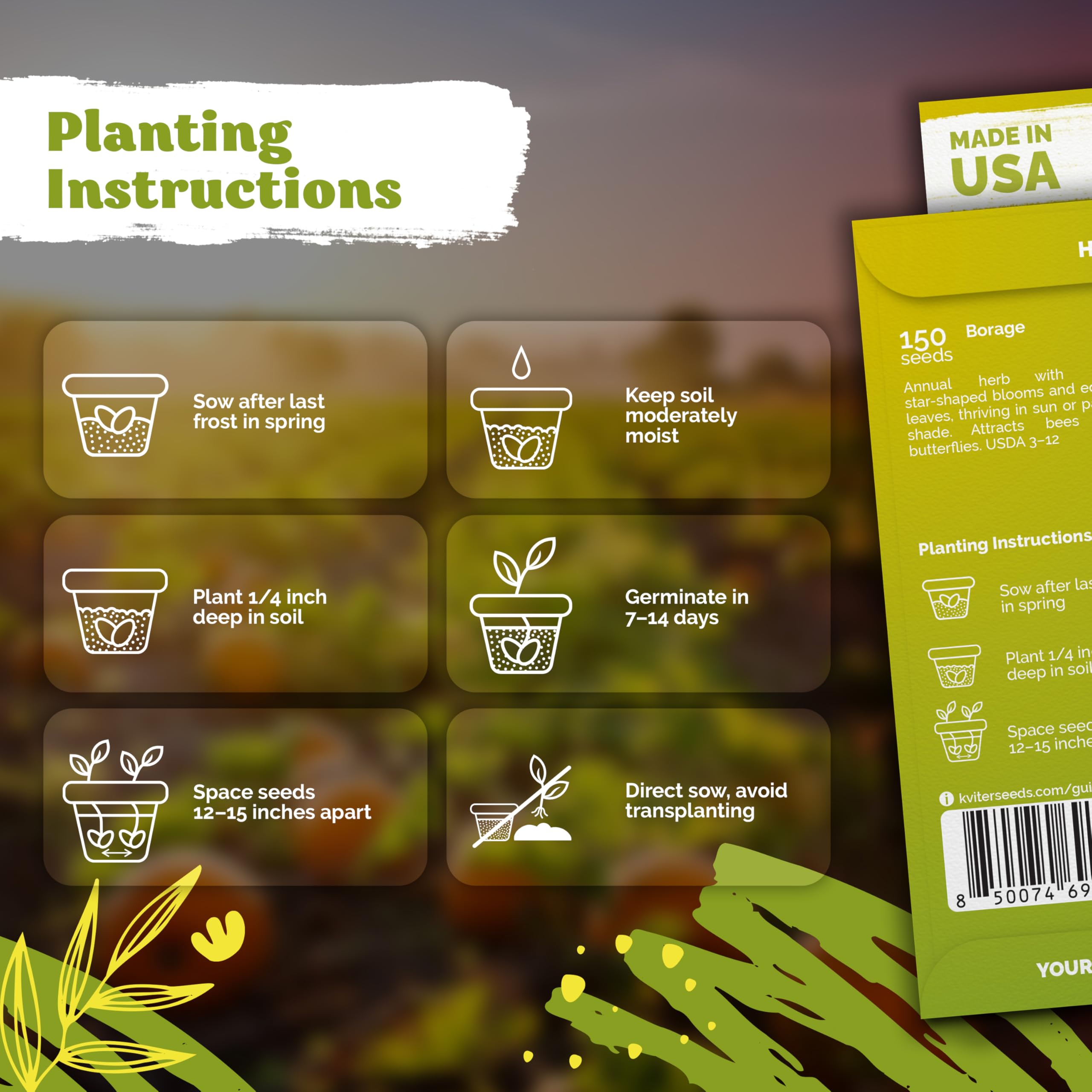 Quick, Reliable Start: Germination in 7-14 days at 59-77°F. Heirloom borage seeds thrive with moderate watering and mulch to keep foliage dry. Borage seed is ideal option for outdoor & indoor herb garden, low-fuss gardens.