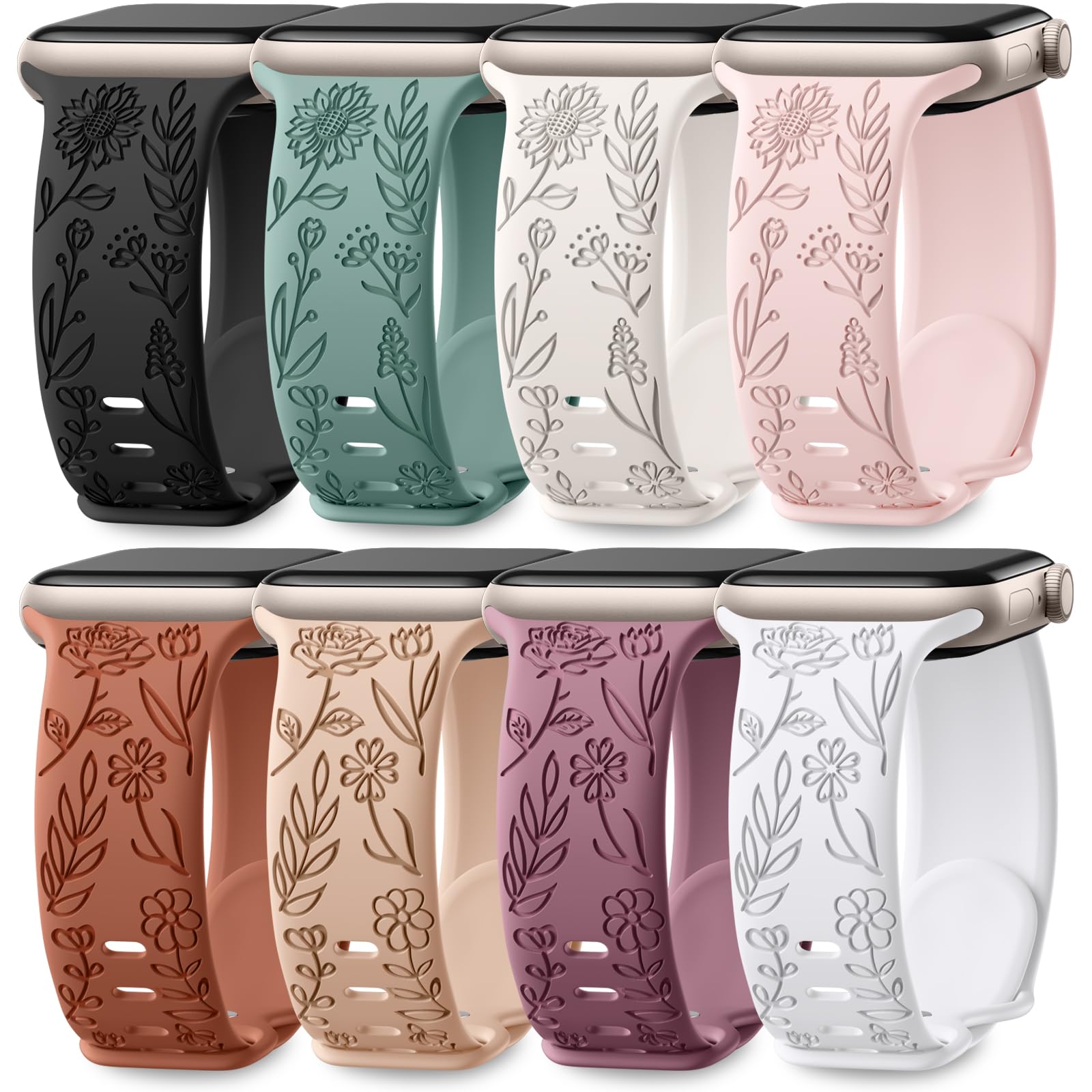 ✅ Floral Elegance for Your Apple Watch: Elevate your Apple watch style with our 8 pack floral engraved iWatch bands. Featuring intricate rose and cheerful sunflowers, they combine expert craftsmanship with trendy colors. Perfect for formal elegance and a touch of modern flair for casual wear