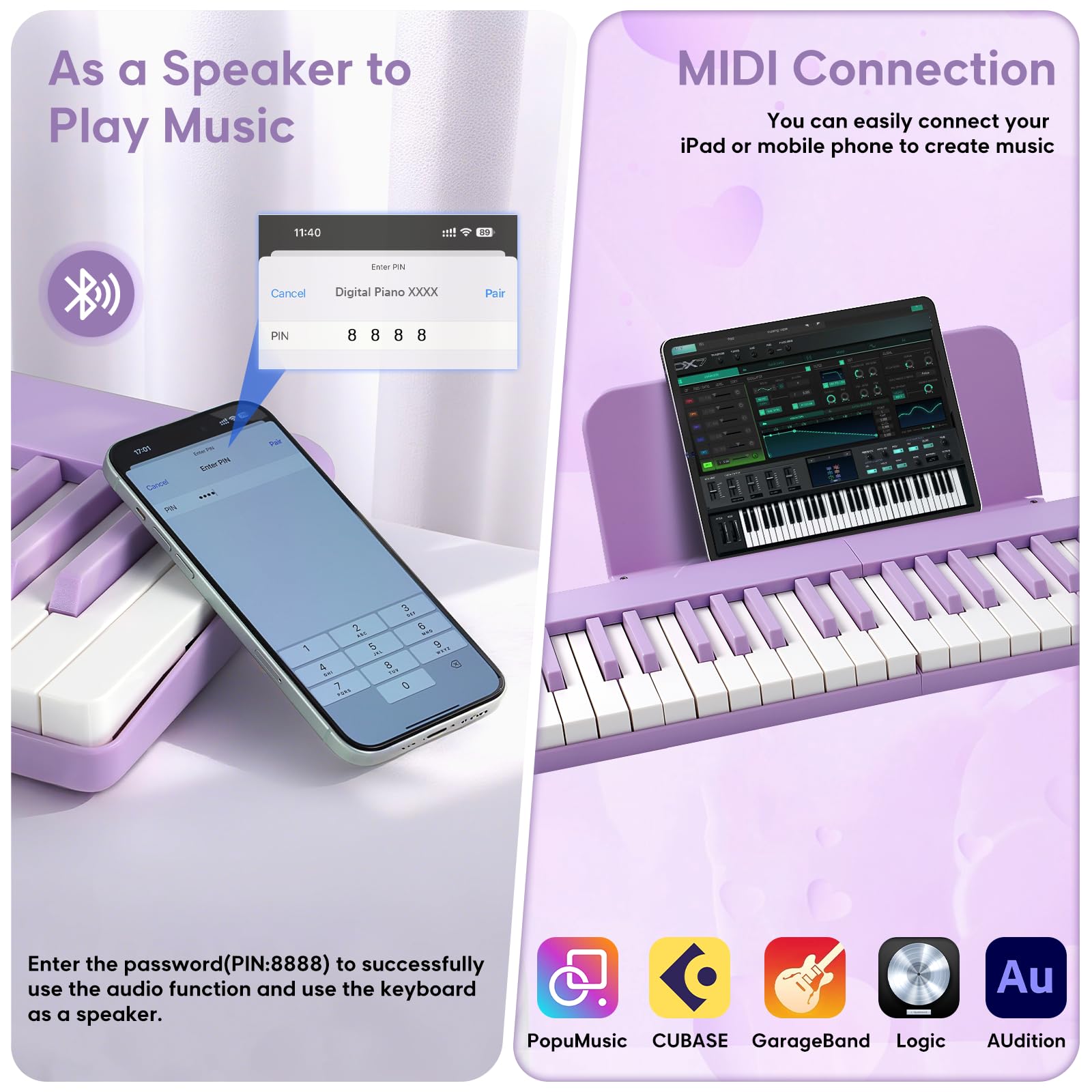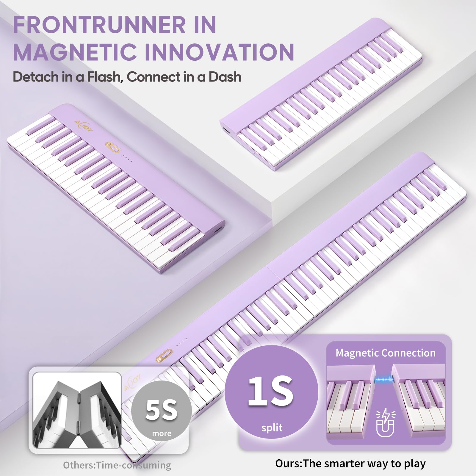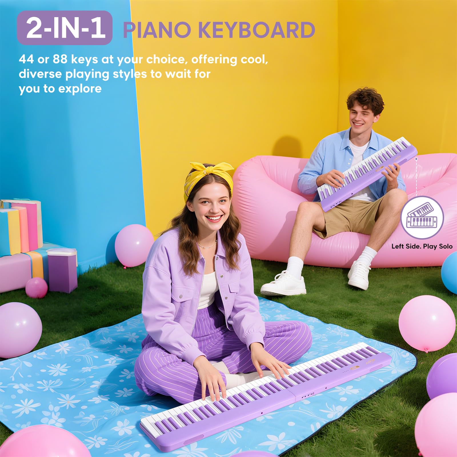 MAGNETIC CONNECTION: Our keyboard features a precision-engineered magnetic connection that connects and disconnects in just one second. Split it to play the 44-key left keyboard independently for easy travel, or connect it to create a complete 88-key keyboard for immersive play. You can also mix/match your liked keyboard colors.(purple/pink/black)