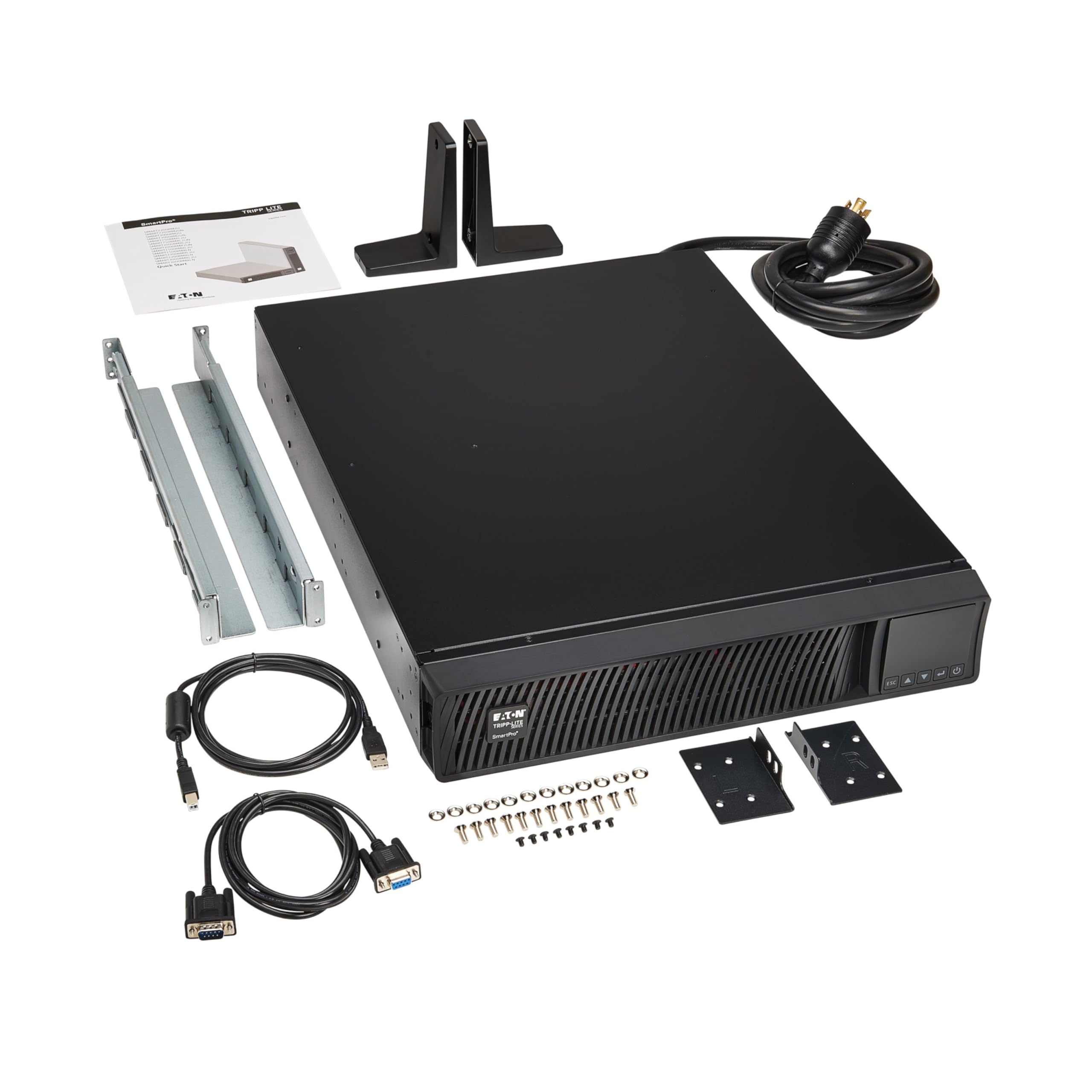 Tripp Lite SmartPro Line Interactive UPS with enhanced LCD interface offers network-grade power protection for critical server, network and telecommunications equipment. Line Interactive Uninterruptible Power Supply (UPS) with built-in Auto-Voltage Regulation (AVR) actively corrects brownouts and overvoltages back to usable levels while maintaining a full battery charge in case of power failure. Tripp Lite's unique configuration excels in exceptionally poor-power environments with two separate levels of voltage boost to correct both slight undervoltages and severe brownout conditions. Interactive LCD interface reports UPS operating mode, detailed UPS and site-power data, plus enables a variety of UPS setup and configuration options. Super-fast switchover from line to battery power occurs within milliseconds to maintain operation of connected equipment without interruption or reboot. 96% line-mode efficiency offers reduced heat emissions and operating costs. Network management interfaces support communications via USB port, DB9 serial port and pre-installed WEBCARDLX network management interface card. The Java-free HTML5-based WEBCARDLX interface enables full remote access for site power and UPS status monitoring, configuration, control and email notifications via secure web browser, SNMP, telnet or SSH. It supports 10/100 Mbps auto-sensing for optimum communication with an Ethernet network. Optional EnviroSense2 modules (sold separately) provide a variety of environmental monitoring capabilities. Protocols supported include HTTP, HTTPS, SMTP, SNMPv1, SNMPv2, SNMPv3, telnet, SSH, FTP, DHCP and NTP. HID-compliant USB port enables integration with built-in power management and auto shutdown features of Windows and Mac OS X. Network communications ports enable detailed monitoring of equipment load levels, self-test data and utility power conditions. PowerAlert UPS monitoring software is available via free download. Switched output load banks enable scheduled and real-time remote reboot and load shedding of select outlets. Emergency Power Off (EPO) interface. LCD display panel easily rotates for viewing in rackmount or tower configurations. Audible alarm with push-button momentary alarm-cancel and silent-mode configuration options. Programmable self-test. Field-replaceable, hot-swappable battery modules.