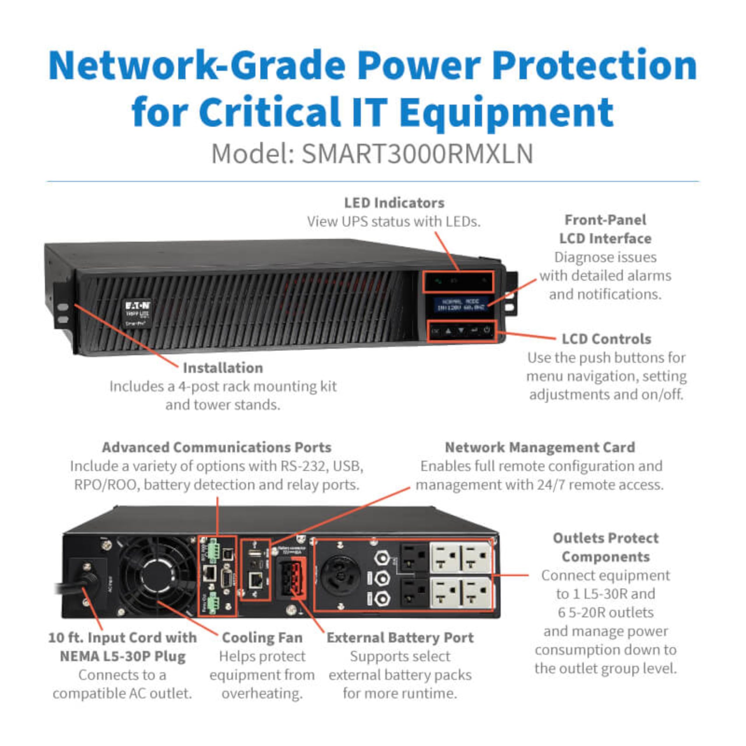 ADVANCED POWER FEATURES: Batteries are user-replaceable with Eaton's EBP-1617 battery pack. UPS enables power management at the outlet group level. LCD screen provides multiple views to monitor power status and rotates for rack or tower setups.