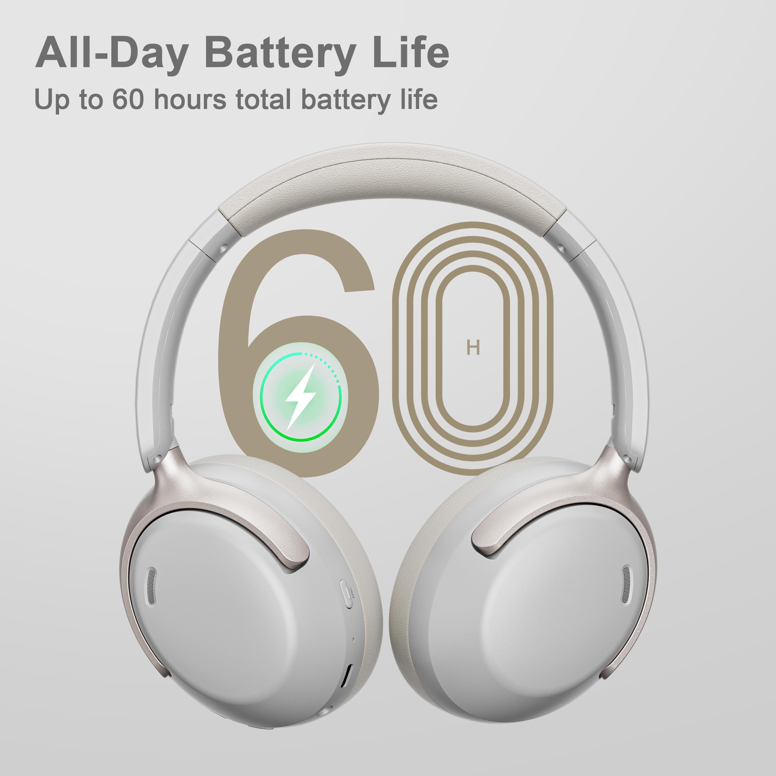 [ 60 hours of music enjoyment , fast charging ] : With a built-in 800mAh battery, you can enjoy 50 hours of noise cancellation in the world. Turn off the noise cancellation mode to extend to 60 hours, charge it for 4 hours on a 5-minute charge, fill the entire earbuds in 2.5H, or plug in a 3.5mm stereo audio cable to extend the battery life when the battery is low.