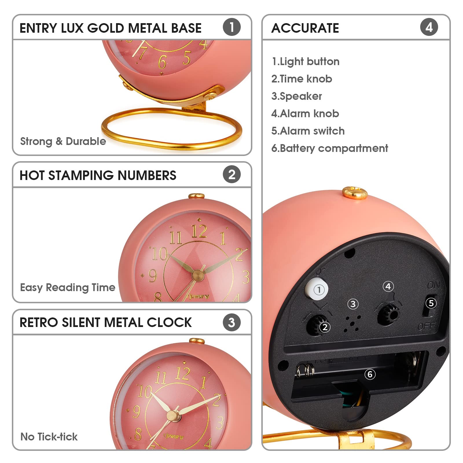 [QUALITY]Metal material, Quality Gold metal base is strong and durable, Hot stamping numbers and Gold hand for easy reading time, Entry lux and Retro design.