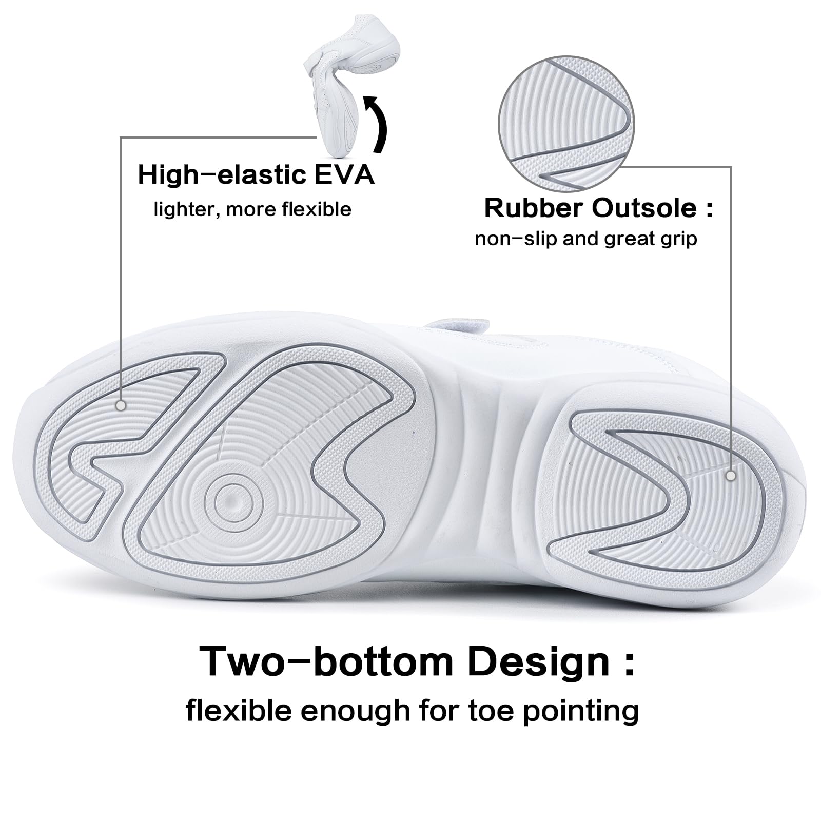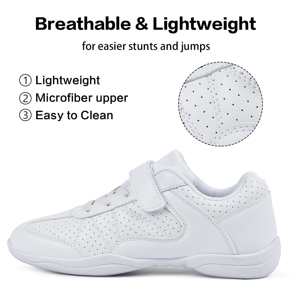 Flexible & Soft Cheerleading Shoes: Microfiber upper and flexible rubber outsole allows cheerleaders to tumble, stunt, and jump with ease. These white cheer shoes for girls are flexible enough for toe pointing.