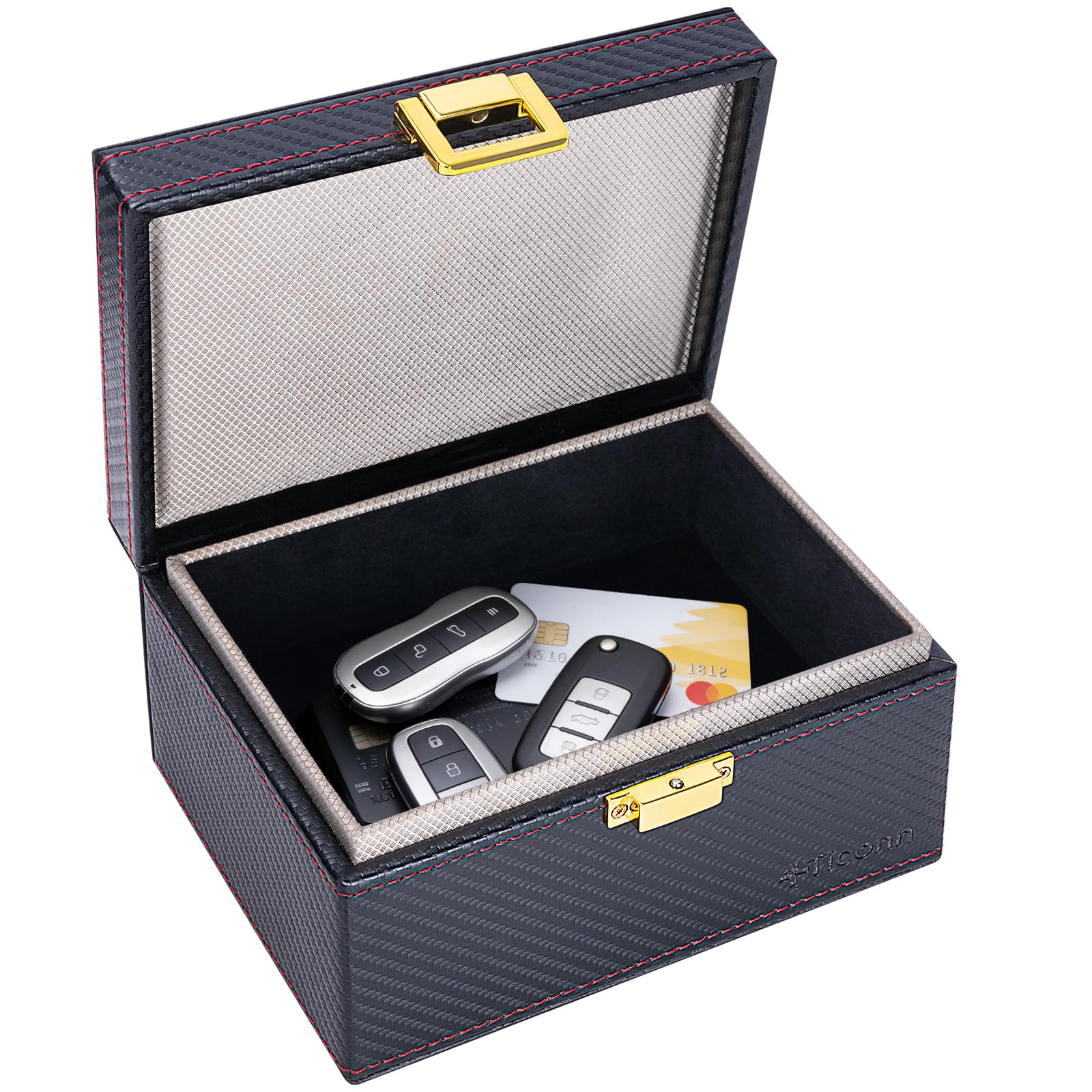 Premium Quality: TICONN Faraday bag features premium carbon fiber-textured material with dual-layer shielding that blocks WiFi, Bluetooth, GPS, RFID, NFC, and car key fob signals while providing water resistance; It is packaged in a gift box, making it a stylish and luxurious gift
