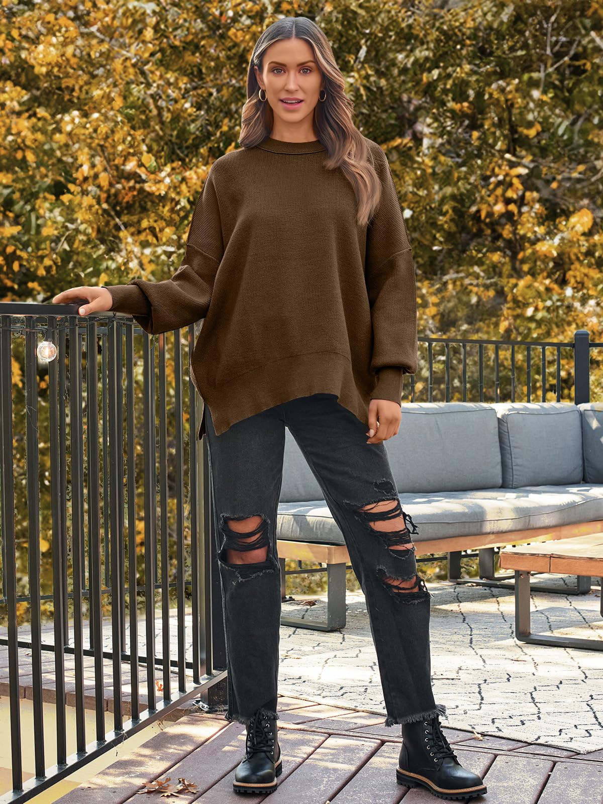 Great Features: UNIQUE OUTSIDE SEAM DESIGN, crewneck long sleeve sweater, tunic tops for leggings, side split hemline, oversized design, vertical grain cuffs make it more chic