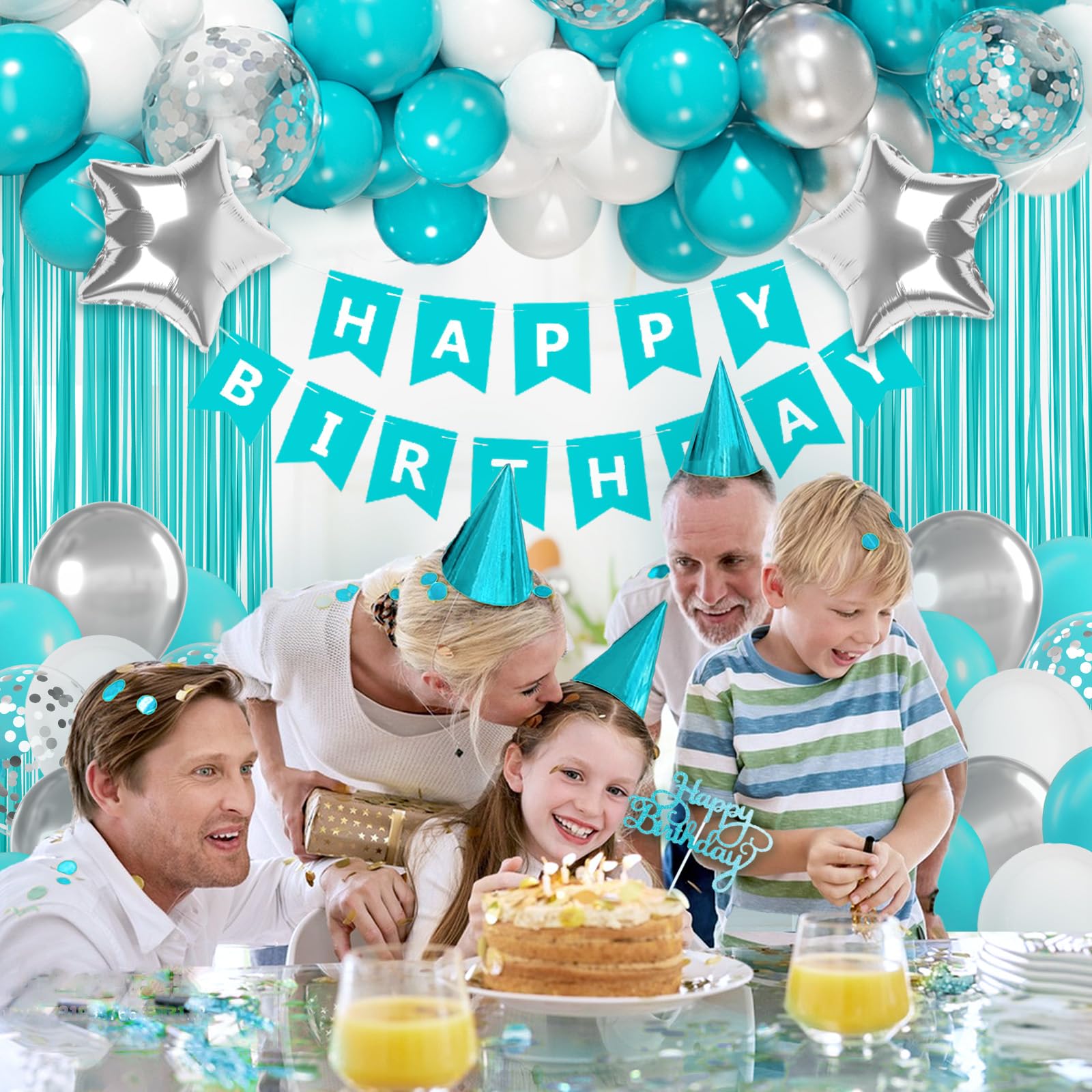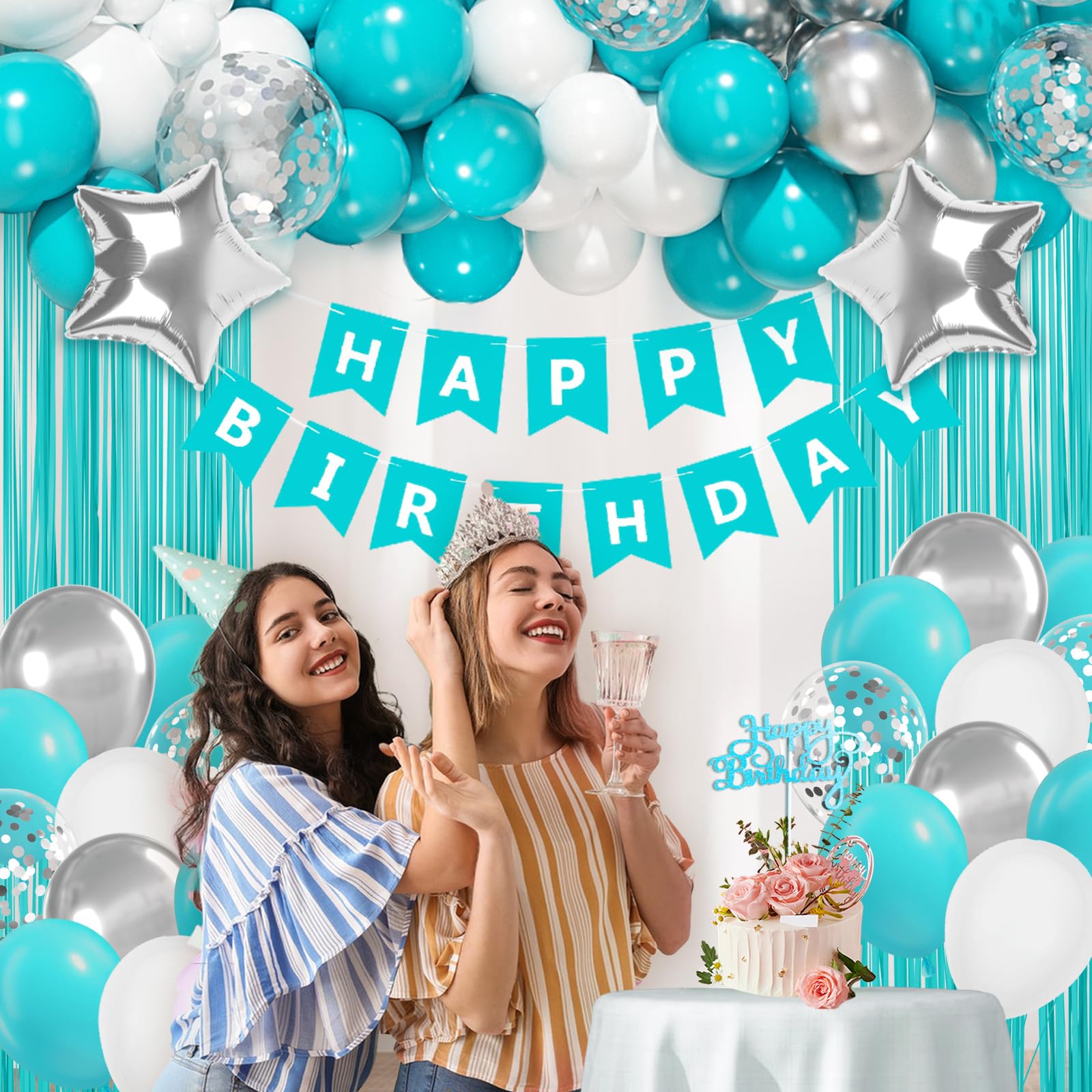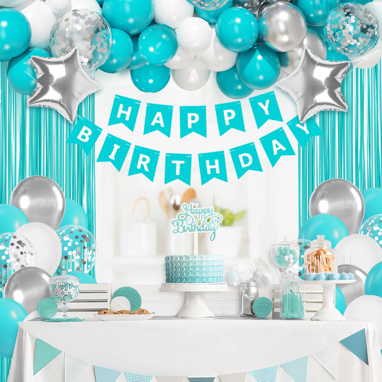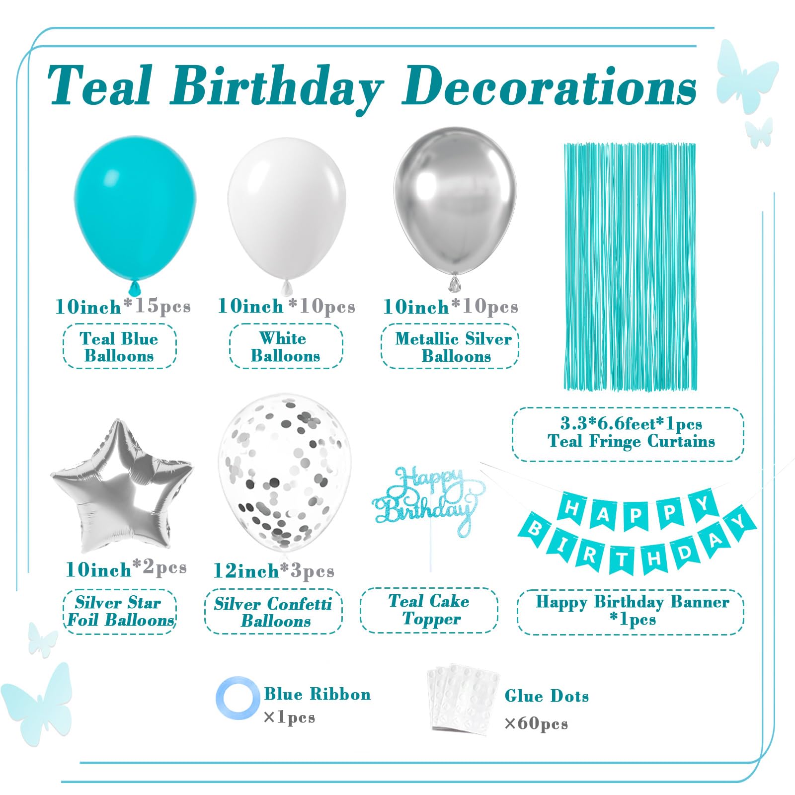 Package Included: The turquoise birthday decorations kit include 10inch teal balloons x15, 10inch white balloons x10, 10inch silver balloons x10, 12inch silver confetti balloons x3, teal happy birthday banner x1, silver star foil balloons x2, teal fringe curtains x1, teal cake topper x1, glue dots x60, blue ribbon x1