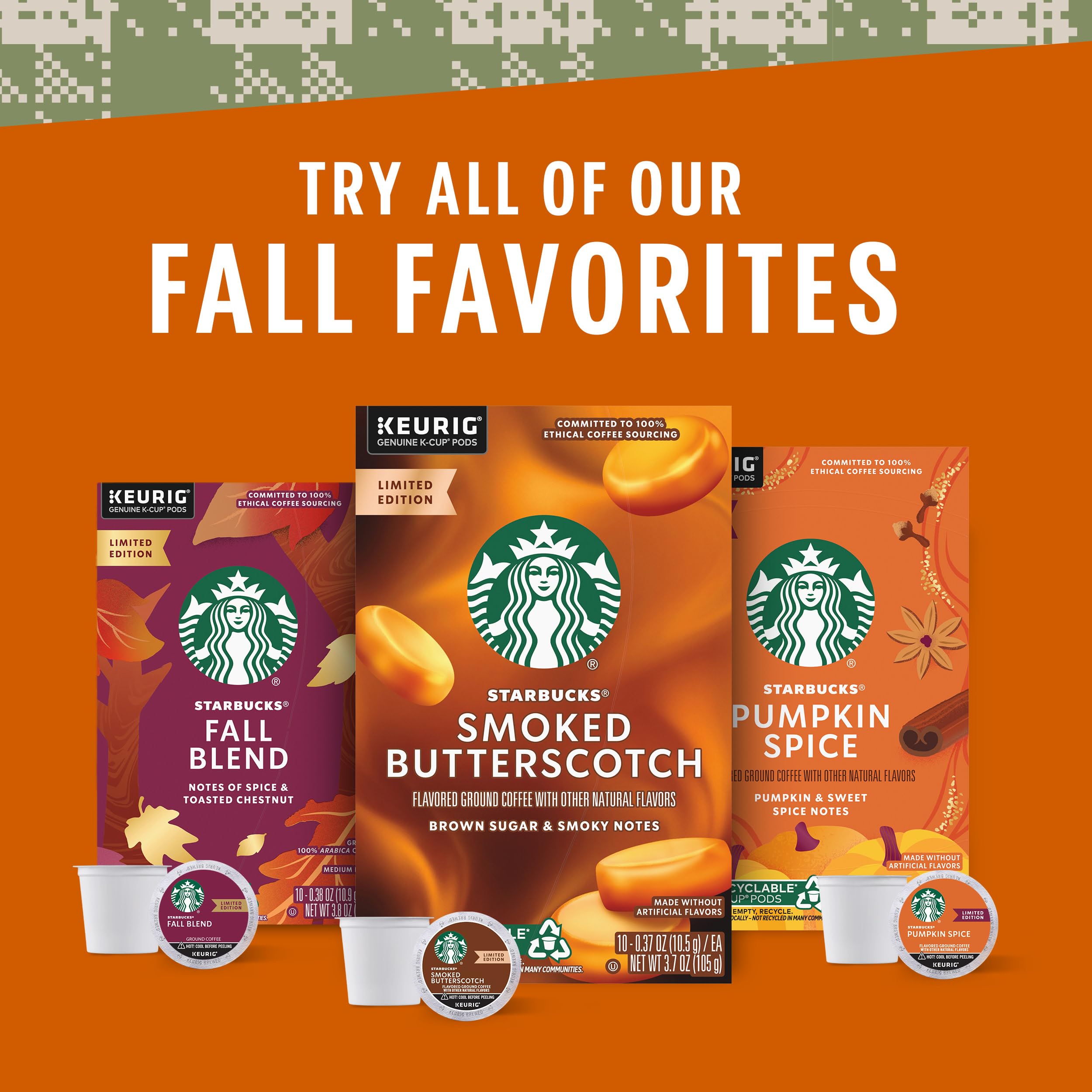 PERFECT FALL PICKS: With seasonals like Starbucks Pumpkin Spice Naturally Flavored Coffee, Starbucks Smoked Butterscotch Naturally Flavored Coffee and Starbucks Fall Blend, you can find the perfect fall picks for your cup and savor every sip