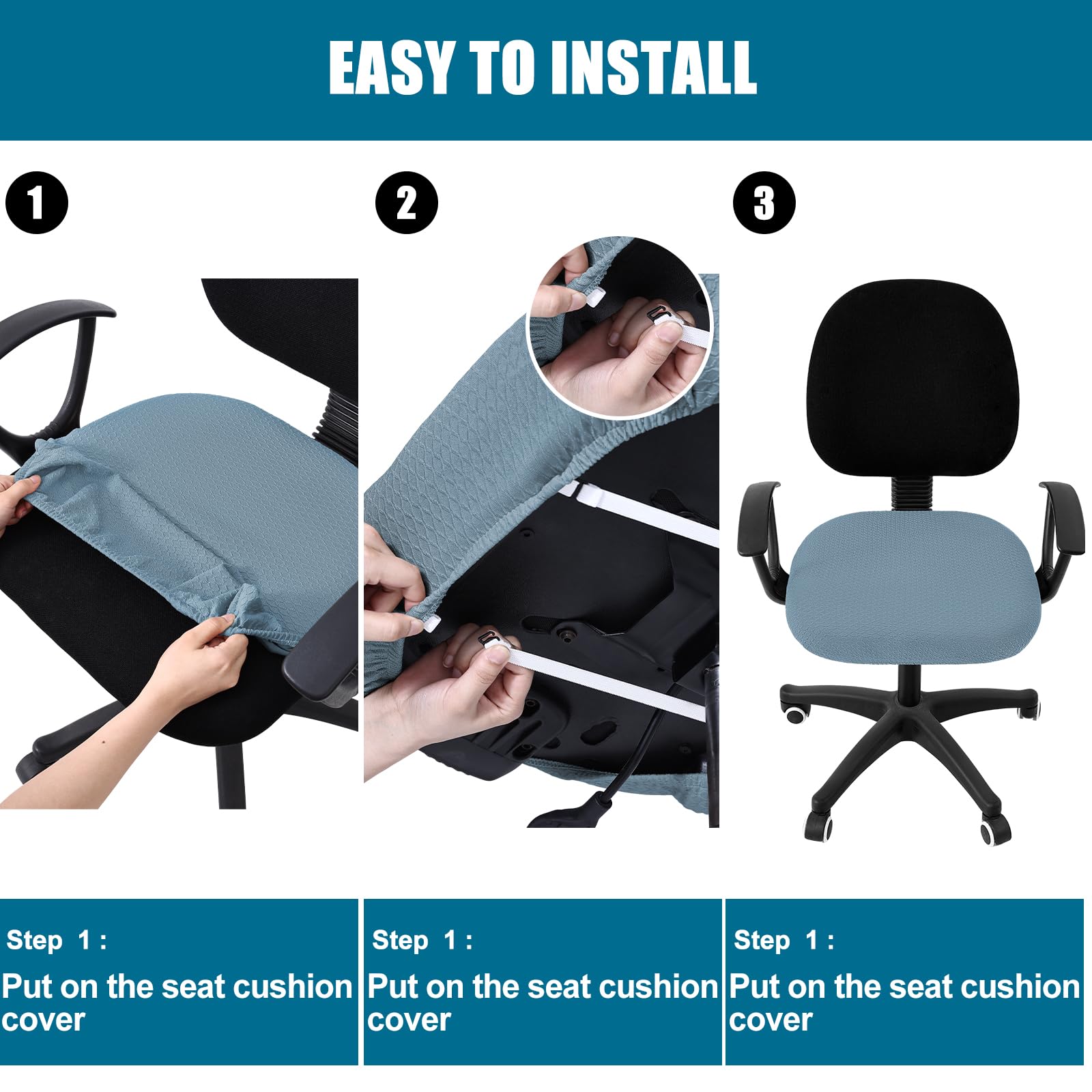 Material: Made of 92% polyester and 8% spandex, stretches to fit most office chairs easily. Equipped with elastic band, easy to fit and anti-slip, wrinkle resistance and reusable.