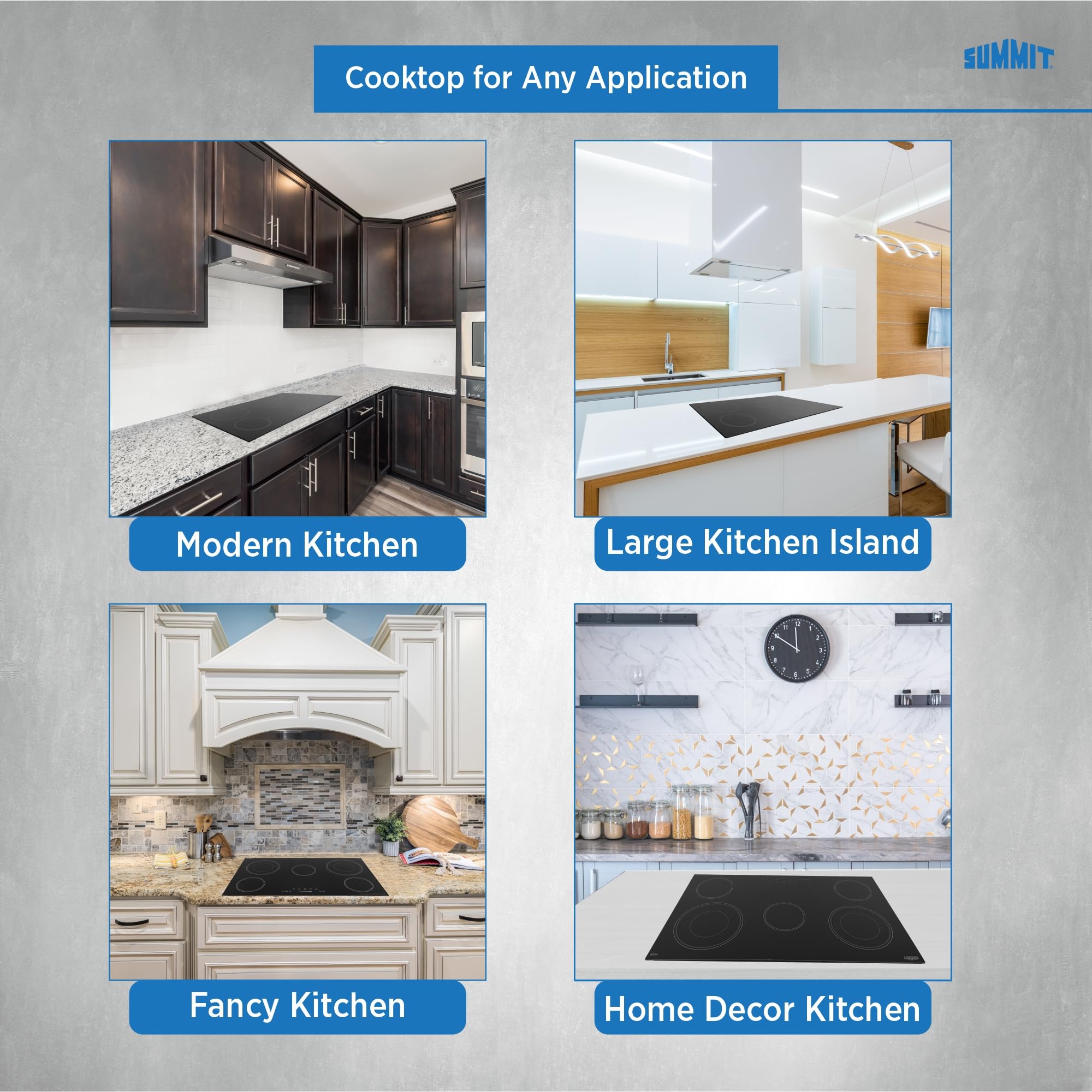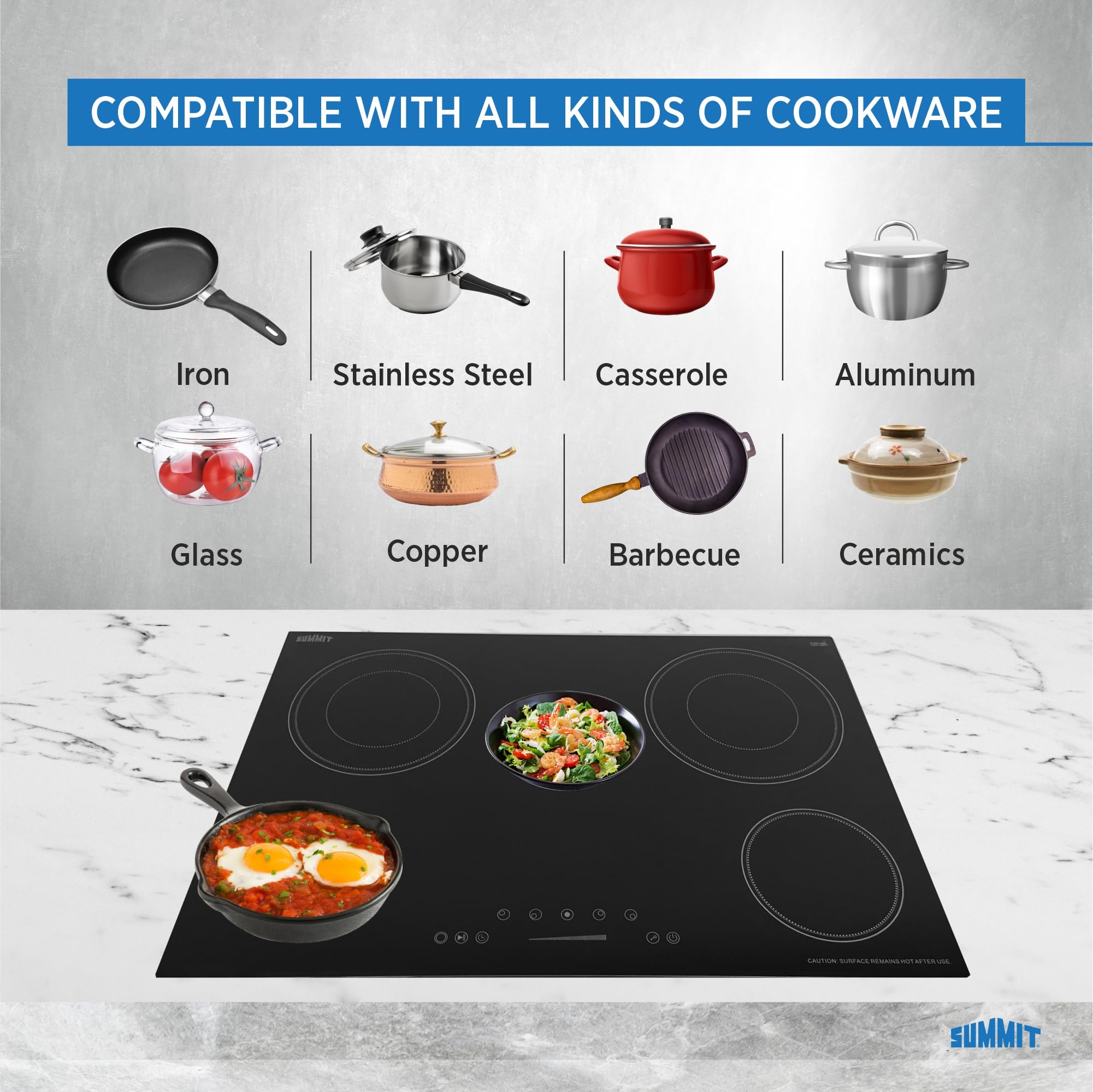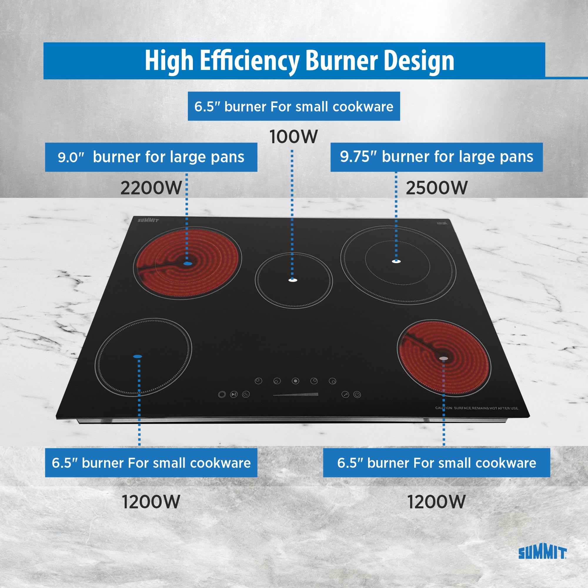 Perfect power you need for your kitchen: This 230V electric cooktop includes two extra large dual ring elements, a 2200W 9" element and a 2500W 9 3/4", which allow you to efficiently heat larger items (woks, pots pans) or to switch to an inner 5 1/2" element for smaller items. The 6 1/2" 1200W burners cover standard cooking needs. The center 100W warming zone element lets you keep things warm.