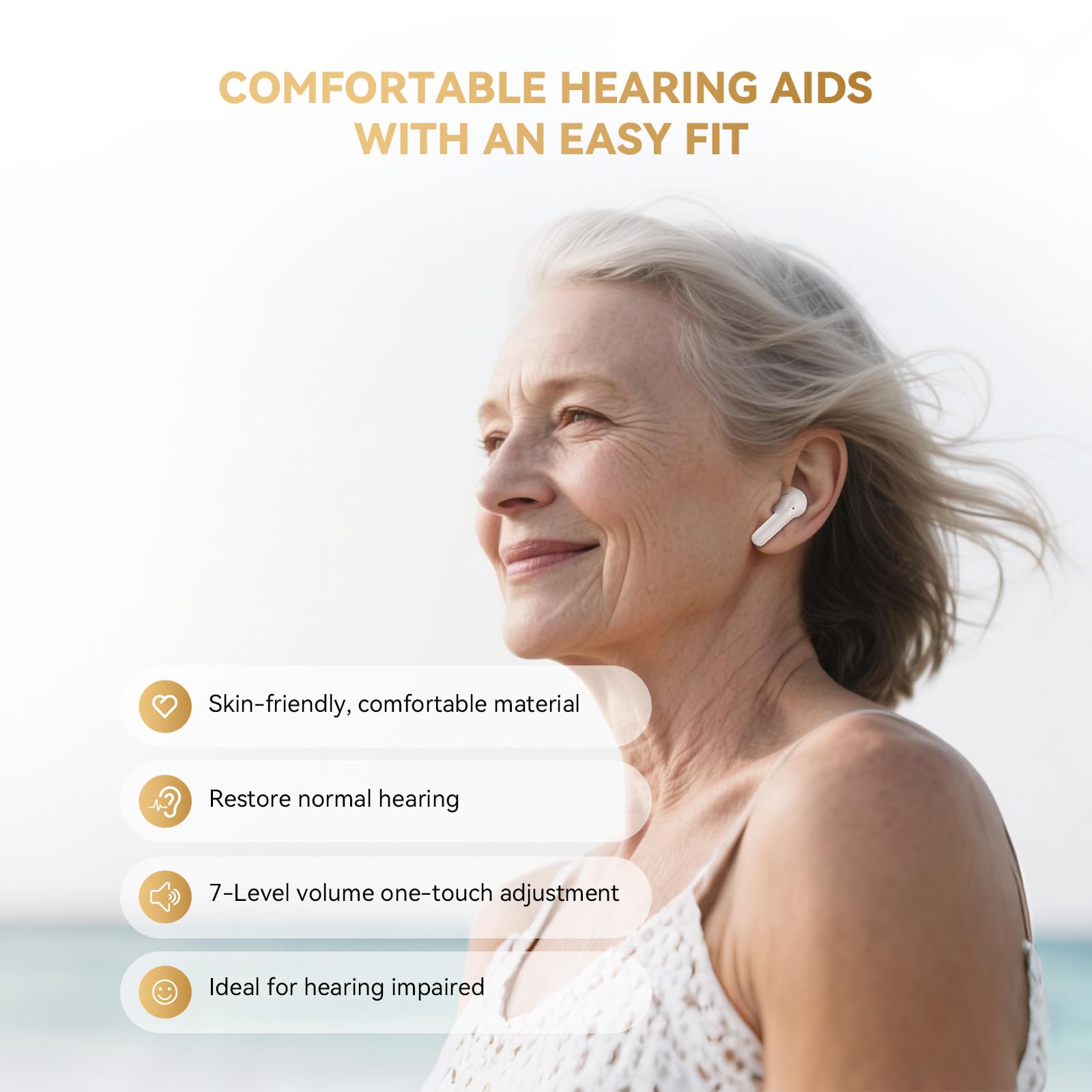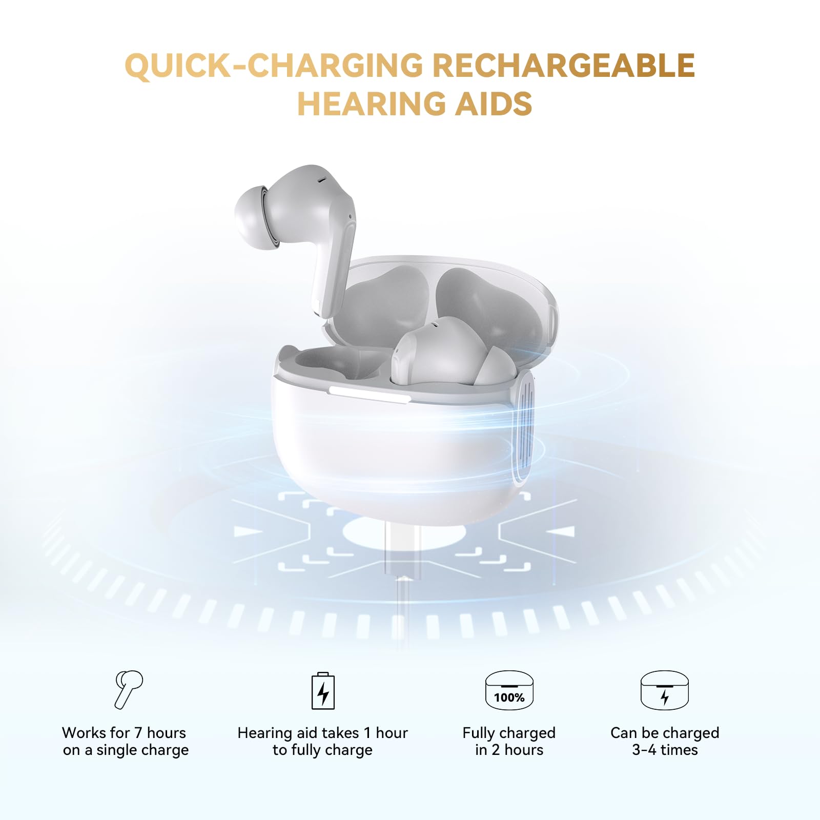 Fast & Long-Lasting Power: Enjoy up to 7 hours of uninterrupted hearing aid use on a single charge(hearing aids takes 1 hour to fully charge in the charging case)—no battery swaps needed. The sleek charging case fully recharges your devices in just 2 hours, giving you portable power wherever you go. Stay powered up effortlessly, anytime, anywhere.