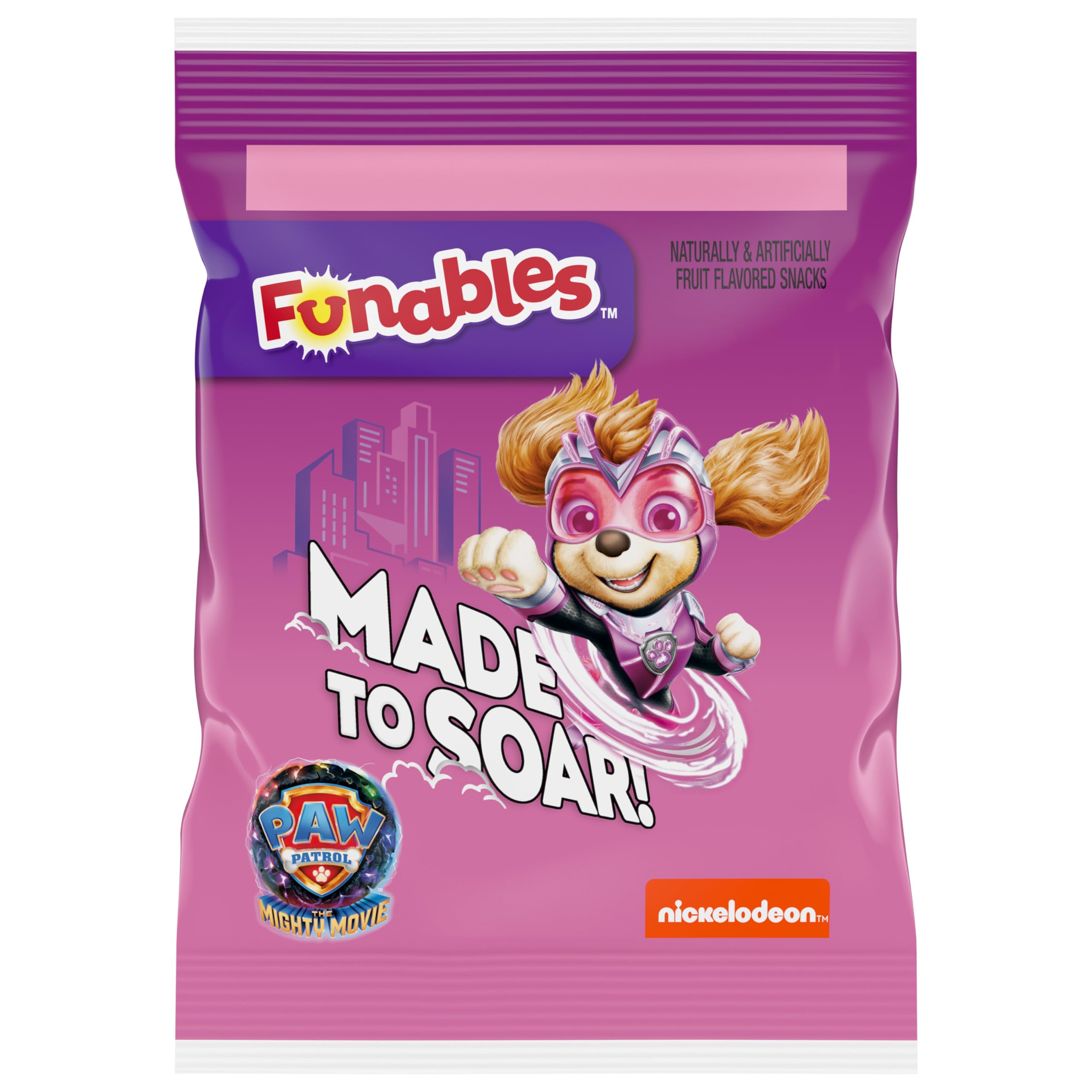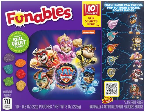 No hunger is too big, and no snack is too small for Funables fruit flavored snacks featuring PAW Patrol rescue pup characters from Nickelodeon Spin Master. Each box of snacks includes an assortment of ten individually wrapped 0.8 packs of fruity snacks featuring PAW Patrol characters. The cute bags include a delicious variety of flavors and of Ryder’s favorite pup-kicks. These are snack time’s best friend, packing a lot of fruity bark into every little bite. In addition to being made with 7.1% real fruit puree they're fat free and an excellent source of Vitamin A, C, and E. Is your snack tag blinking? Head to the Lookout! PAW Patrol Funables fruit flavored snacks in individual packs are ready to report for snack duty. Funables PAW Patrol fruit flavored snacks are part of the Funables fruity snacks range that brings you flavor-packed fun. In vibrant, fruity flavors, these fruity snacks are ideal for road trips, going to the movies or giving as a gift to your favorite people. Have fun and eat it too with Funables fruit flavored snacks. Convenient for everyone, Funables makes snacking easy at any time and anywhere.