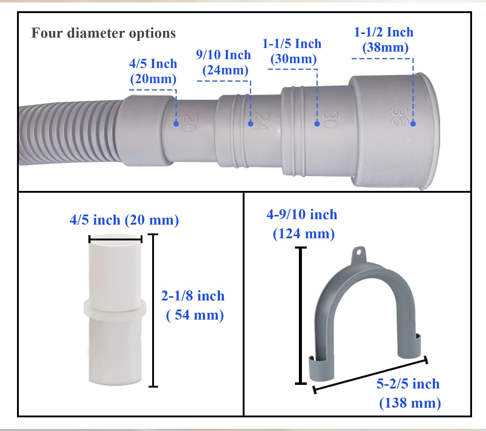 【Universal Fit】 Compatible with most front-load/top-load washers, dishwashers & dehumidifiers (LG/Samsung/Whirlpool, etc.). Four inner diameters of 4/5, 9/10, 1-1/5, and 1-1/2 inches can be cut according to actual size,Confirm your original hose size before purchase!