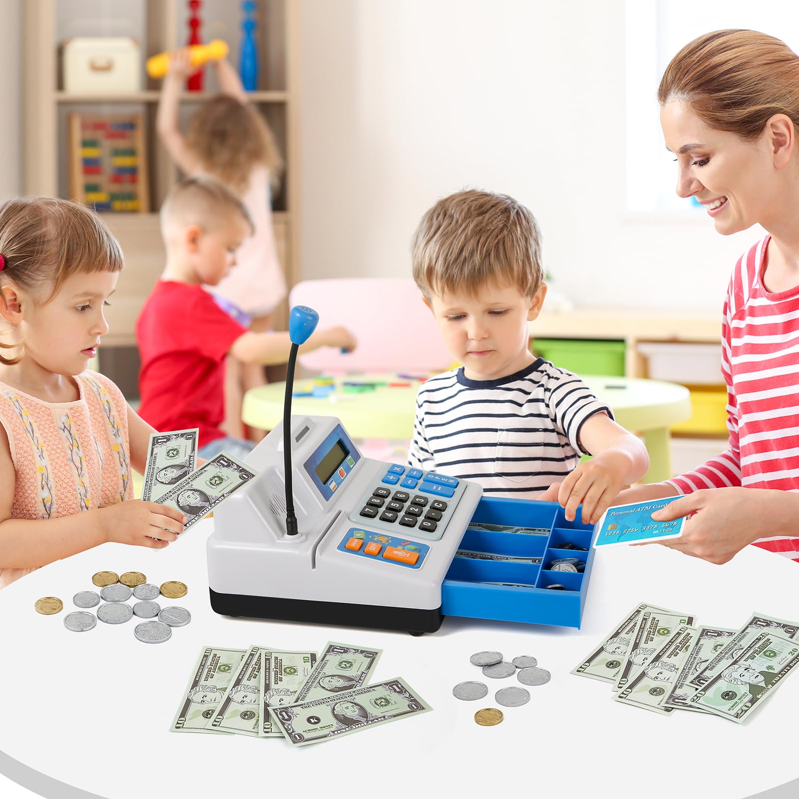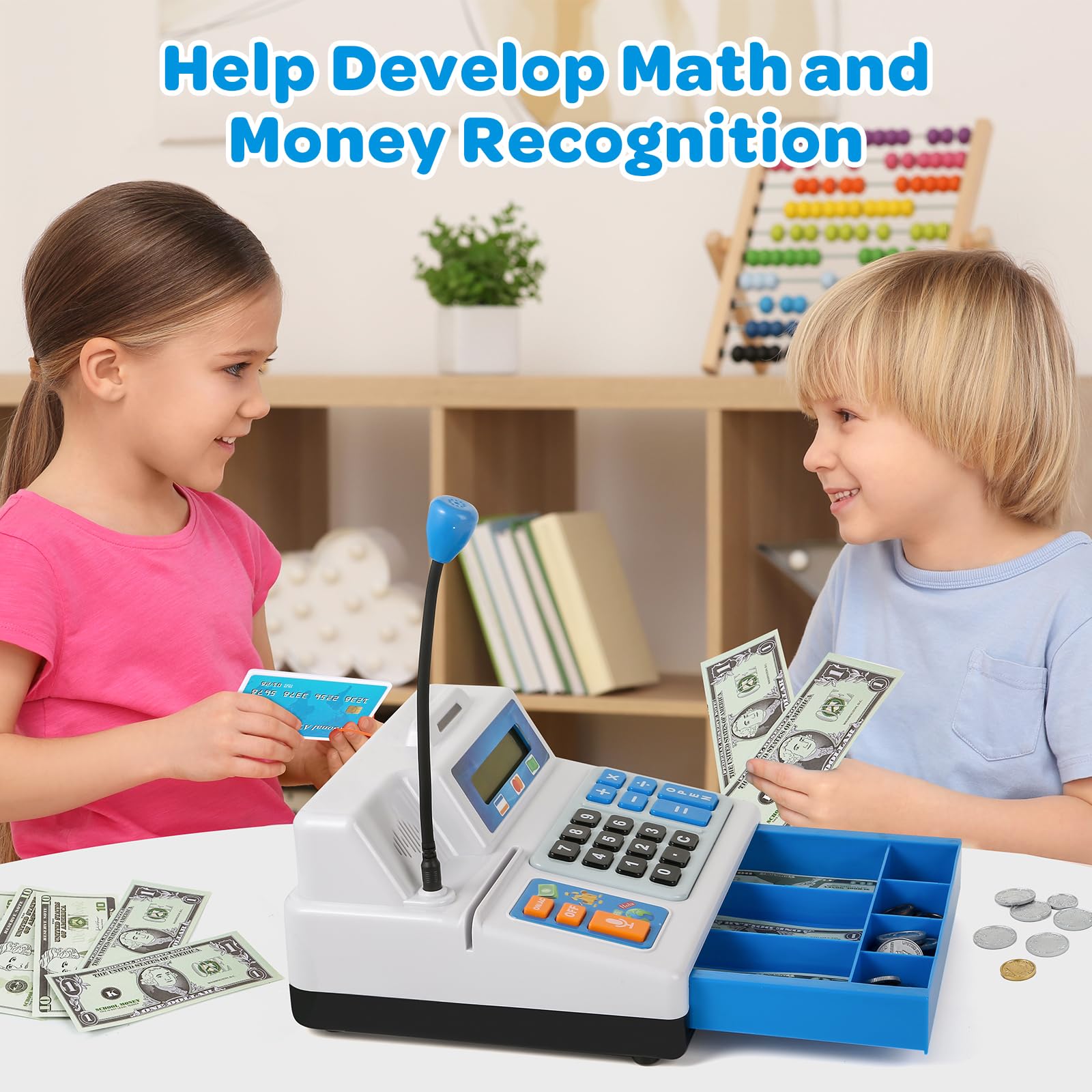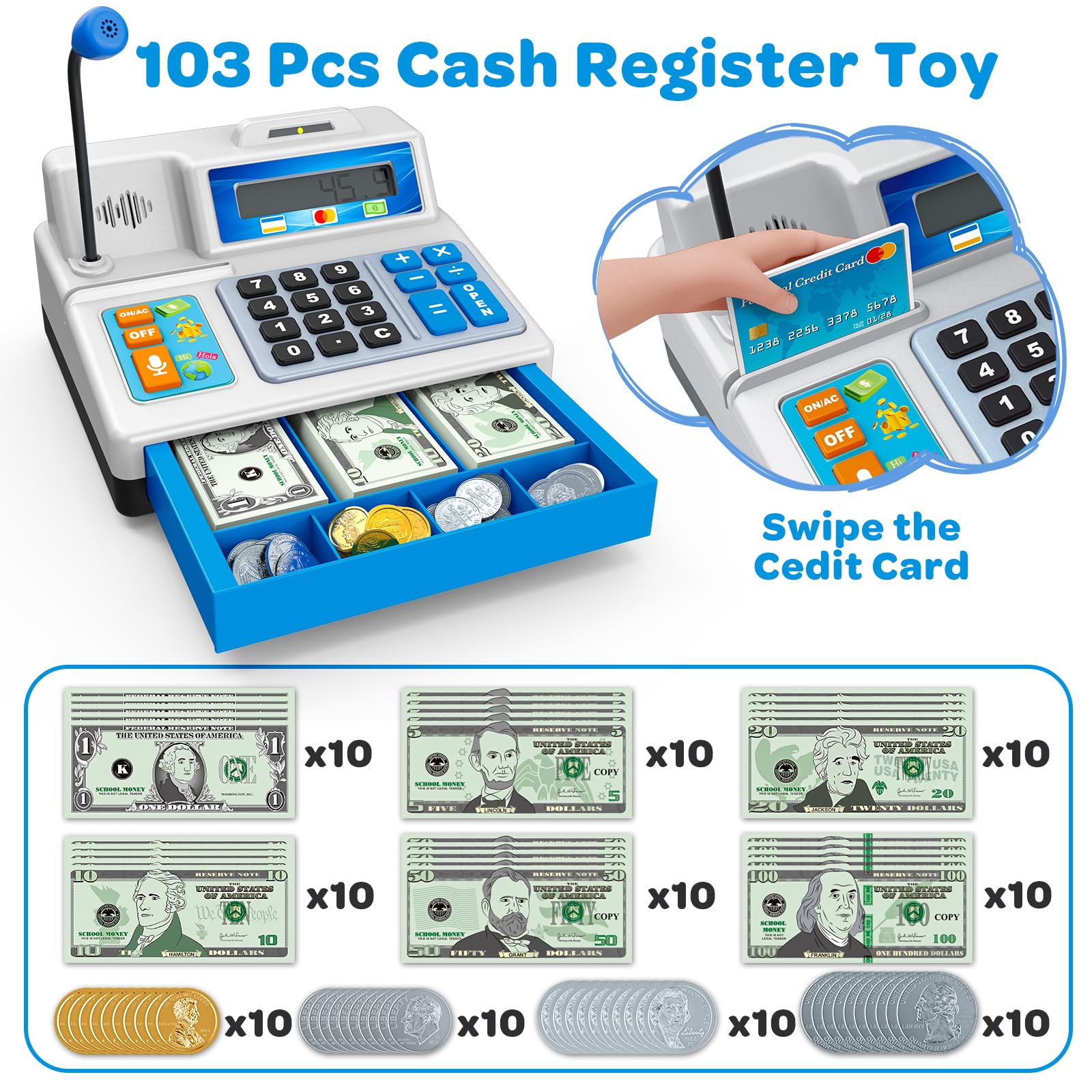Realistic Toy Cash Register - The preschool Learning toy is equipped with paper cash and plastic coins. This cash register toy for kids can make learning numbers and counting skills more fun. In addition, this kids' cash register is uniquely designed, and the drawer makes a cha-ching sound when it is opened, just like a real cash register.