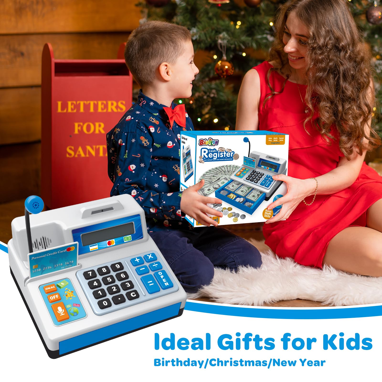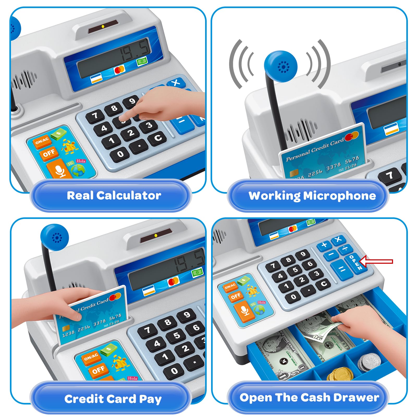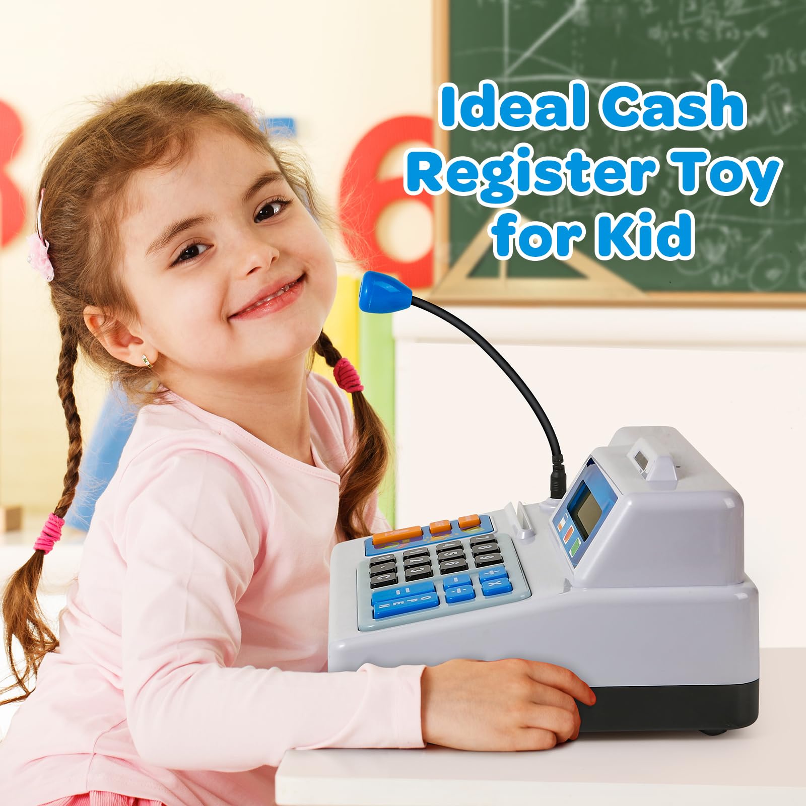 Realistic Toy Cash Register - The preschool Learning toy is equipped with paper cash and plastic coins. This cash register toy for kids can make learning numbers and counting skills more fun. In addition, this kids' cash register is uniquely designed, and the drawer makes a cha-ching sound when it is opened, just like a real cash register.