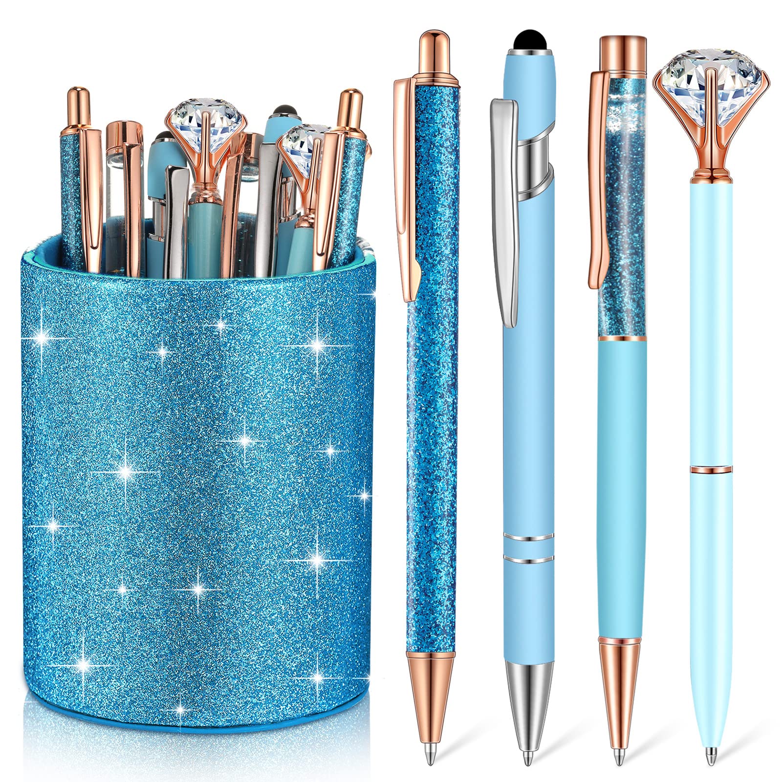 blue Office Accessories Set: the package contains 1 piece of bling blue pen holder for desk and 8 pieces of blue pens in 4 designs, 2 pieces for each design, put them together on your desk to make your desk look stylish and attractive