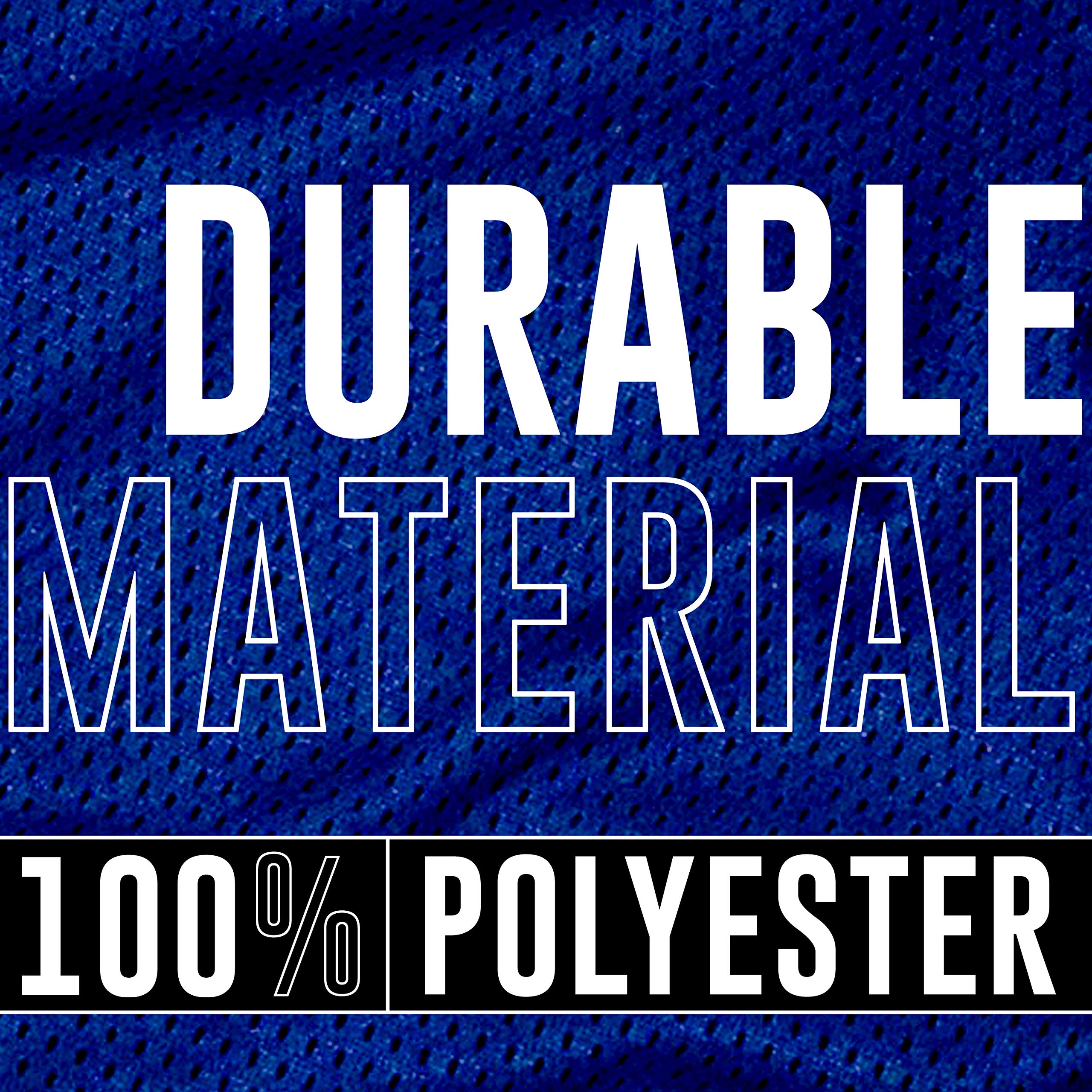 Team jersey is 100% polyester-mesh, team pants are 100% double-knit polyester with elastic waistband and cuffs